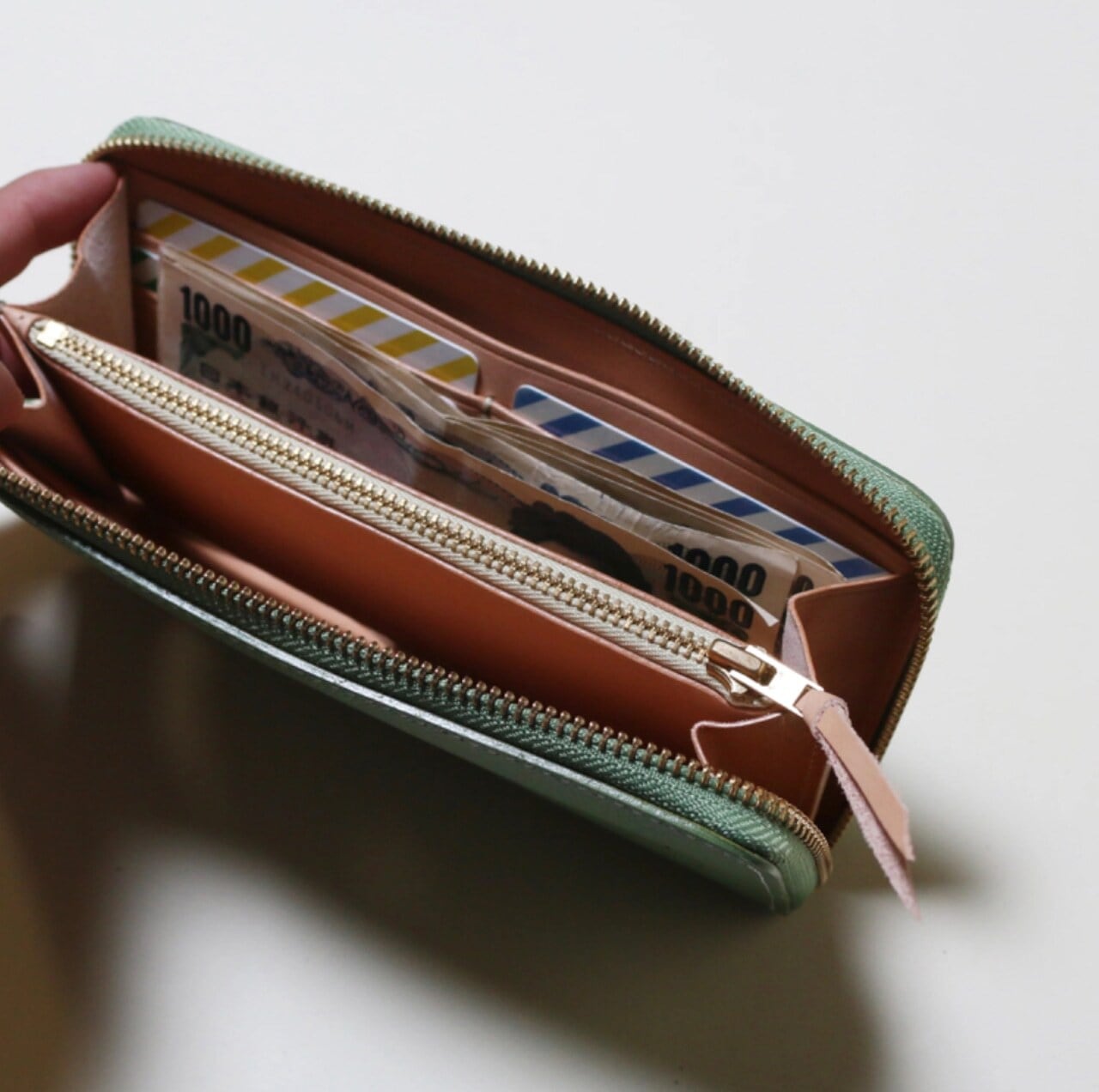 定番的なラウンドファスナータイプのロングウォレットですが、使い勝手を考慮した上で、大きく厚くなり過ぎないようデザインしました。