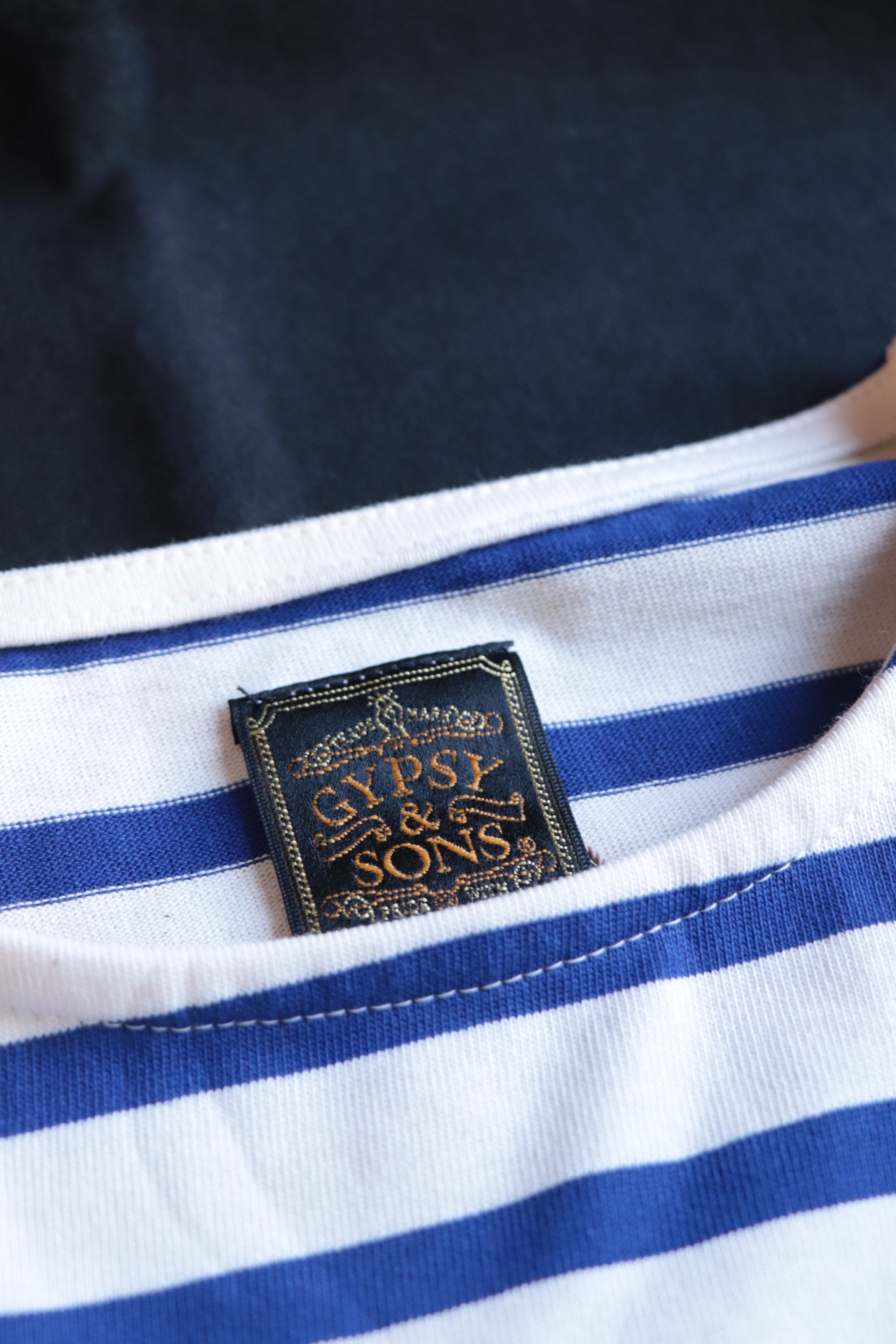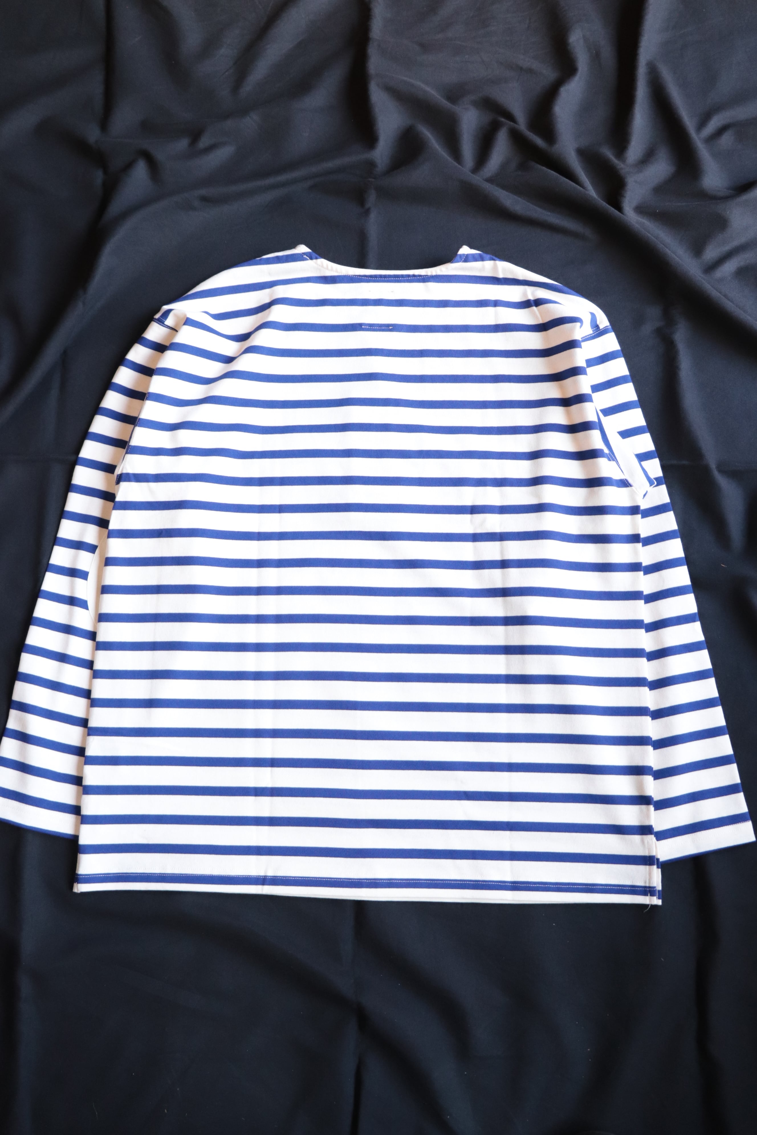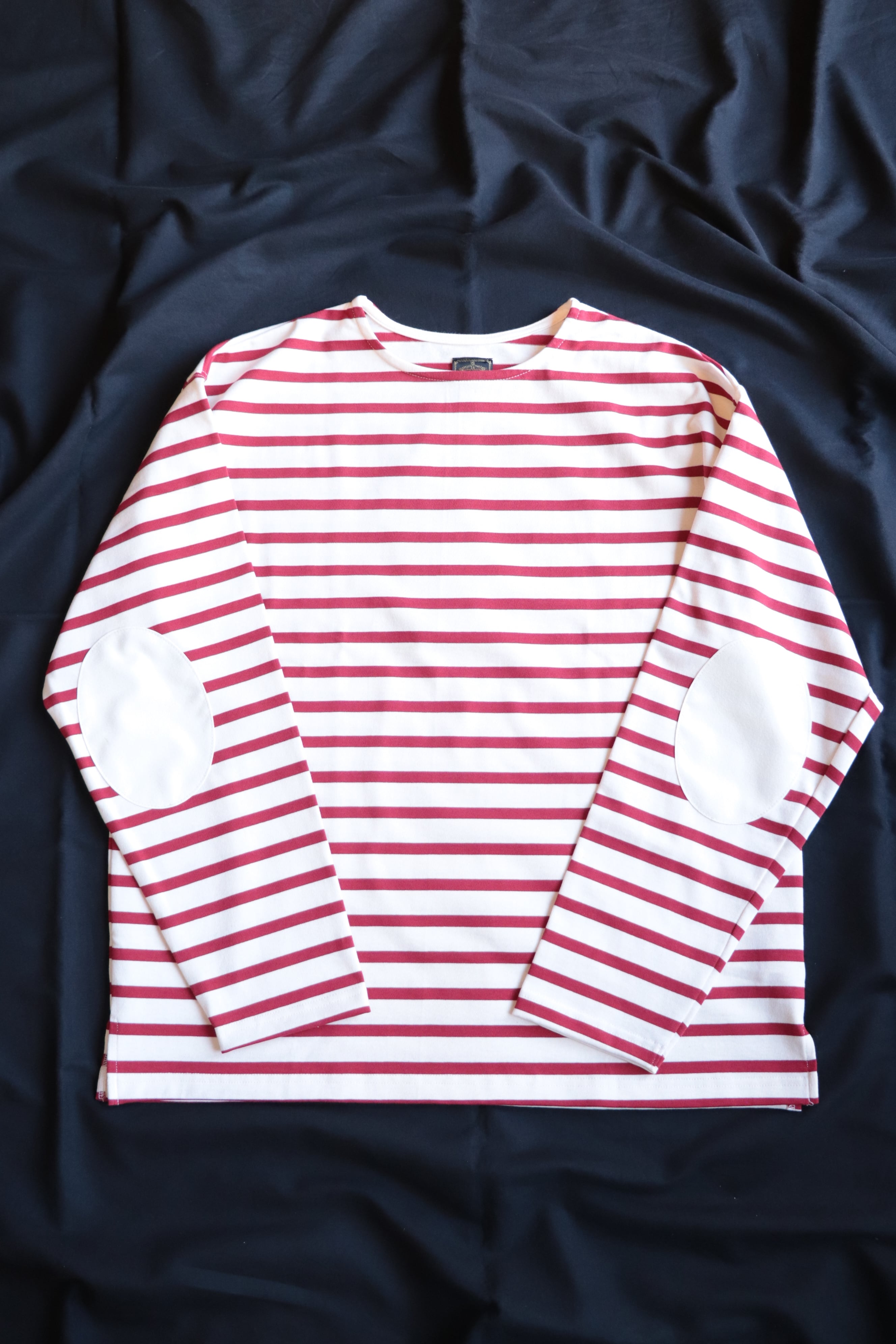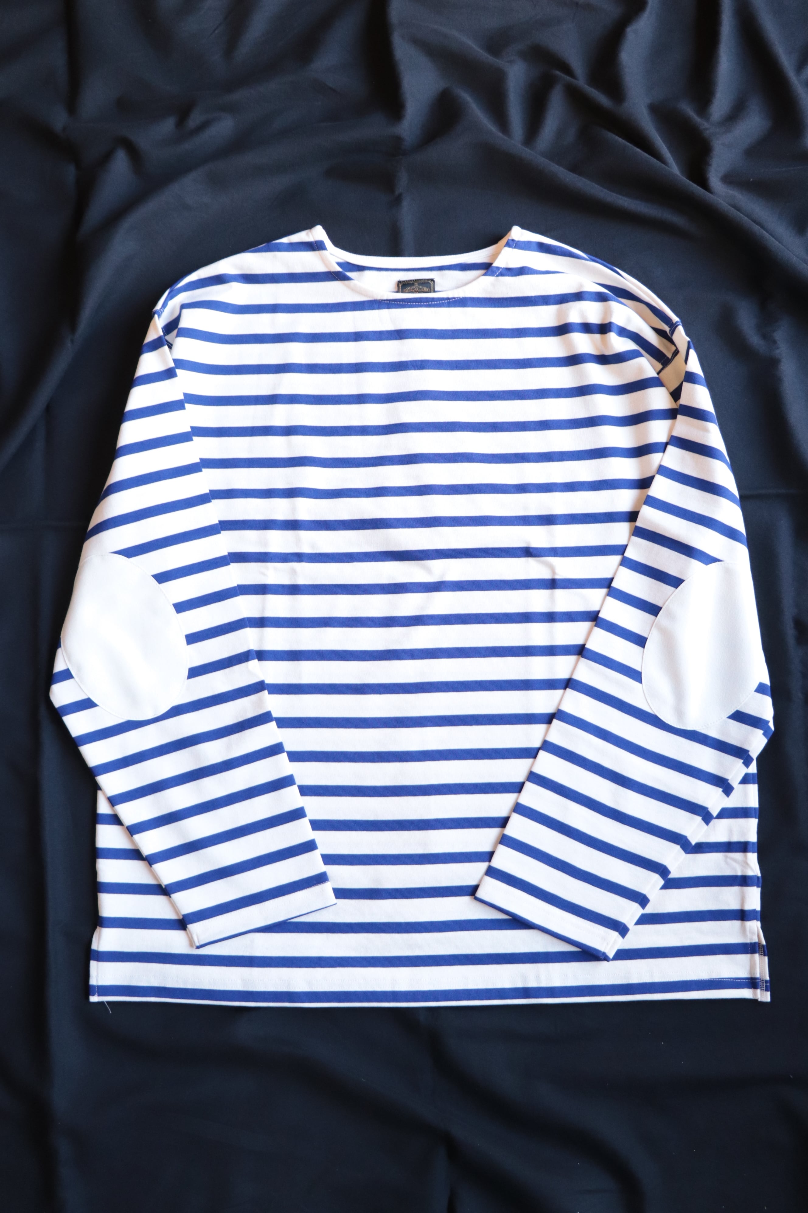 ボートネックが主流のボーダーを丸首でメンズライクに設計した、エルボーパッチがアイコニックな1着。