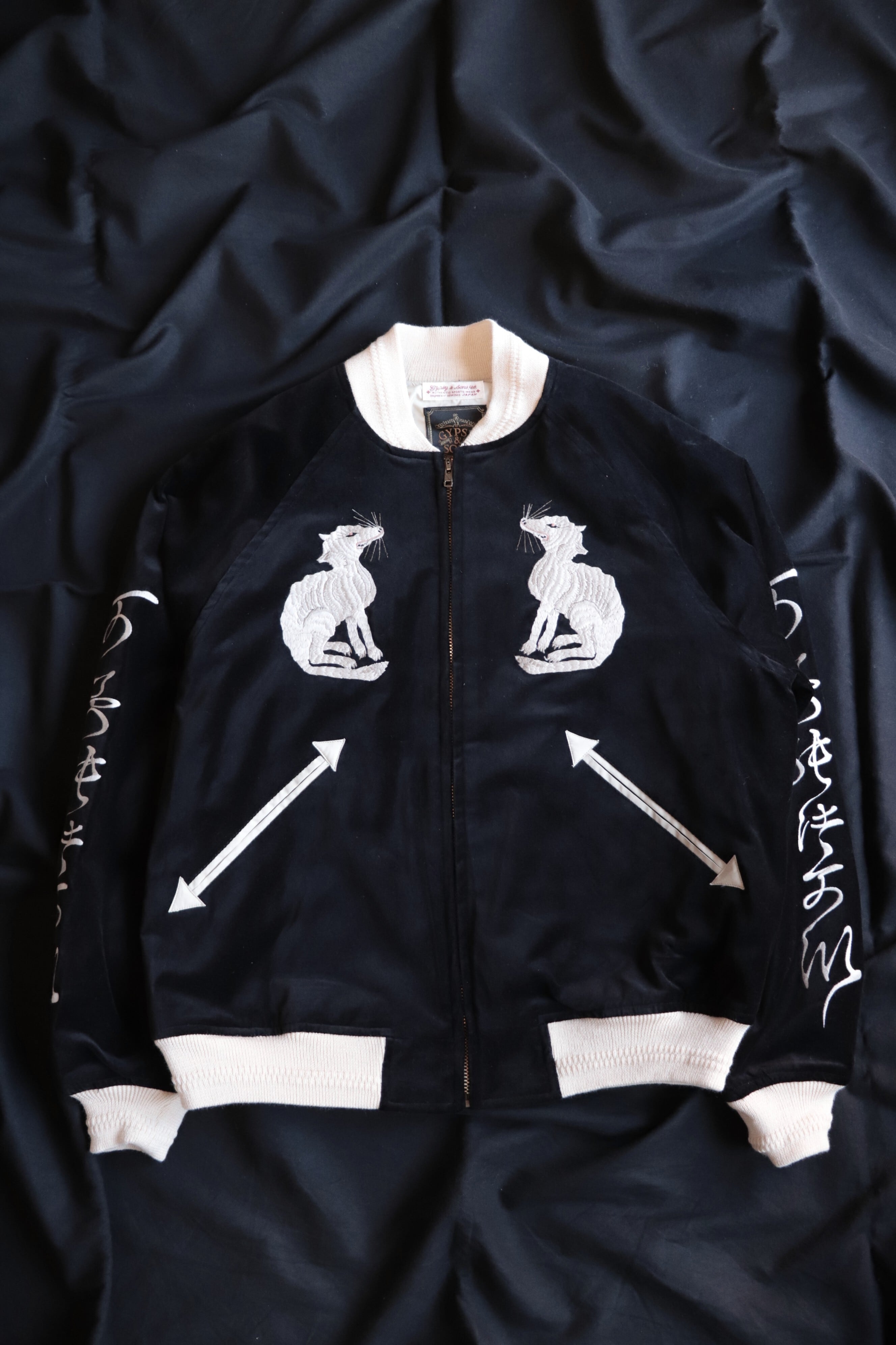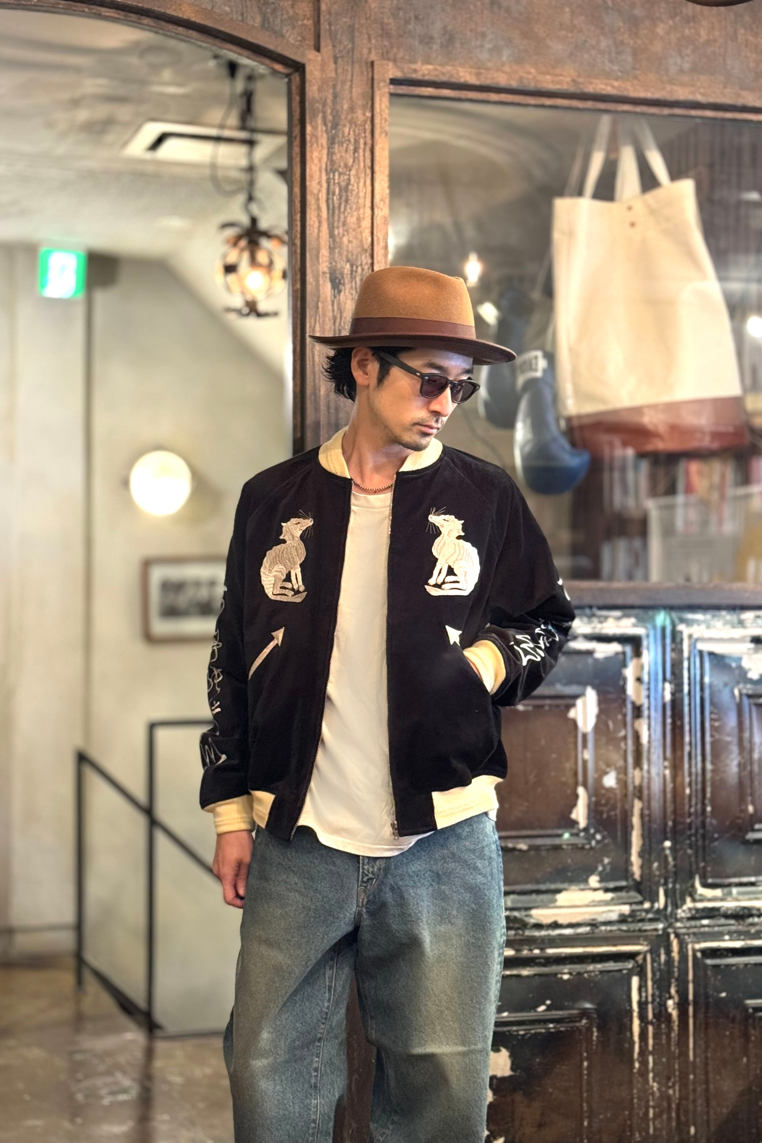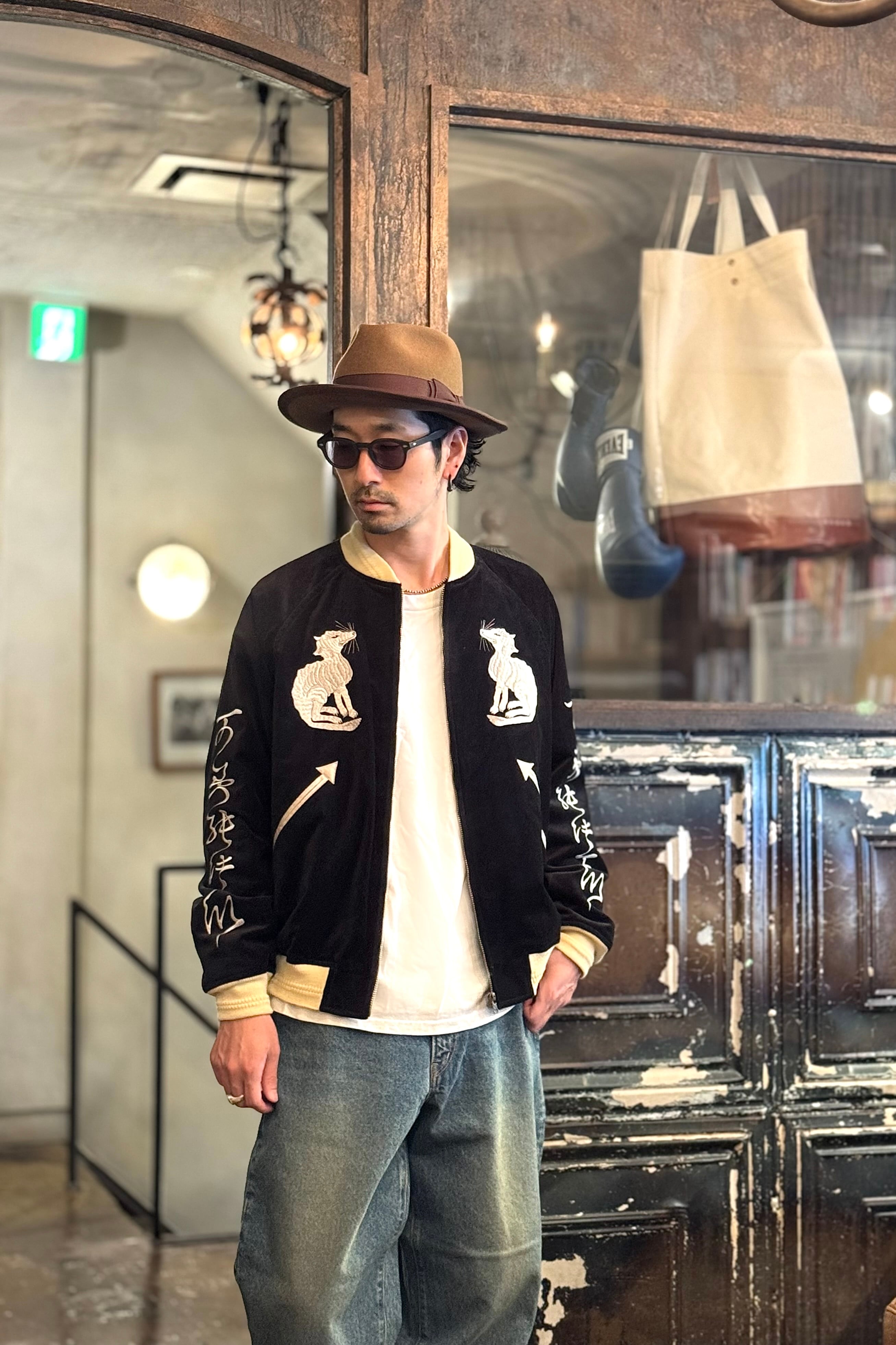 日本神話にも登場する、"神の使い"白狼をモチーフに、50年代別珍スカジャン特有のチープでありながら、存在感のあるスーベニアジャケットに仕上げられています。