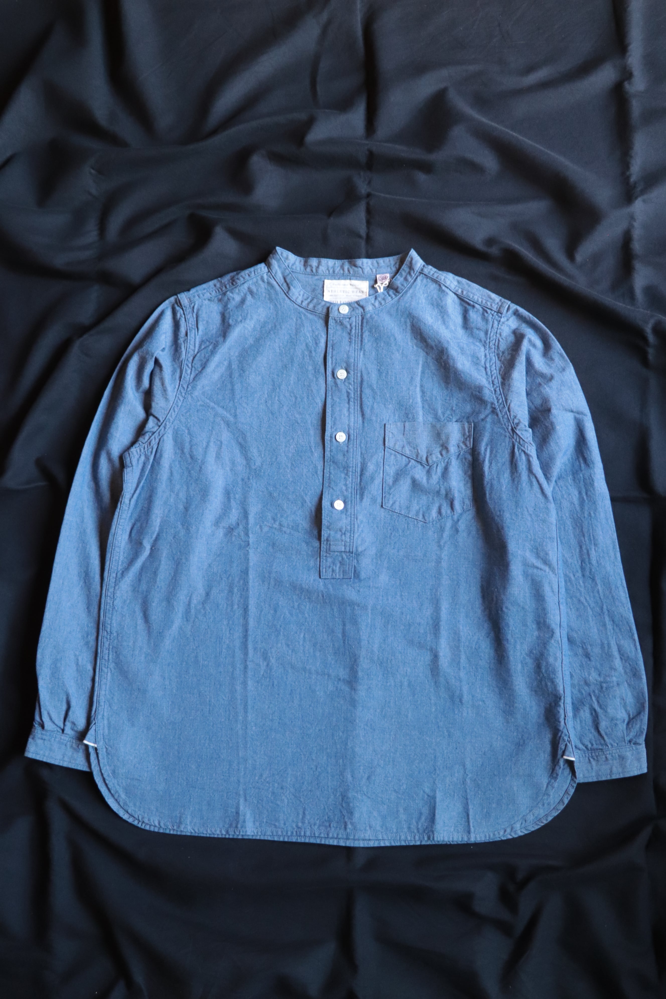 シャンブレー生地を使用した、スタンドカラーのプルオーバーシャツです。