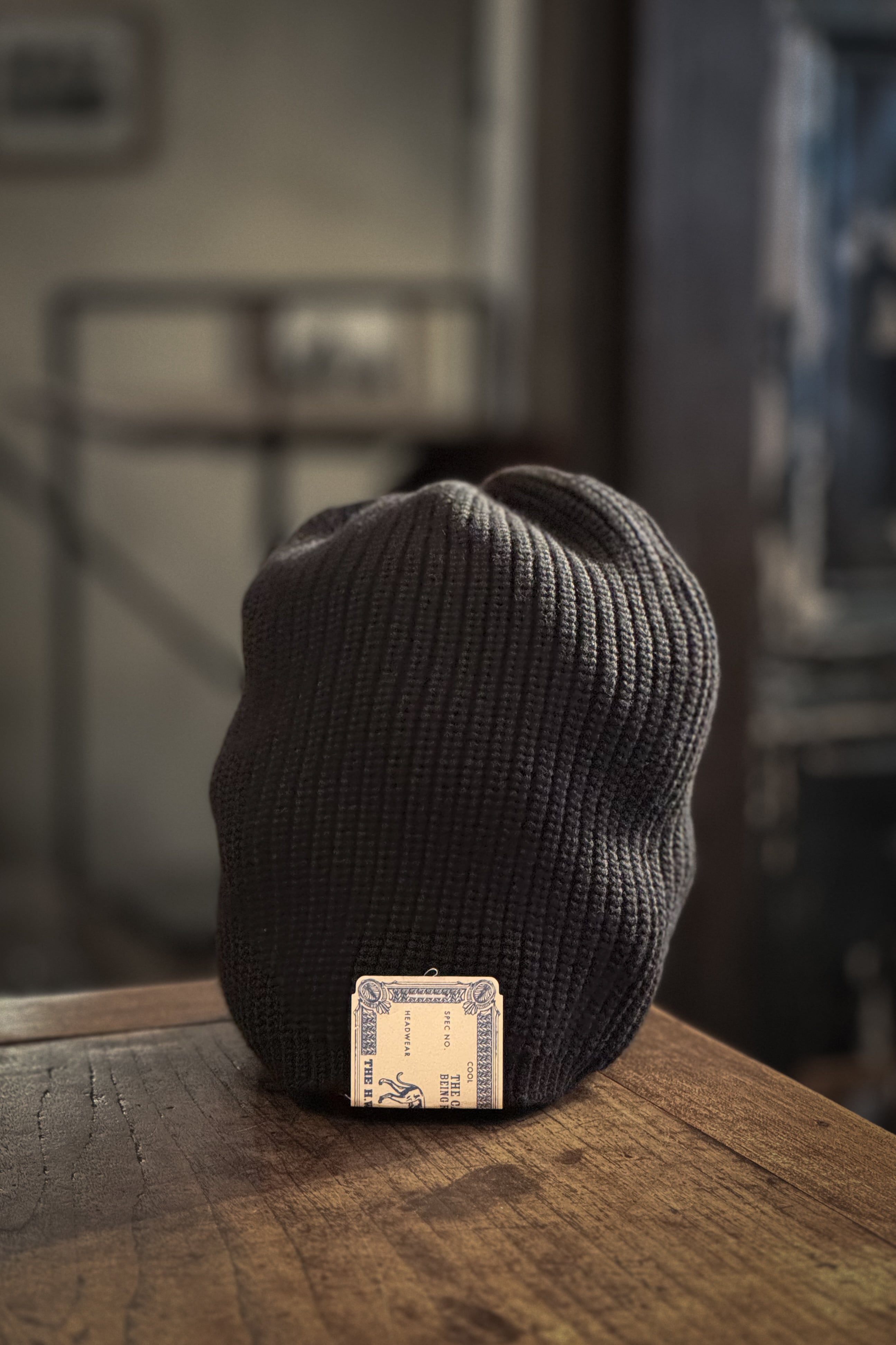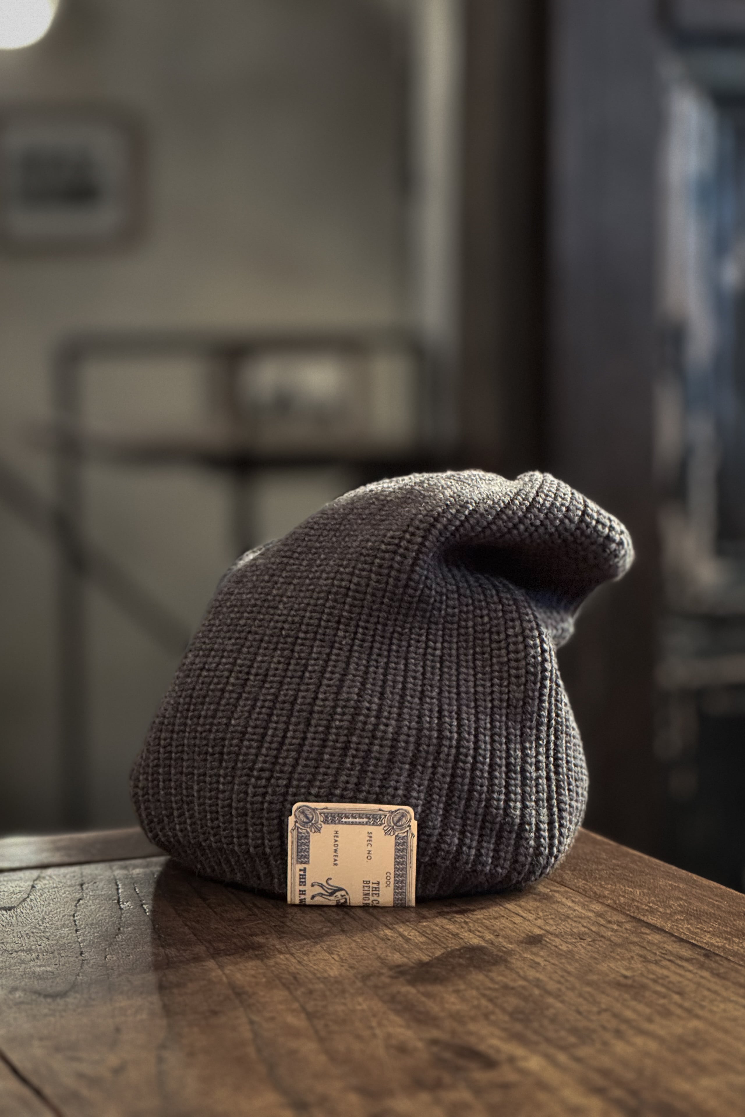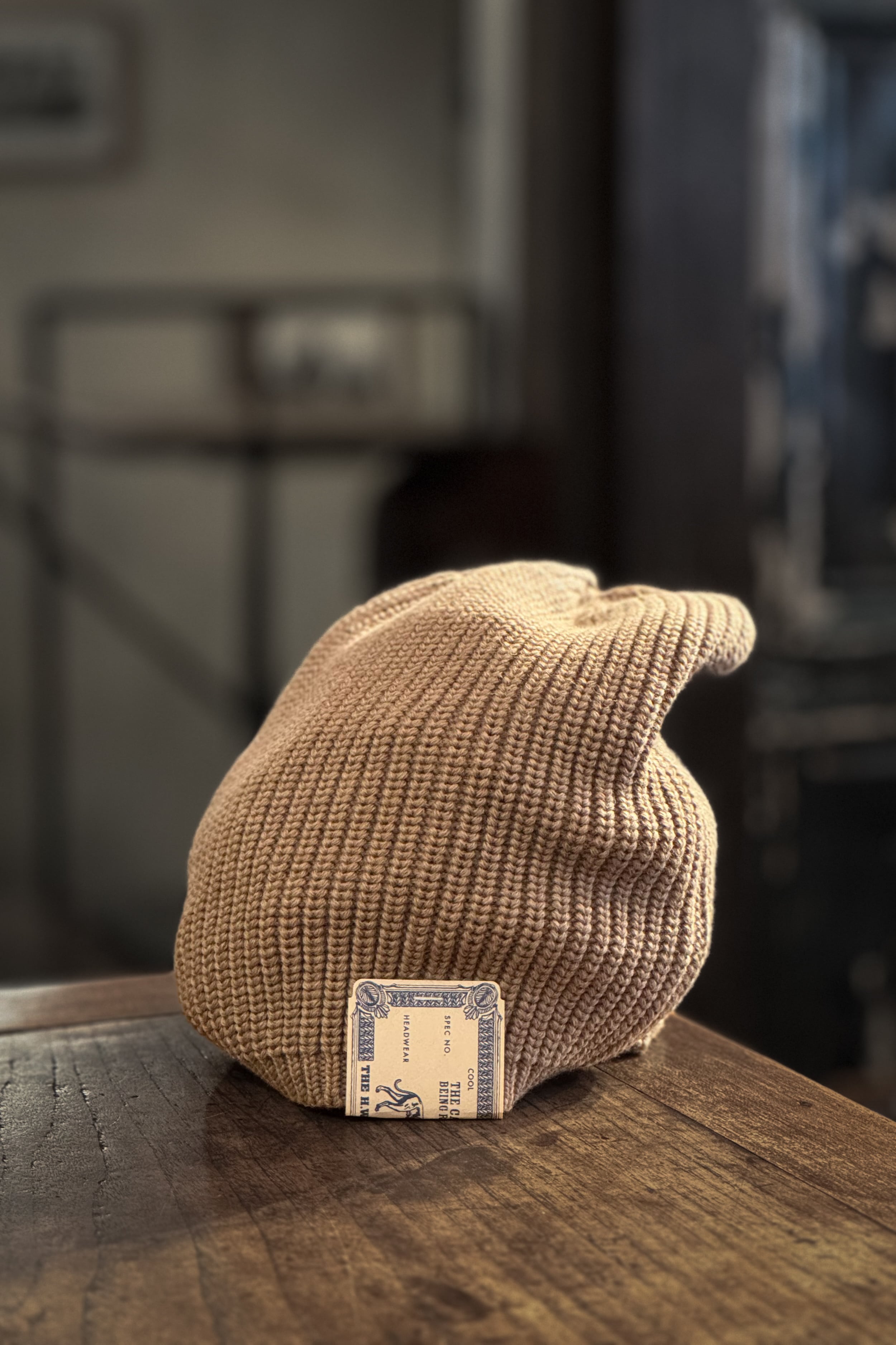 クラウンから被り口まで均一なリブ編みで、天井は絞り留めになっており、深さを生かして後ろに弛ませて被ることが可能です。