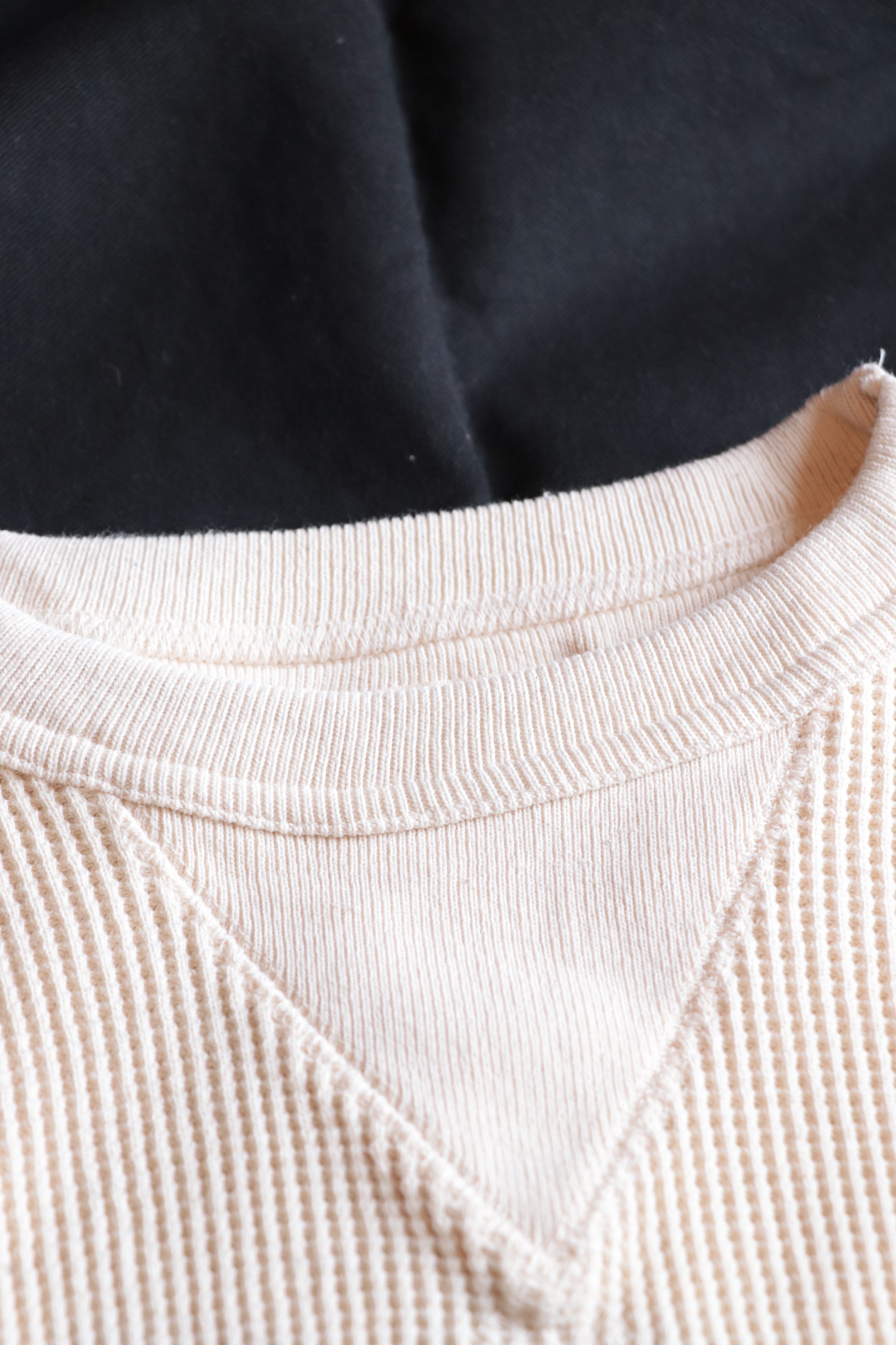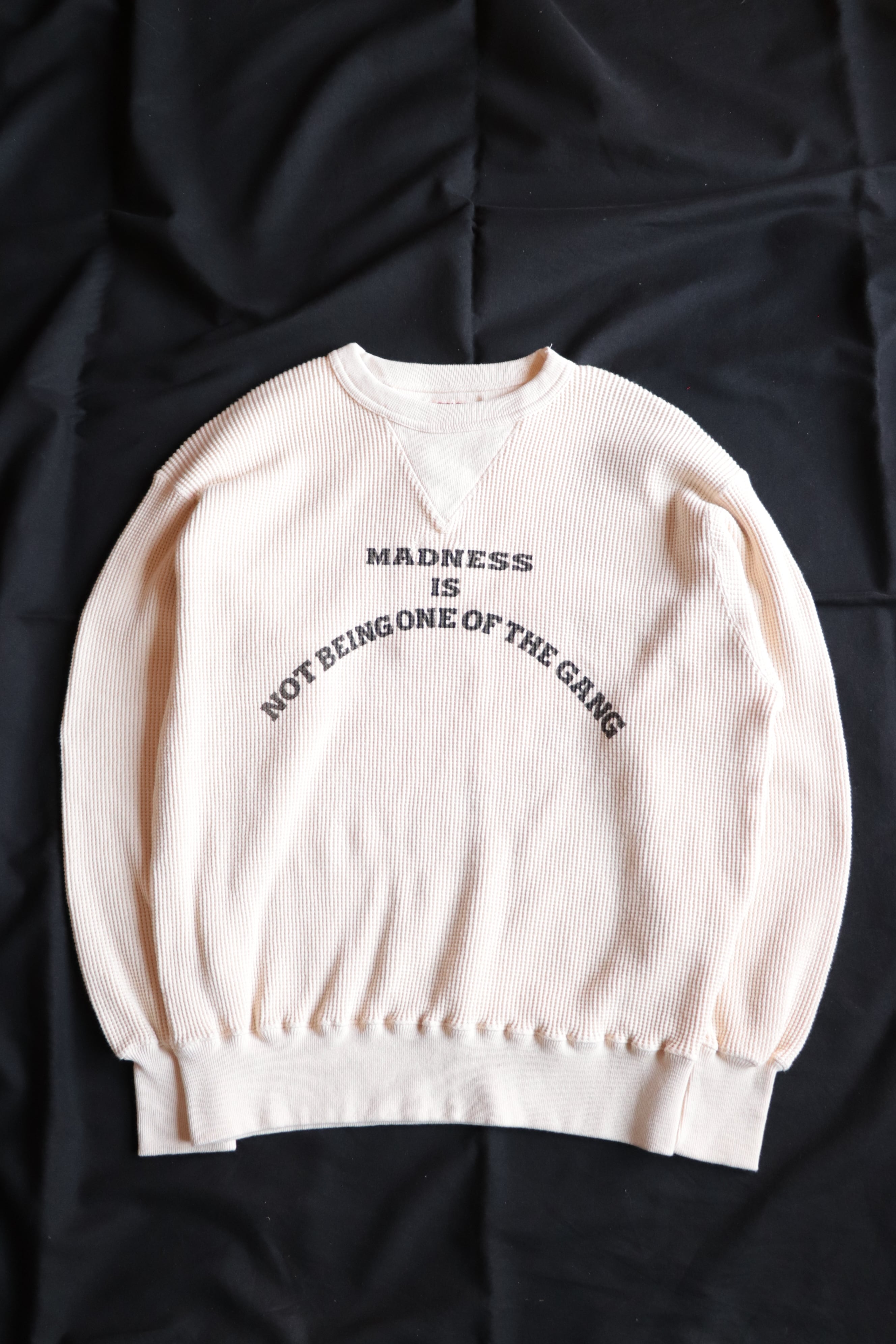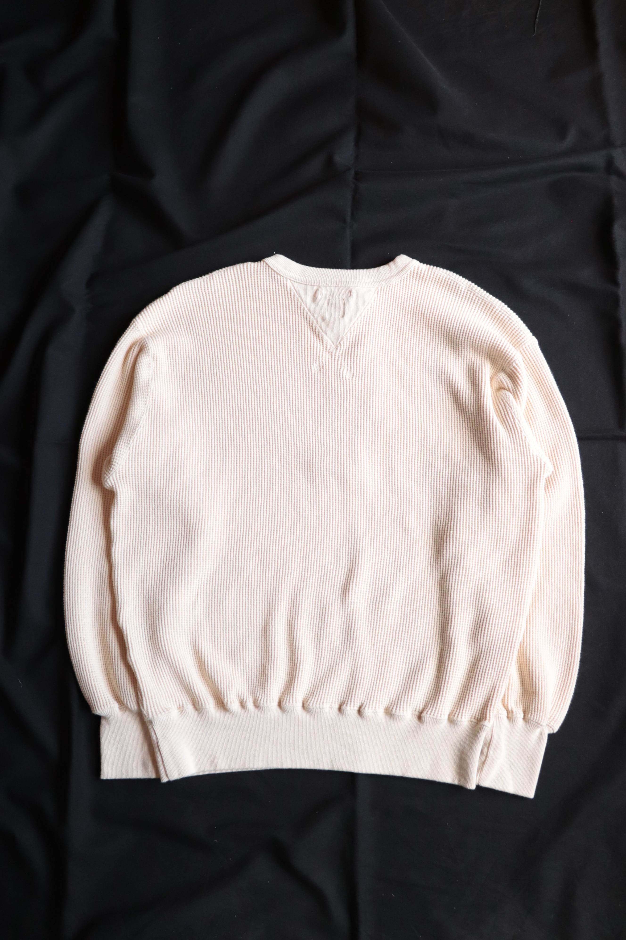 1950年代のヴィンテージスウェットにある、はめ込みVガゼットスウェットをイメージし、ワッフル生地に置き換えて制作されています。