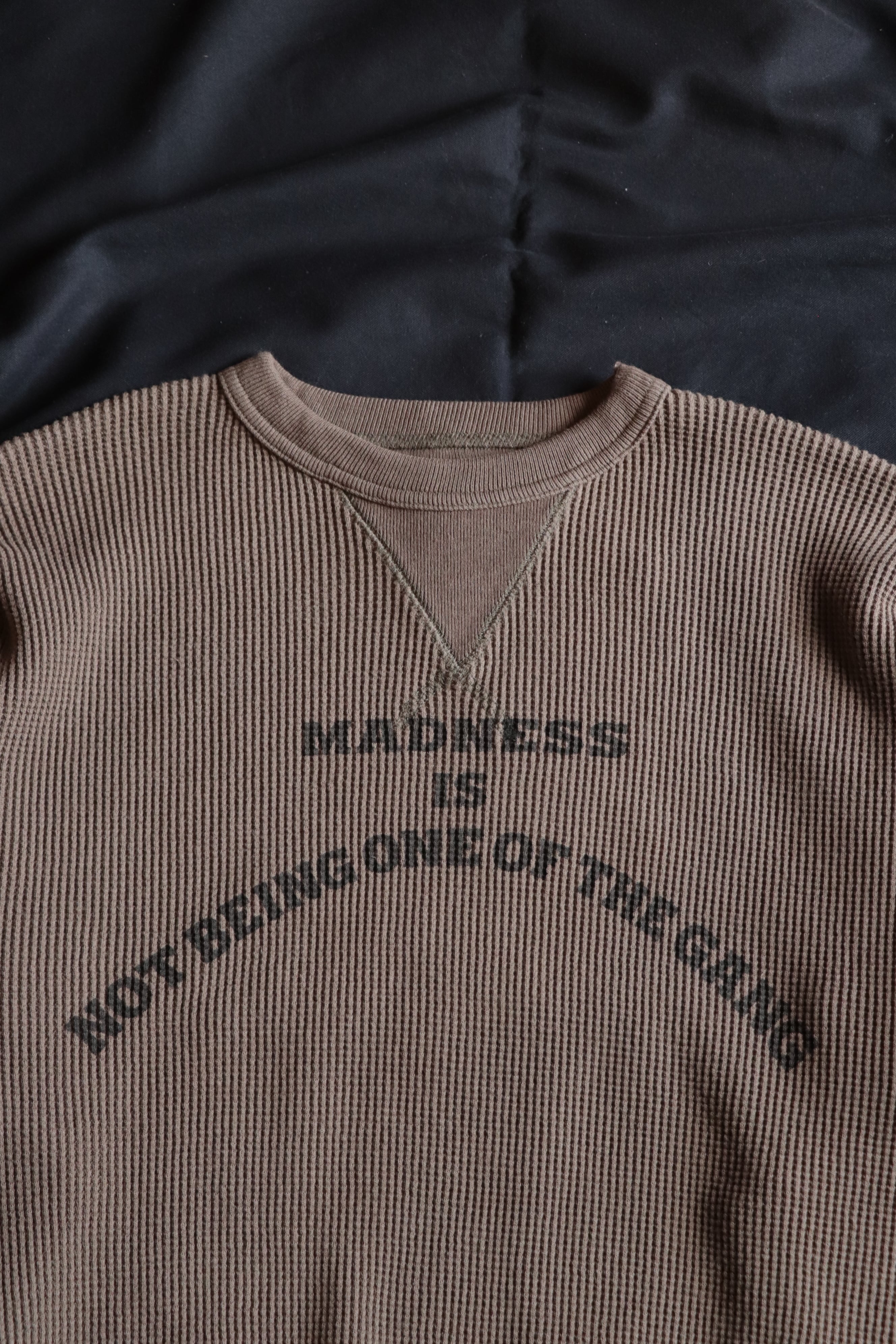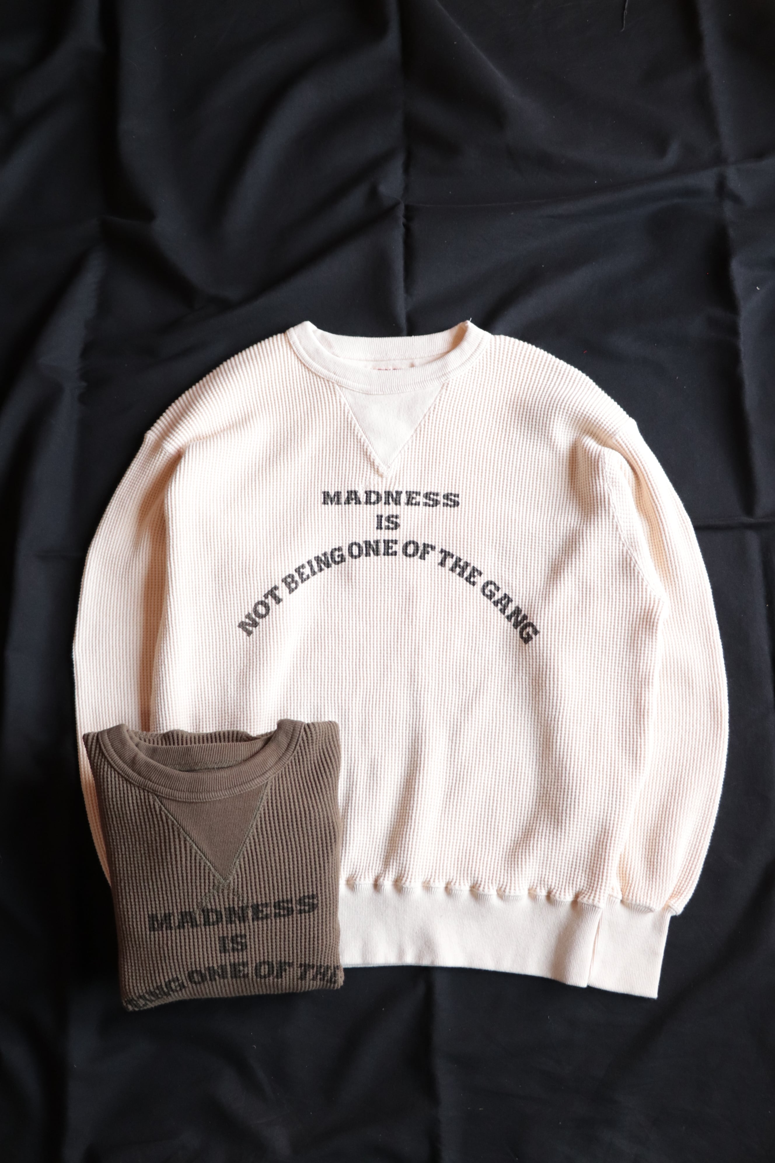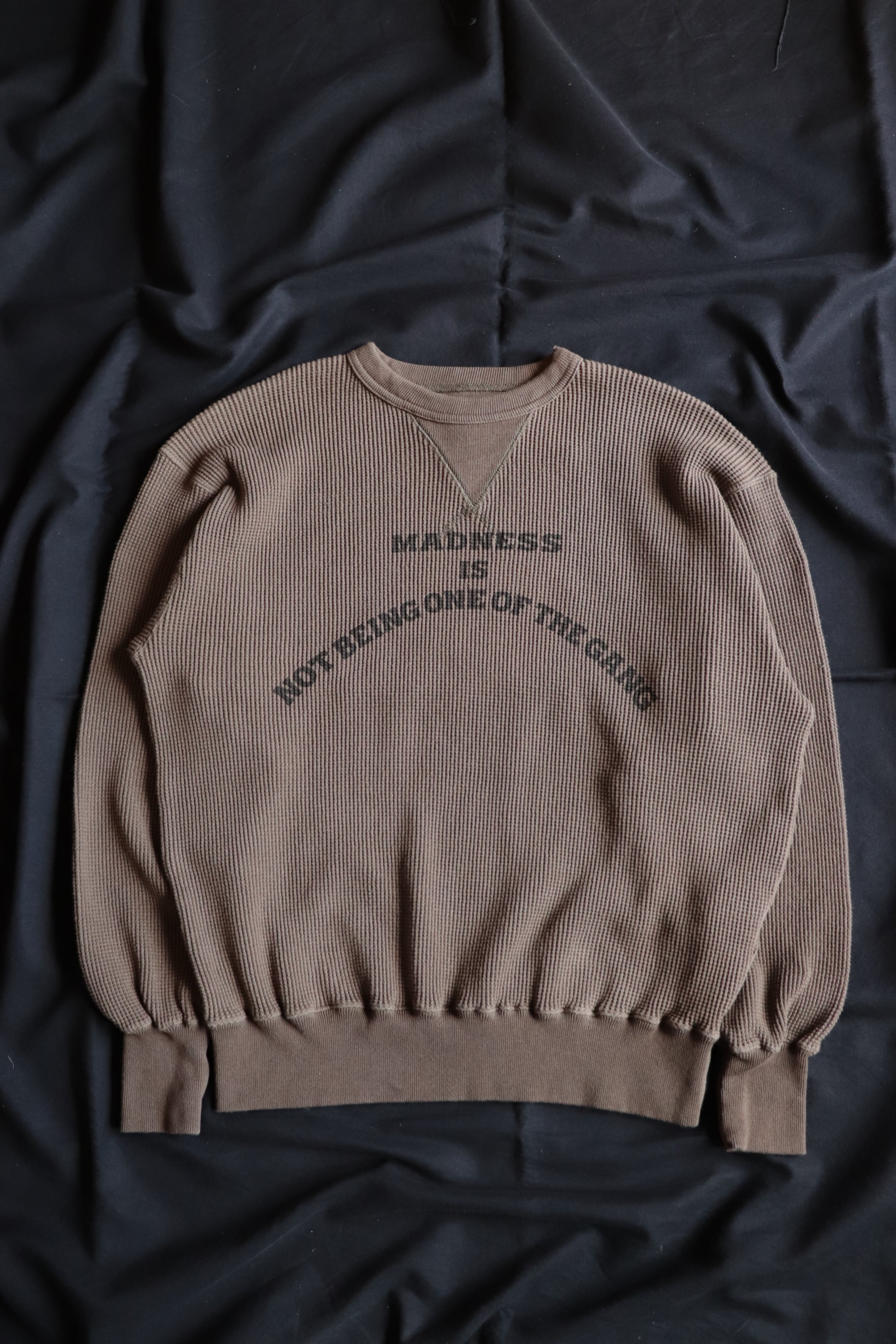 1950年代のヴィンテージスウェットにある、はめ込みVガゼットスウェットをイメージし、ワッフル生地に置き換えて制作されています。