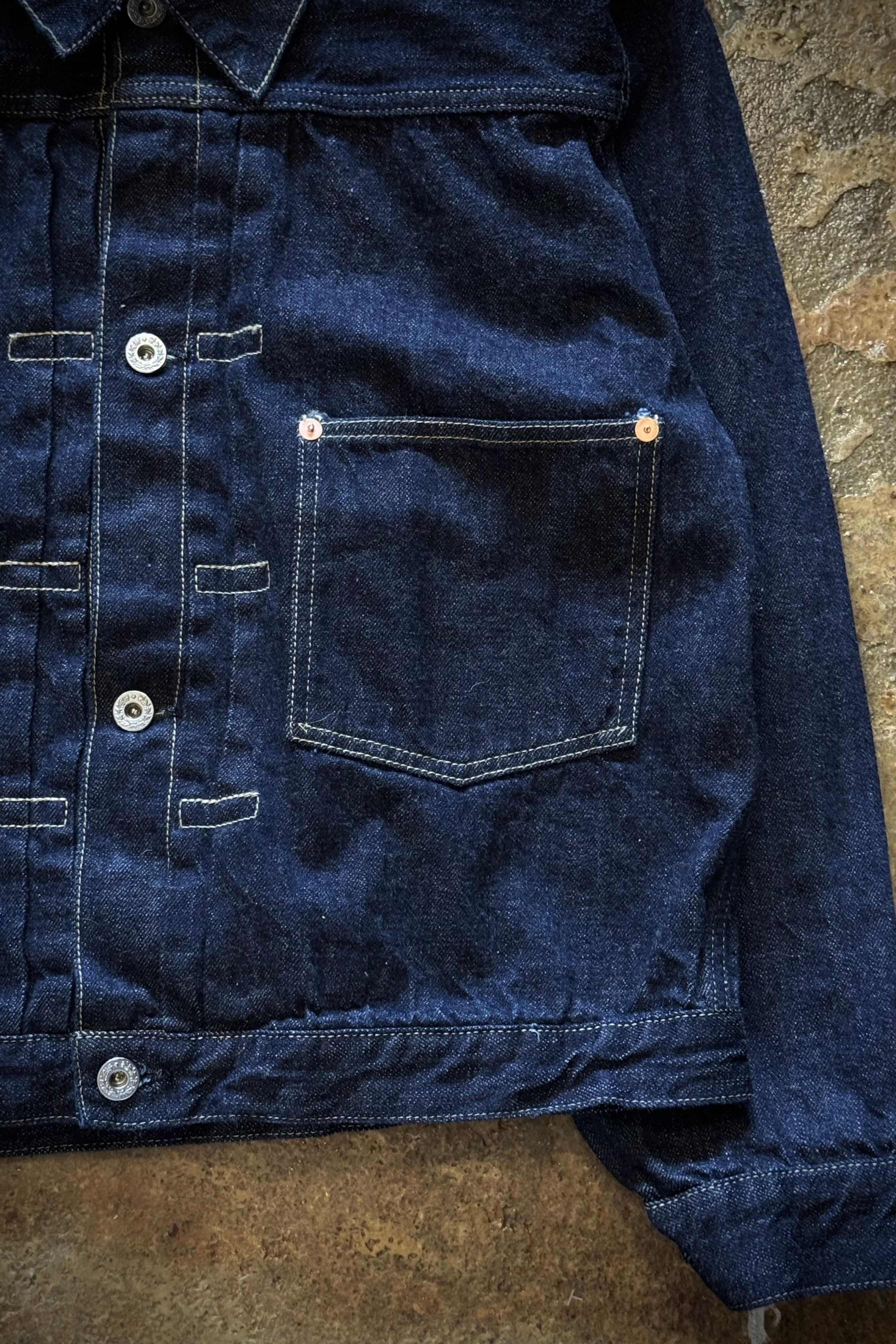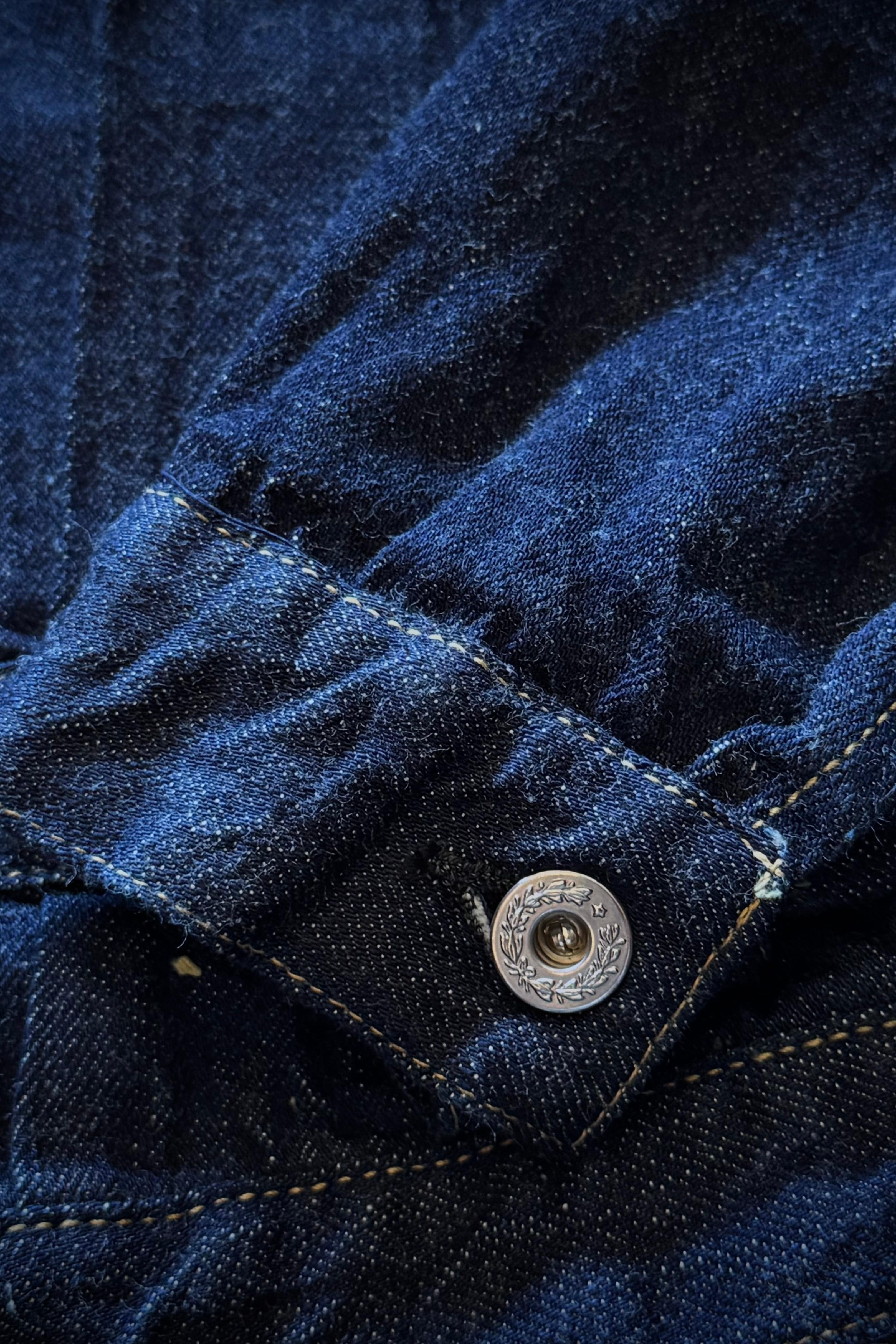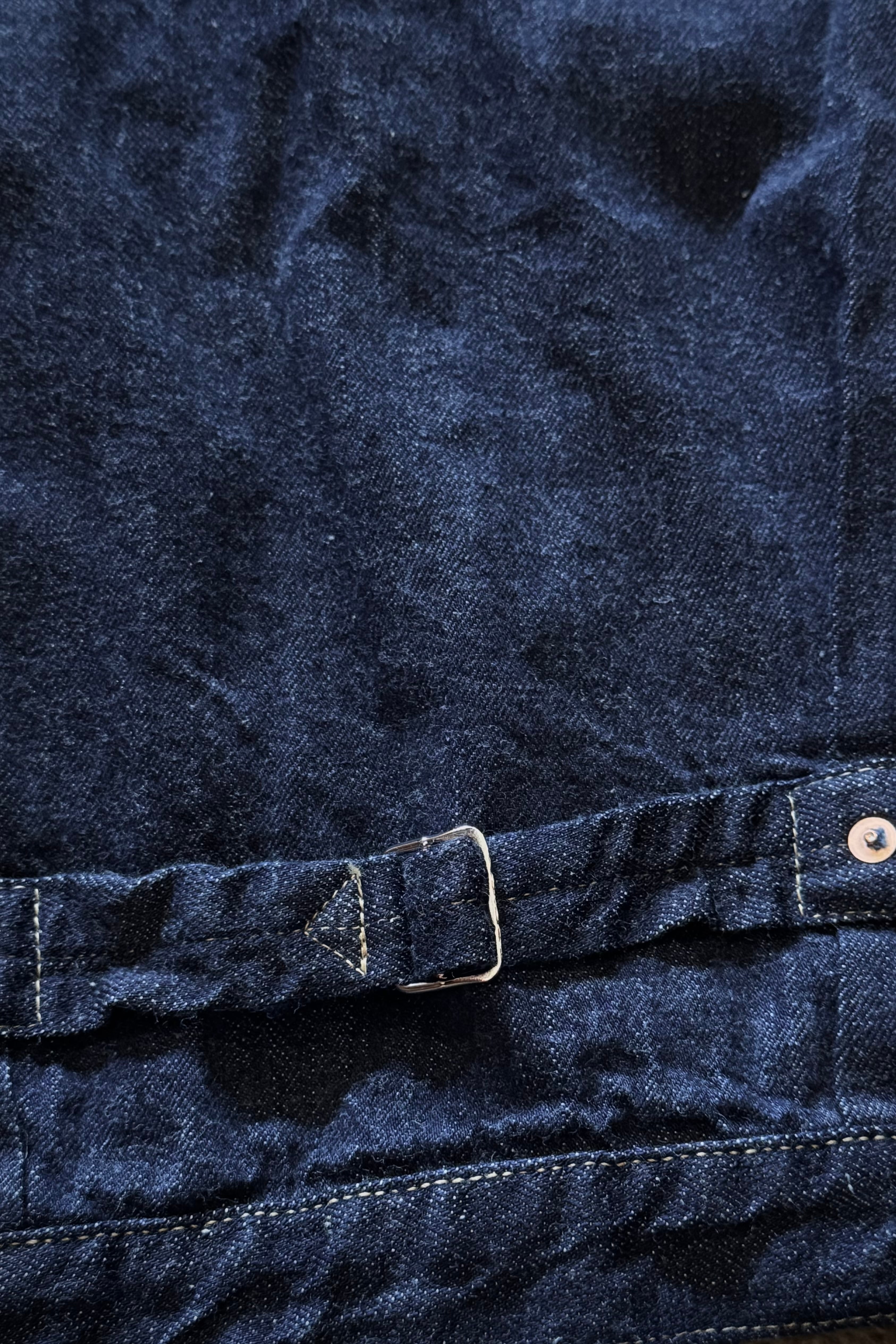 今回は大戦モデルに見られる素人縫製は採用せず、しっかりと強い糸調子でパッカリングを強調した縫製となっています。