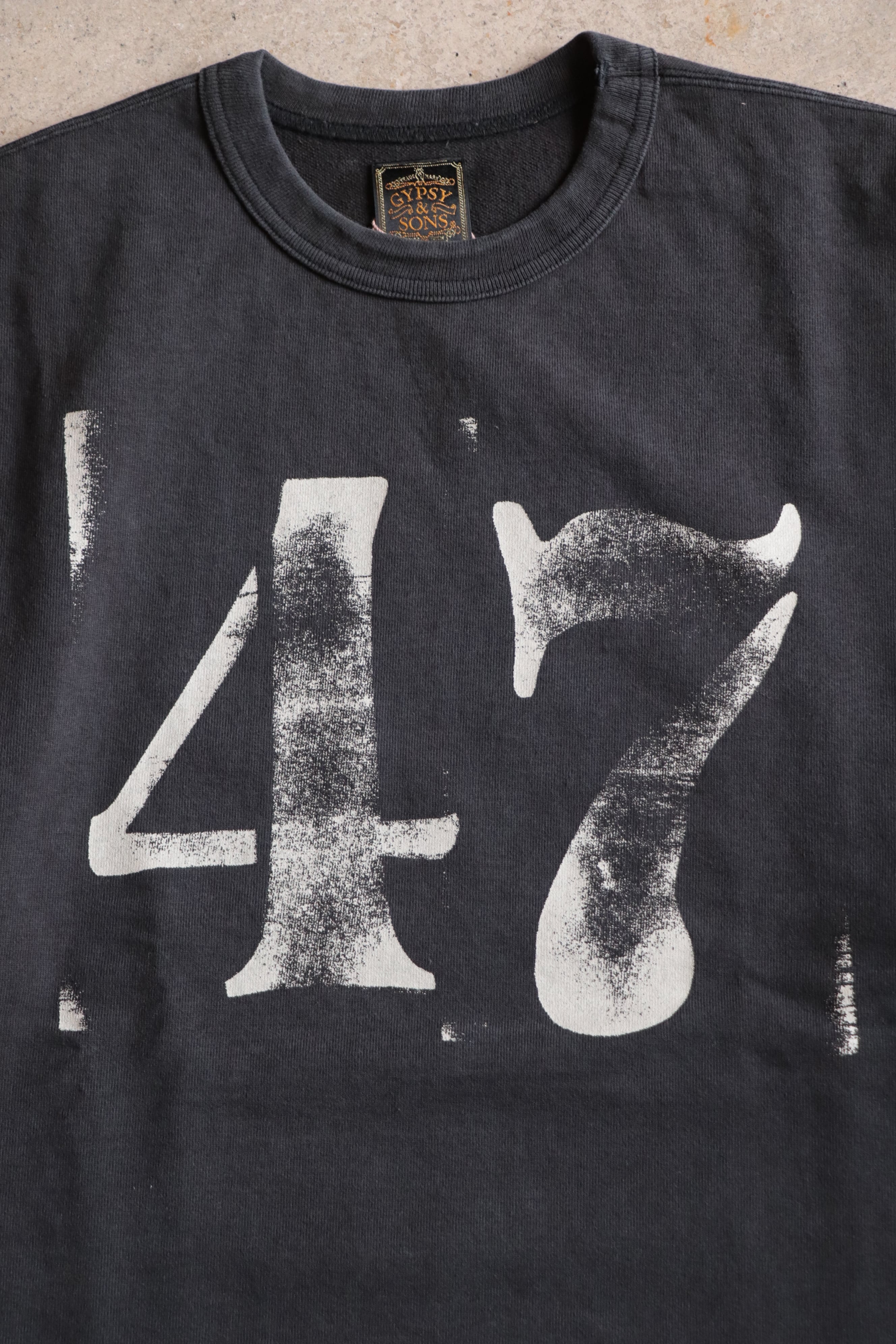 胸元には妄想で当時のバイカーがレースイベントにでた時に仲間とスタンプしたという設定の47番をリアルスタンププリントでをあしらっています。