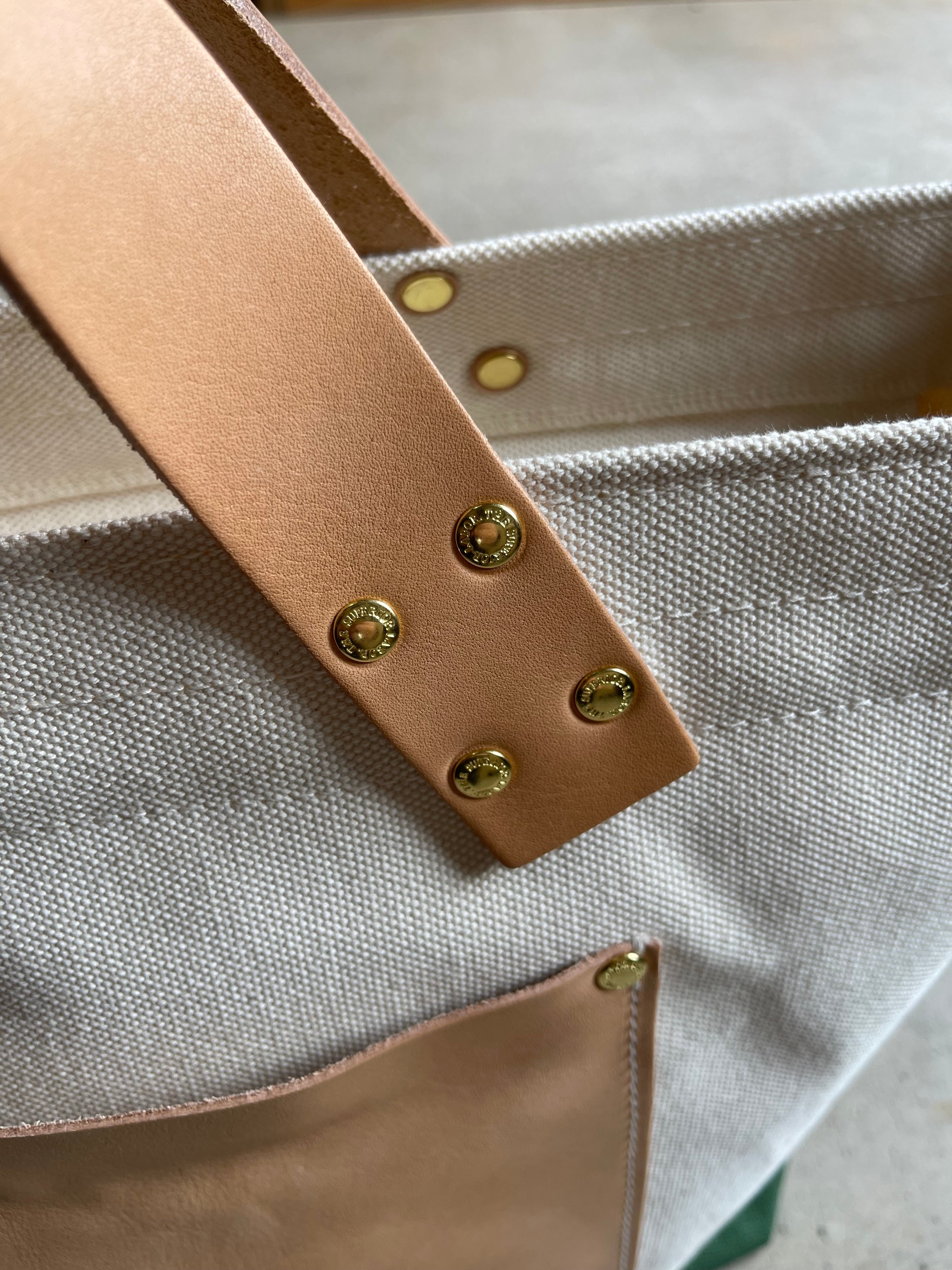 シャトル織機で一日2反しか織ることのできない倉敷産帆布や、東京下町の鋳物工場で作られた真鍮金具、そして、ミモザの樹皮から抽出されたタンニンでなめされた国産のヌメ革。