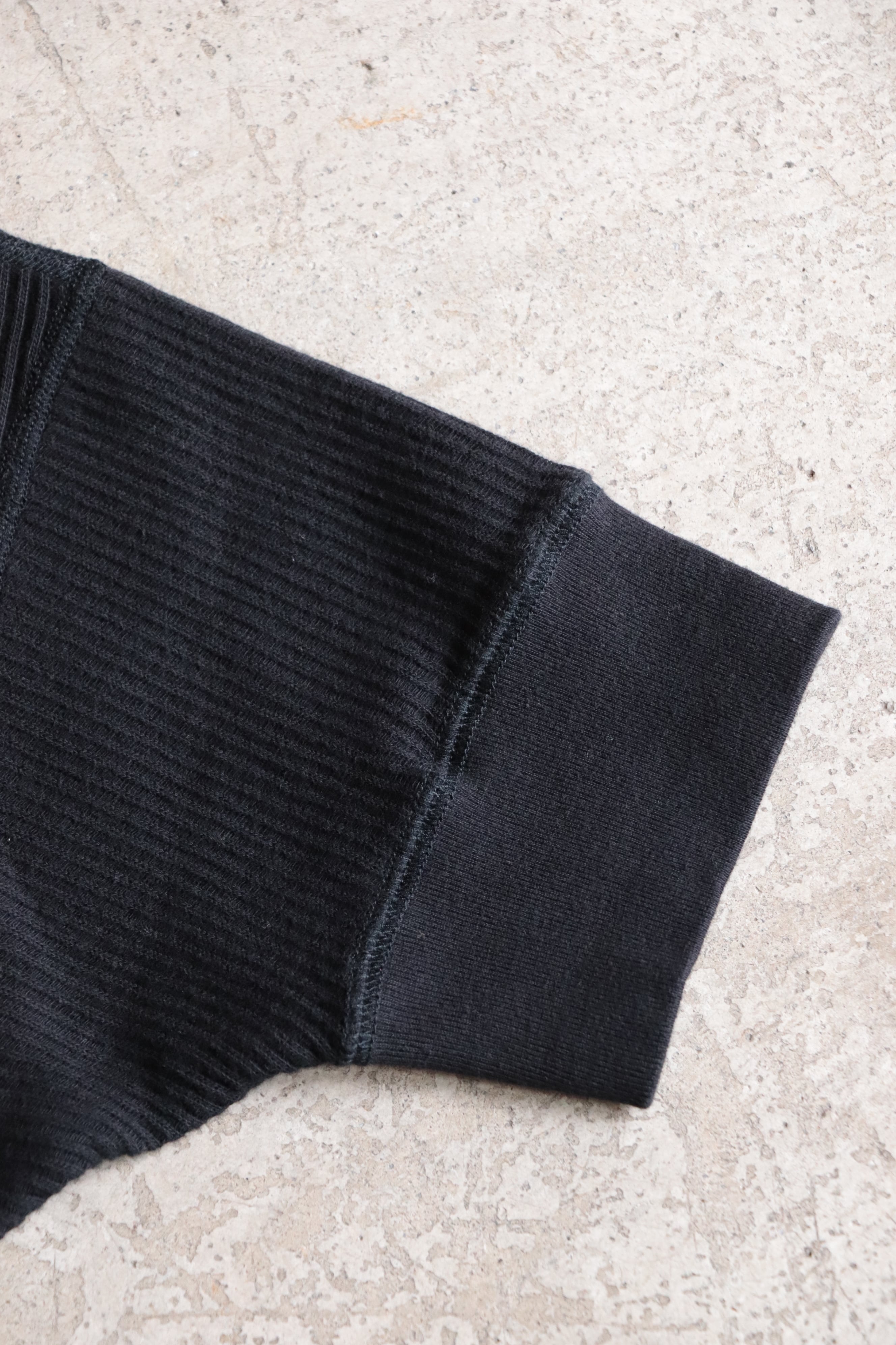 袖口のリブは同色のフライス素材を使用し、主な縫製はフラットシームの4本針で仕上げています。