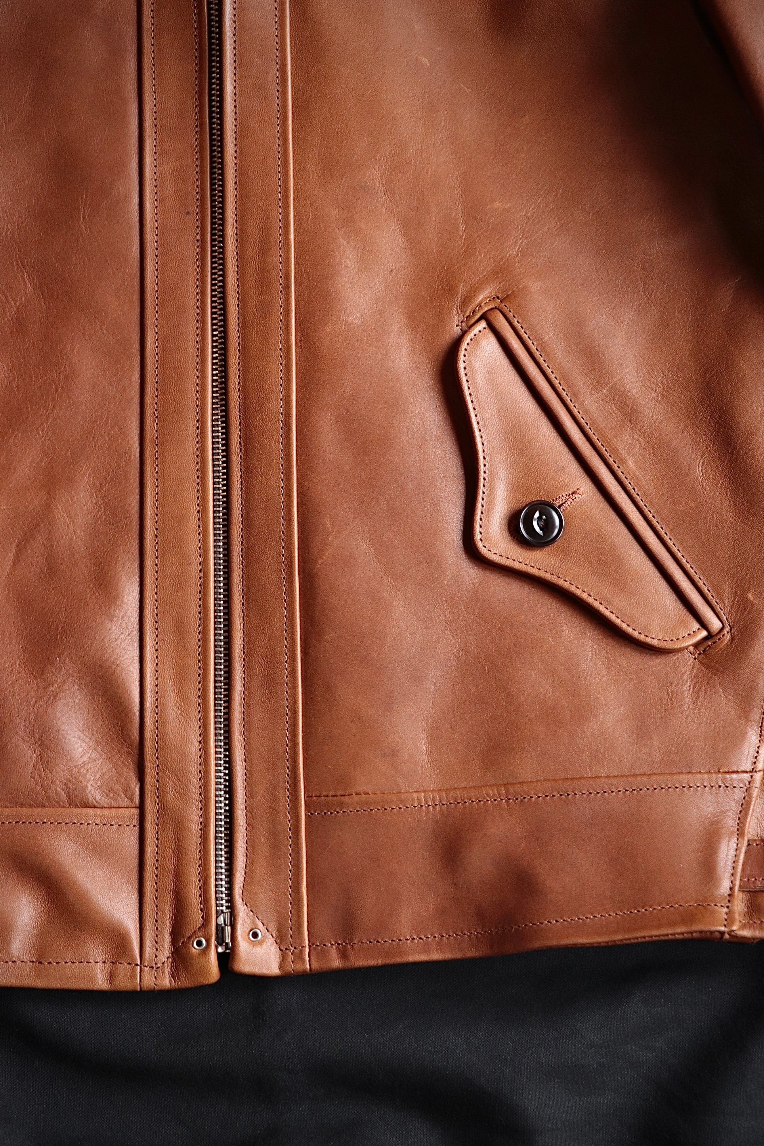 広めに取られた前立てや、着込むことで現れるパッカリングもこの革ならではの魅力。