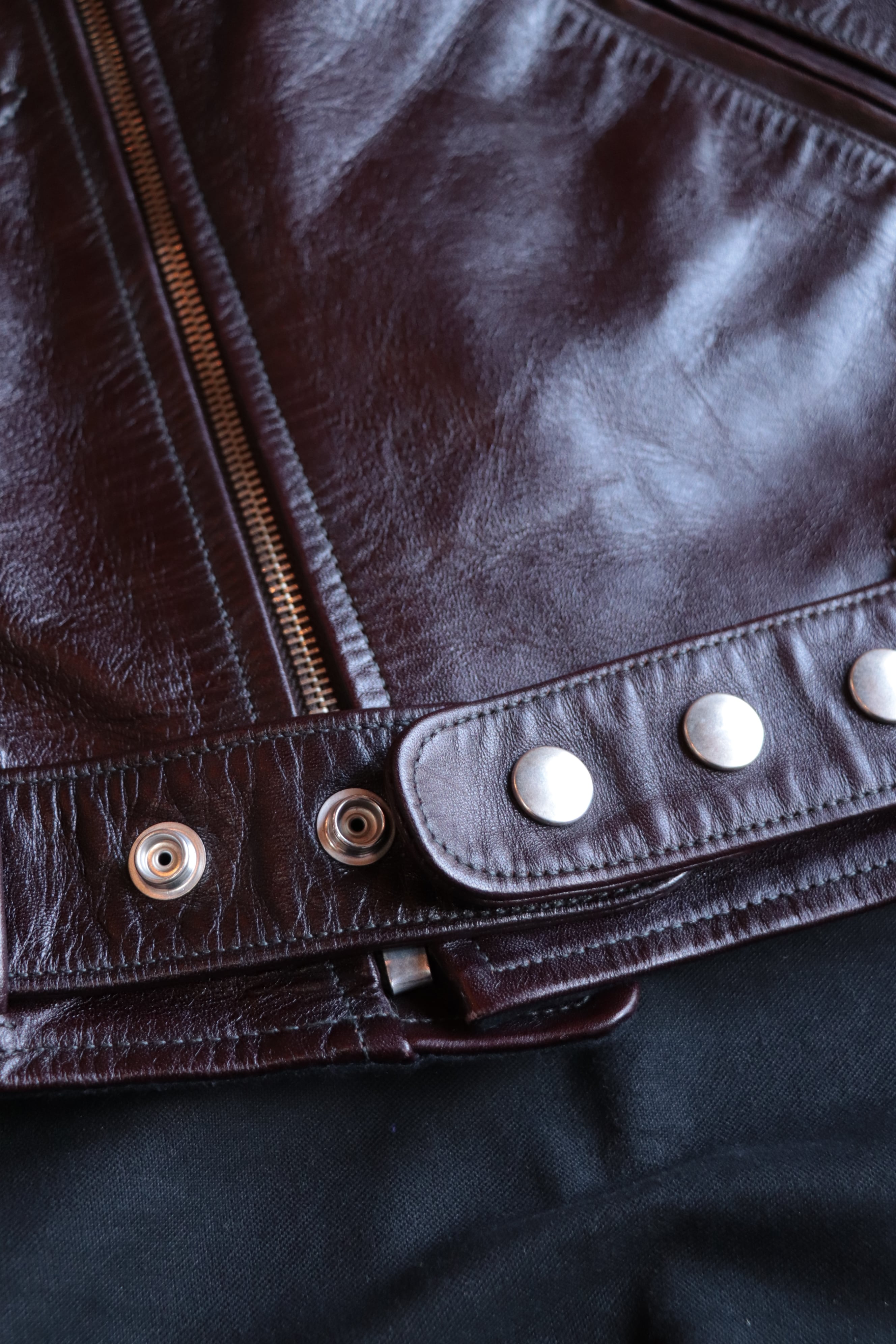 新品は光沢感が強いですが、着こむうちに少しずつマットな風合いに変化します。
