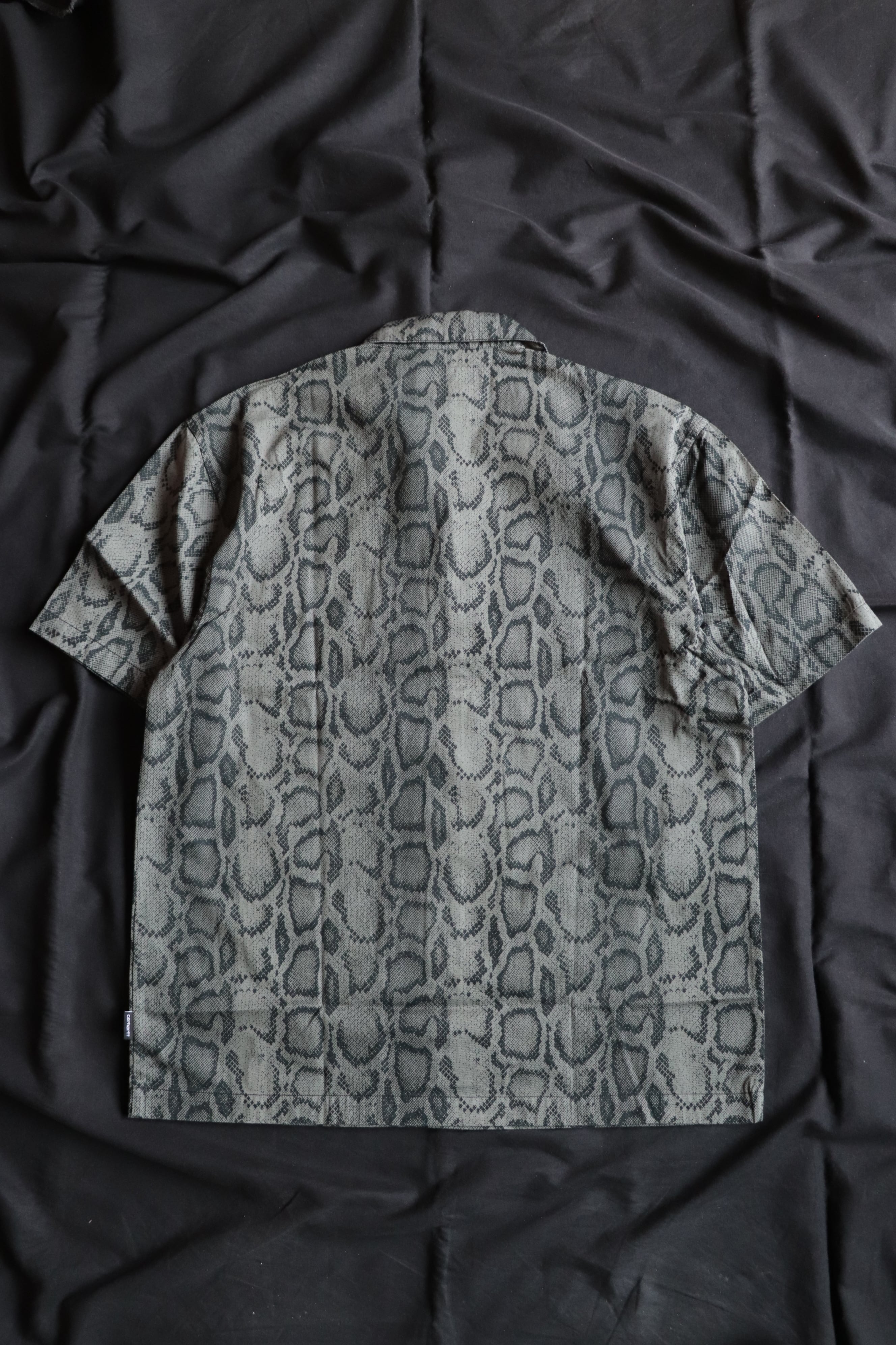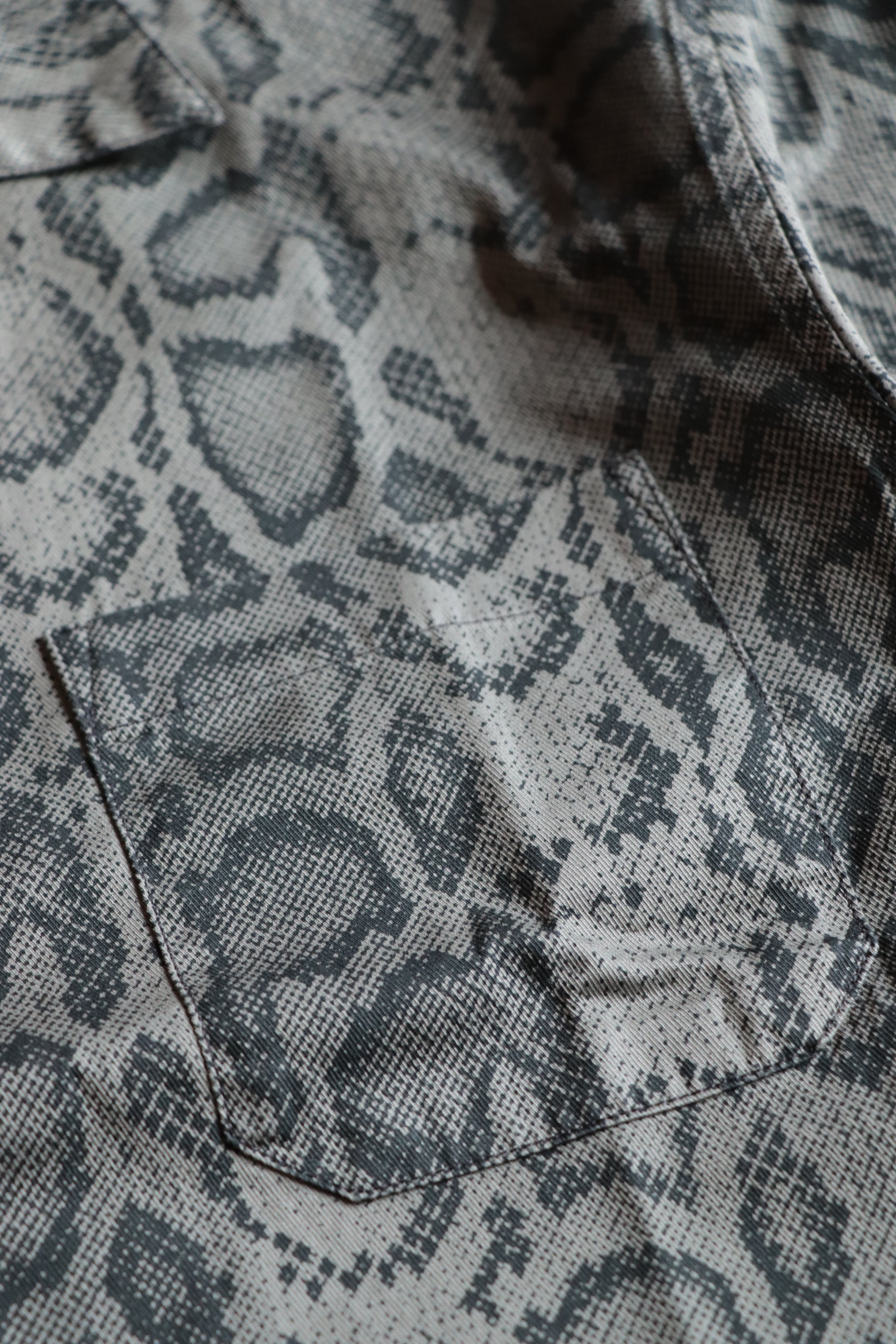 全体にスネークカモ柄がプリントされており、ボウリングカラーと胸ポケットがアクセントになっています。