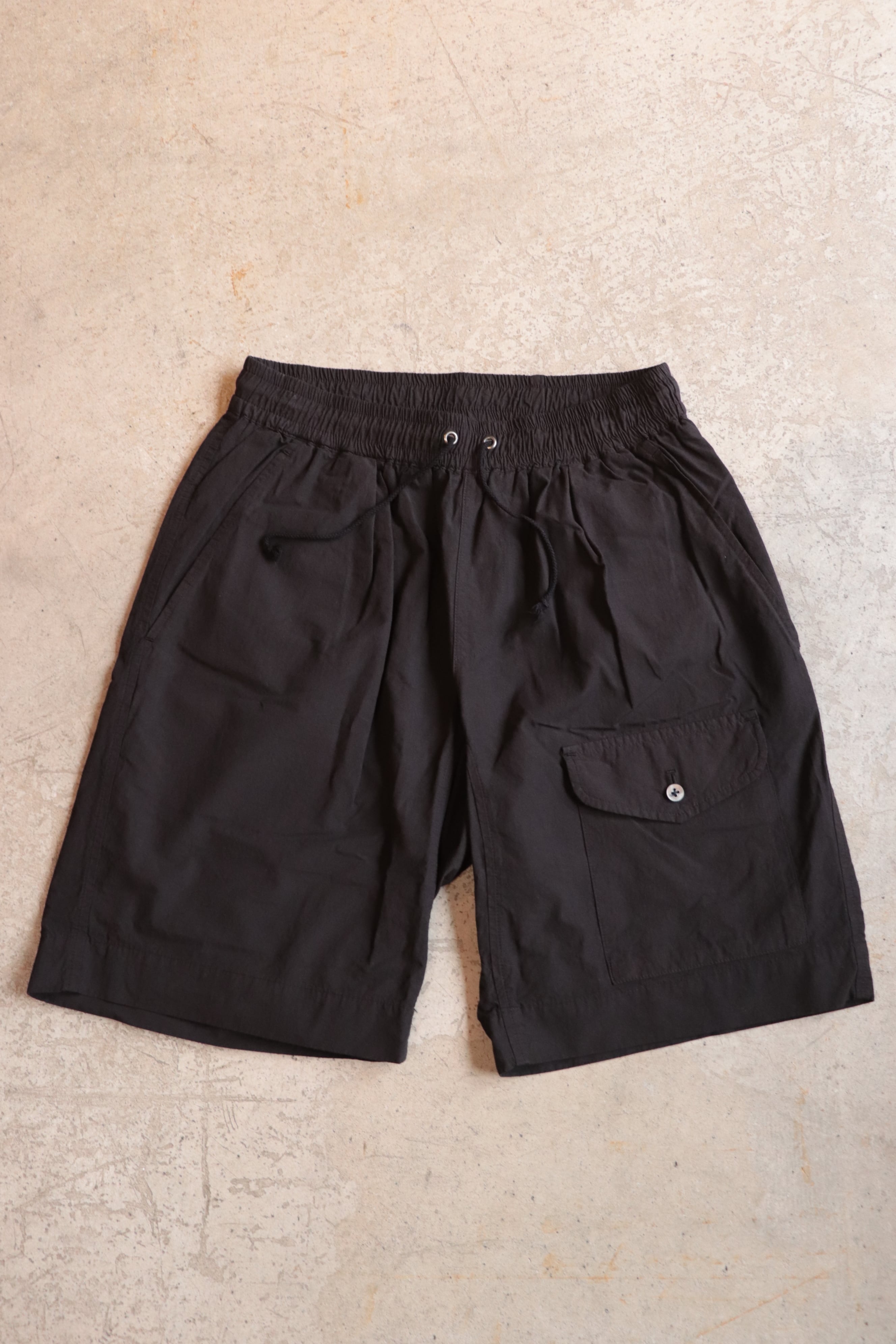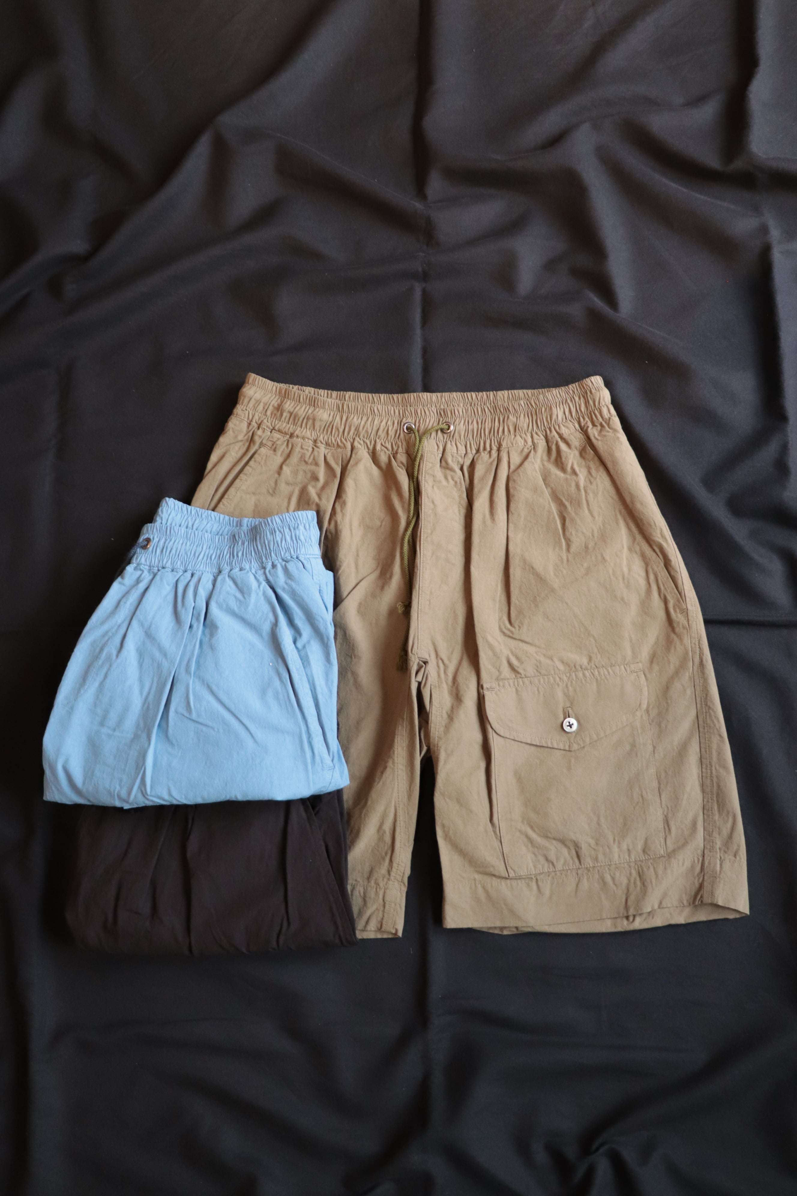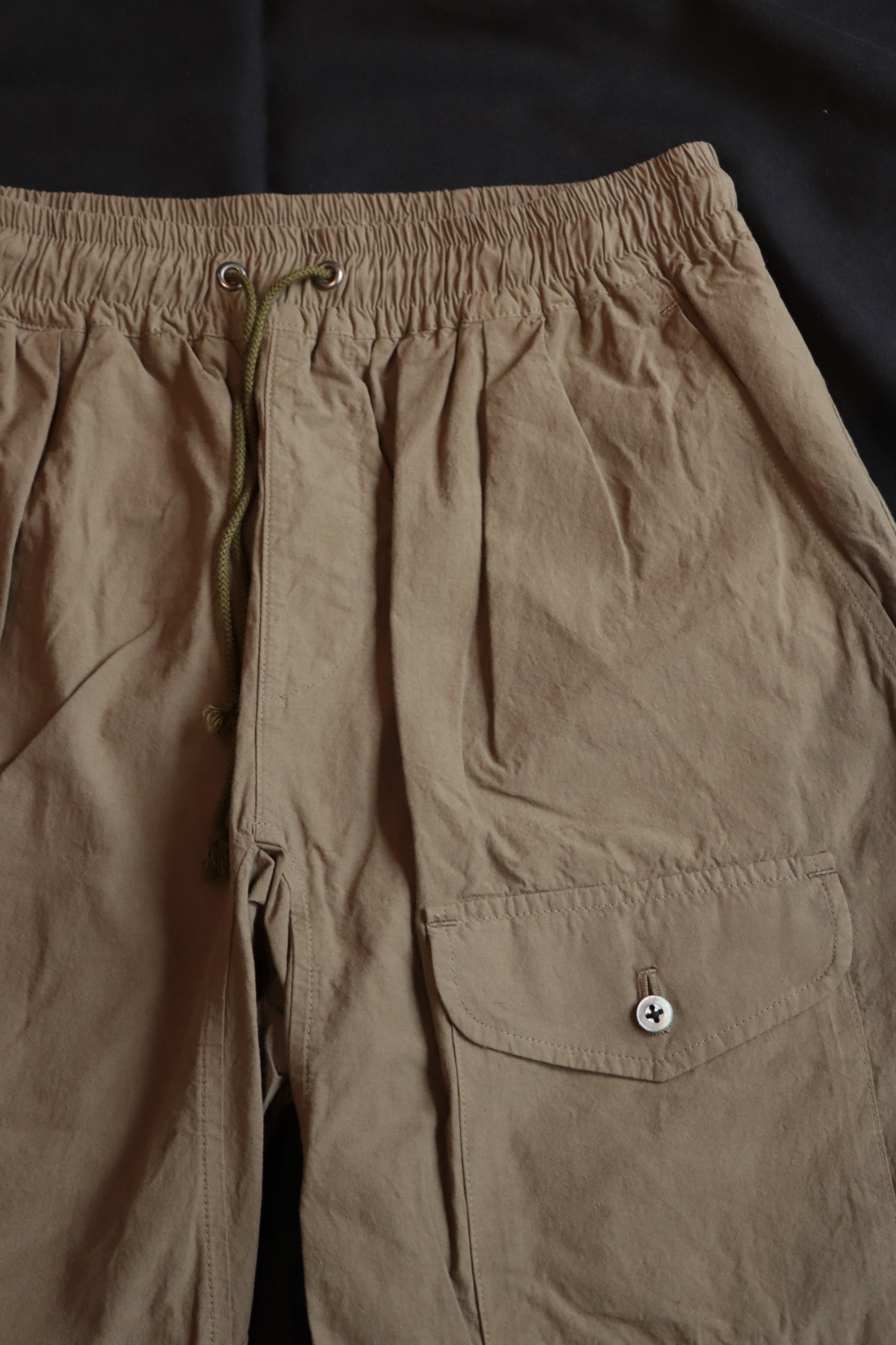 ウエストはゴム入りのイージー仕様で、夏場のリラックススタイルにはピッタリな雰囲気となっております。