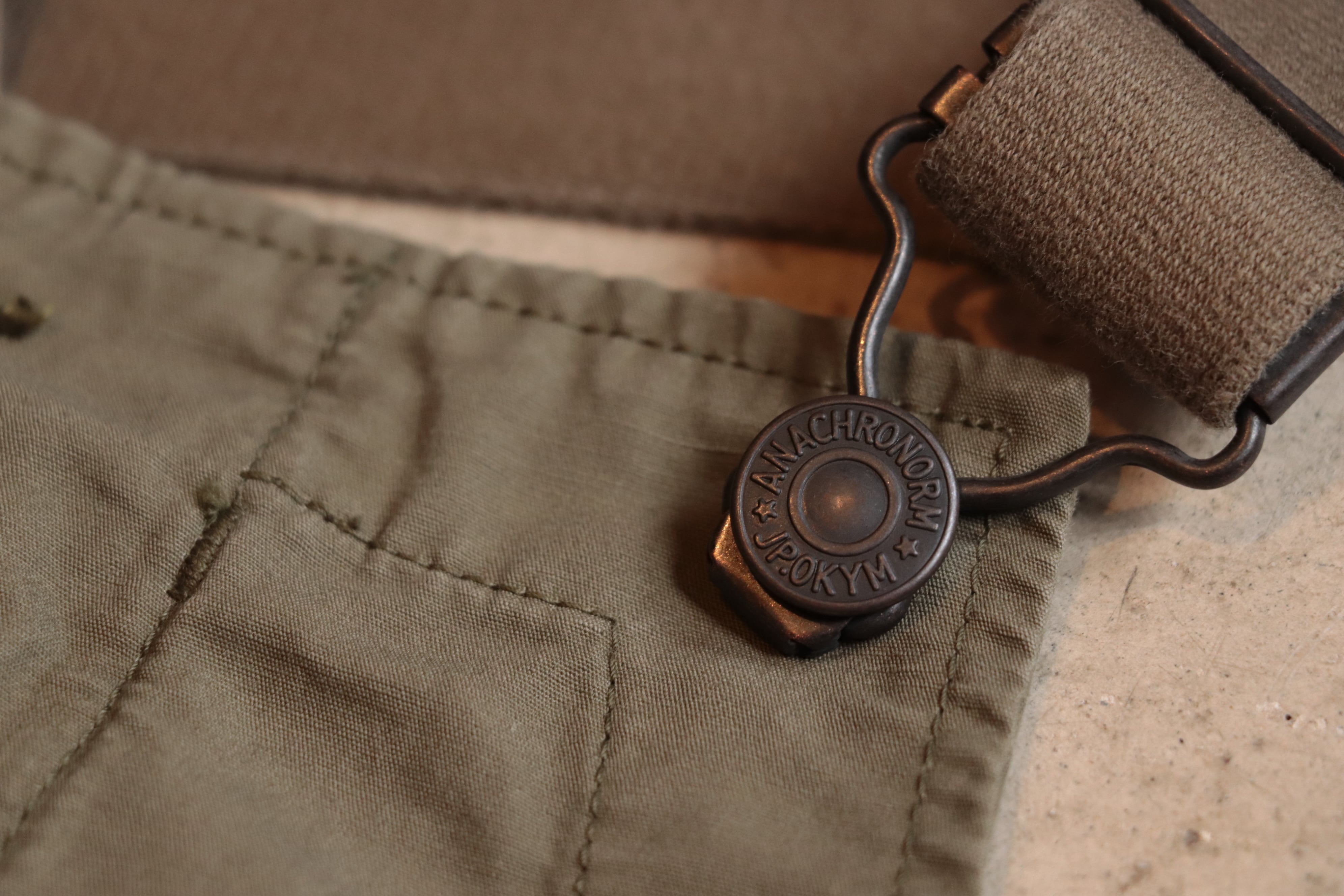 元々、軍ものにあるオーバーパンツをベースに制作されており、裾は絞れるようにボタンが付きます。