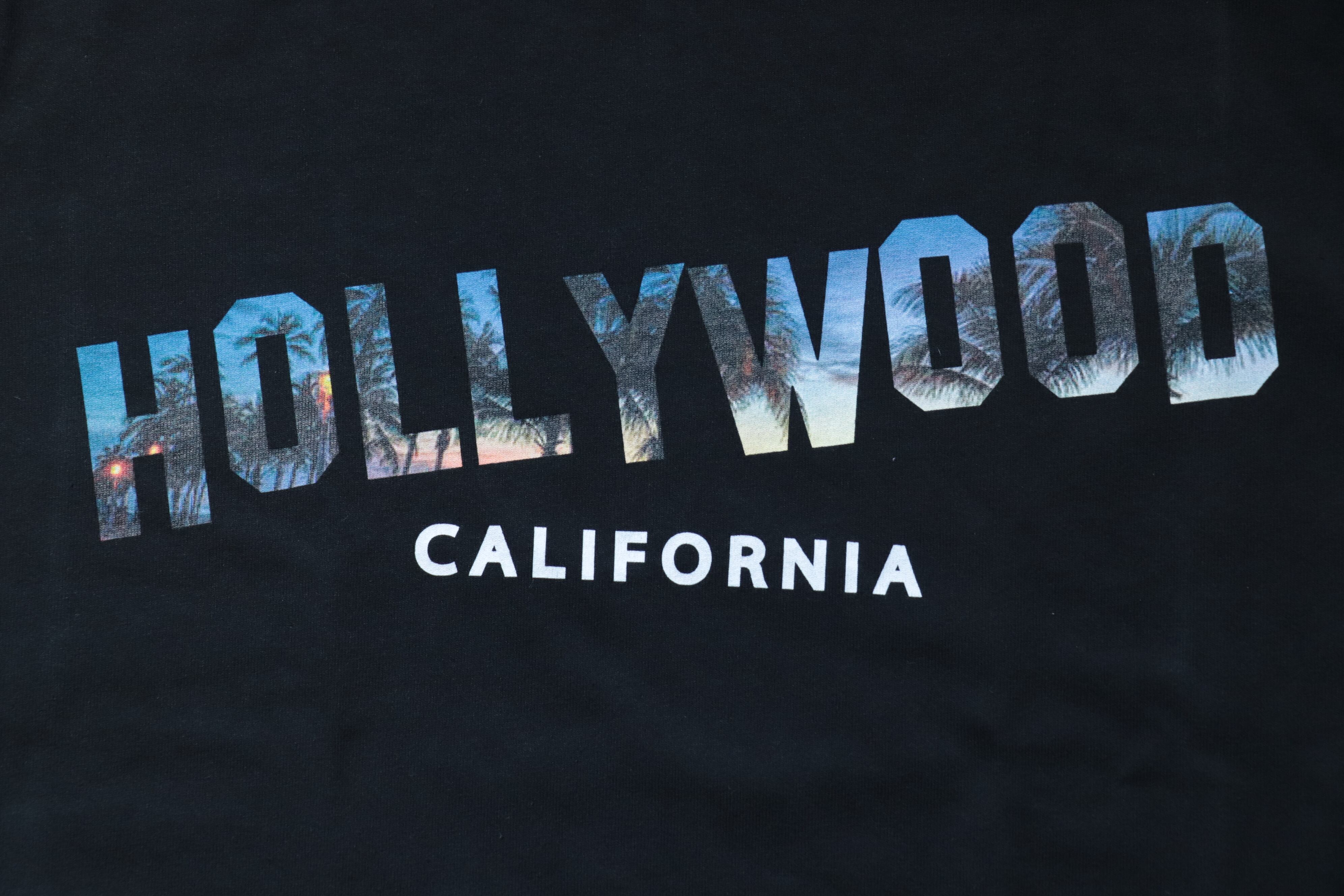 フロントはカリフォルニアの雰囲気を感じさせるヤシの木の風景を使ったHOLLYWOODロゴ、バックプリントはSTARロゴを使用しています。