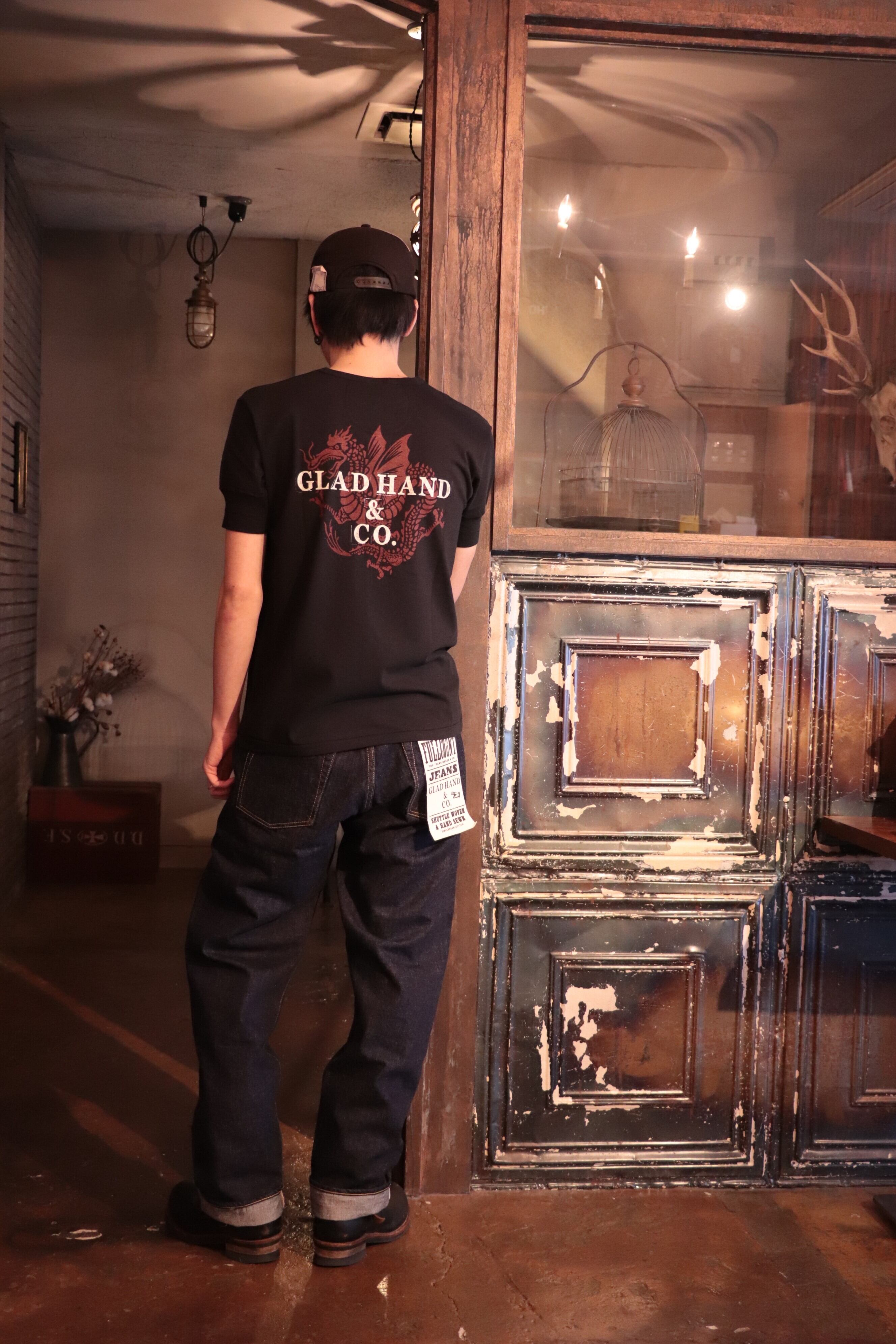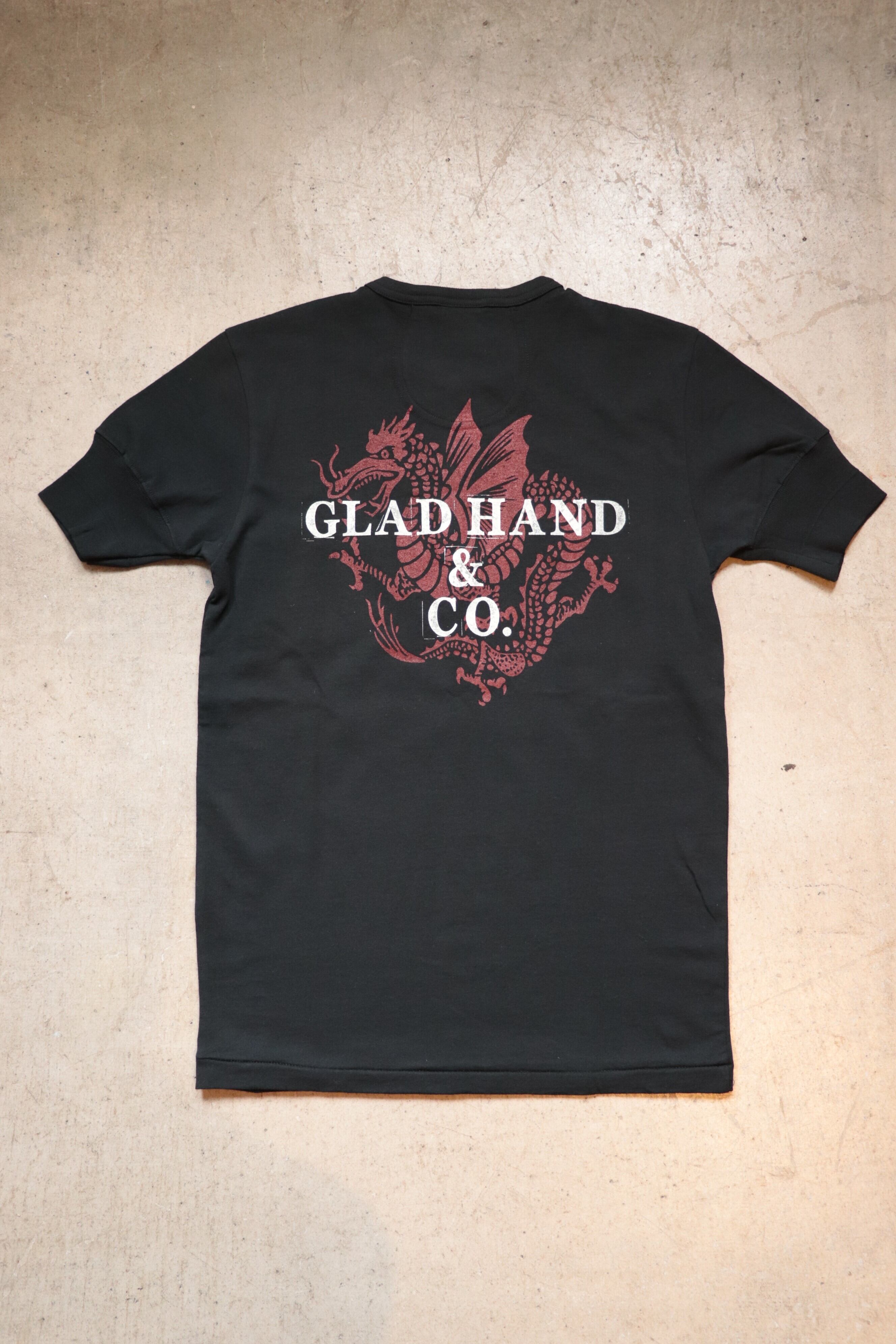 GLAD HANDの人気ヘンリーTEEにFULLCOUNTのドラゴンとGLAD HANDロゴをヴィンテージラバープリントにて施しています。