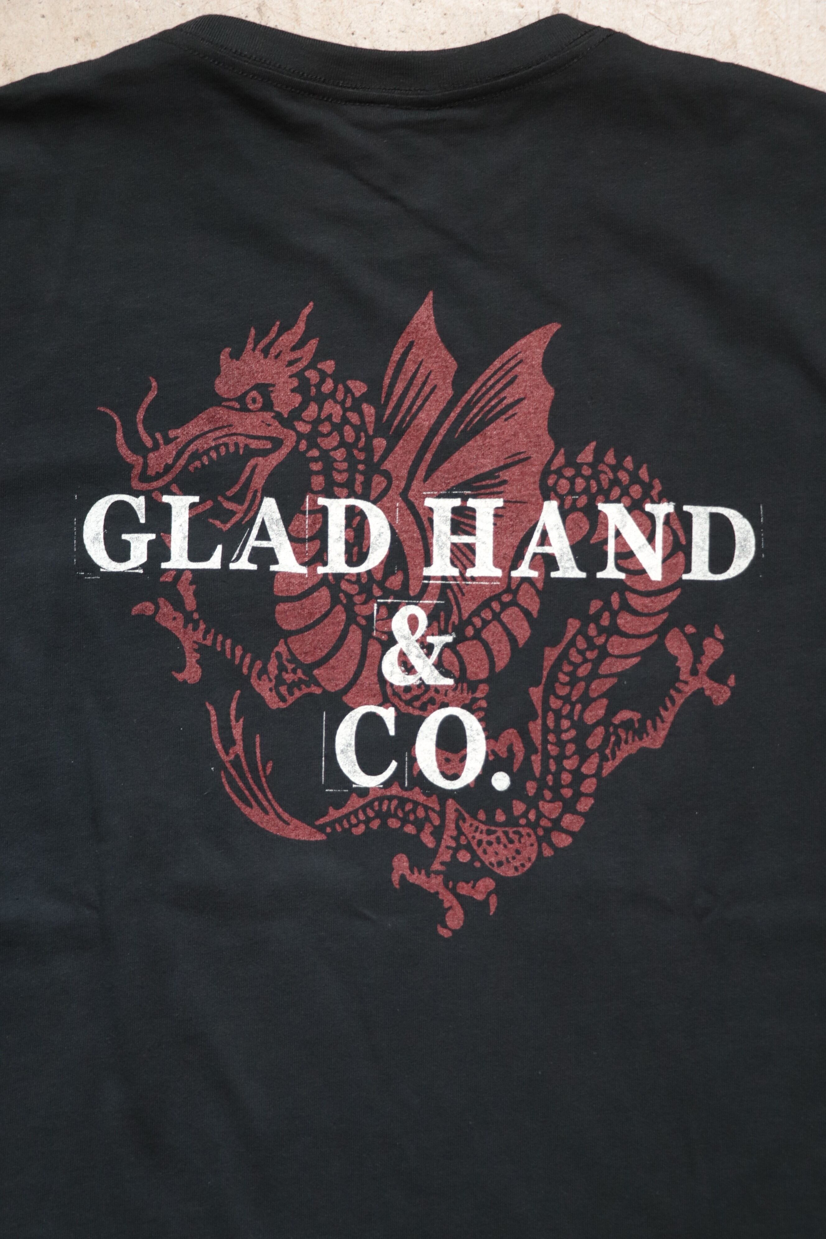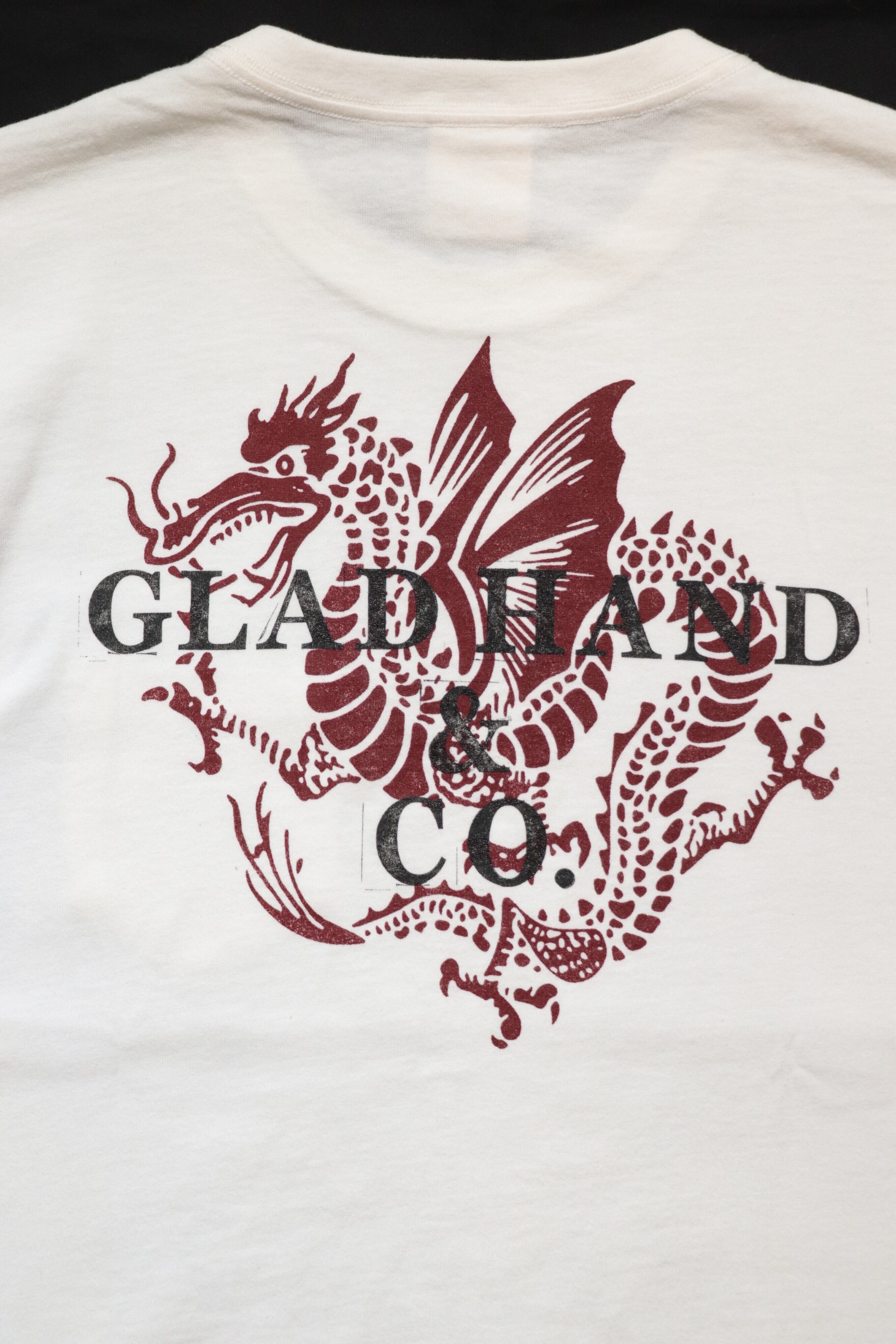 GLAD HANDの人気クルーネックTEEにFULLCOUNTのドラゴンとGLAD HANDロゴをヴィンテージラバープリントにて施しています。
