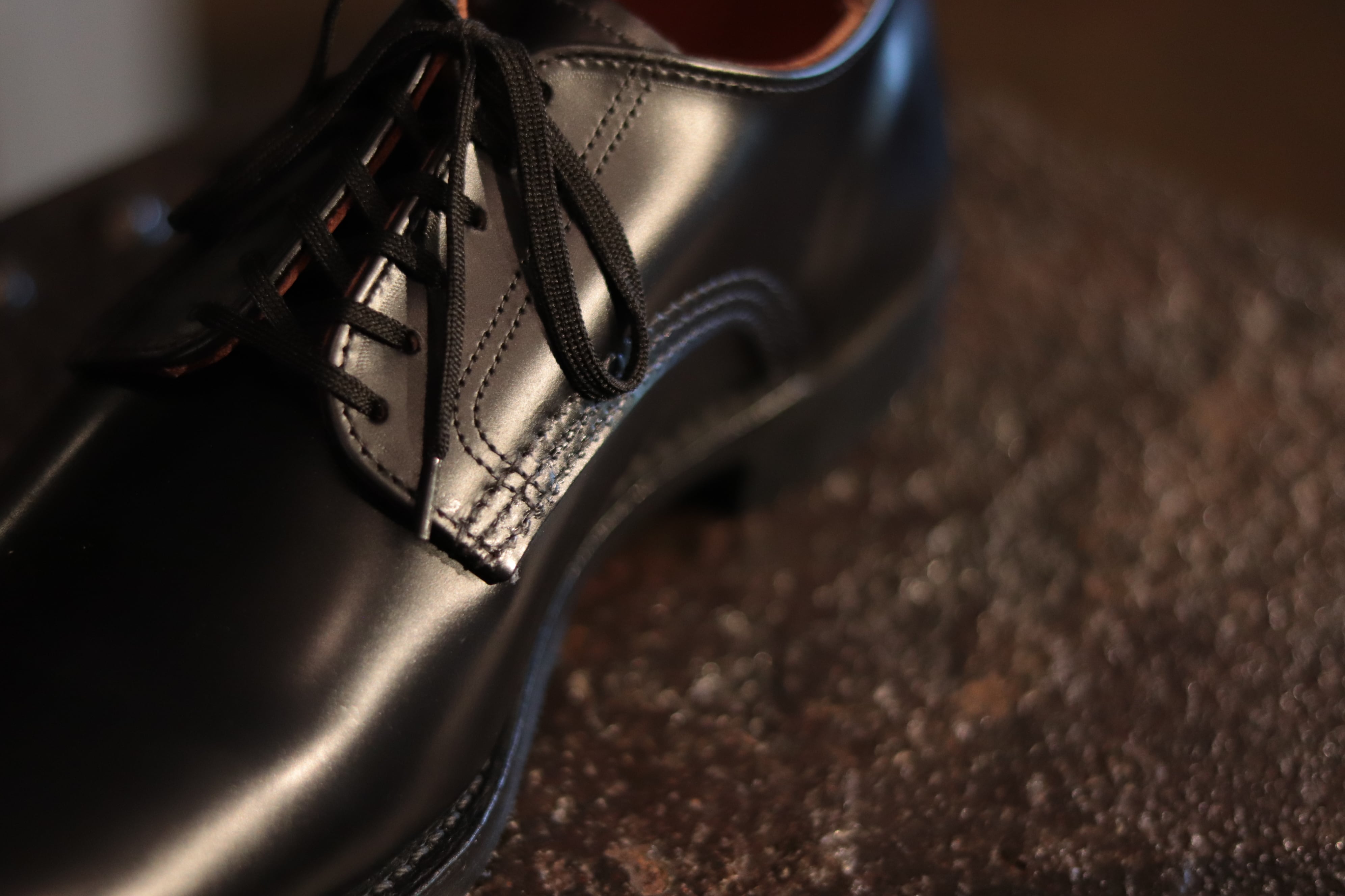 当時の米軍将校がフォーマルな場で履いた靴を思わせる強い艶を持つレザーは、キメの細かい肌質のヘファーハイド(若い未経産の牝牛の皮)のみを使い、染色後の銀面(革の表面)にレジン系のトップコーティングを施したエスカイヤ・レザーです。