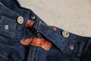 細番手の綿糸を非常に細かな運針で丁寧に縫い上げ、サイドシームだけではなくウエストベルト裏にもセルビッチを使用した非常に贅沢な仕様になります。