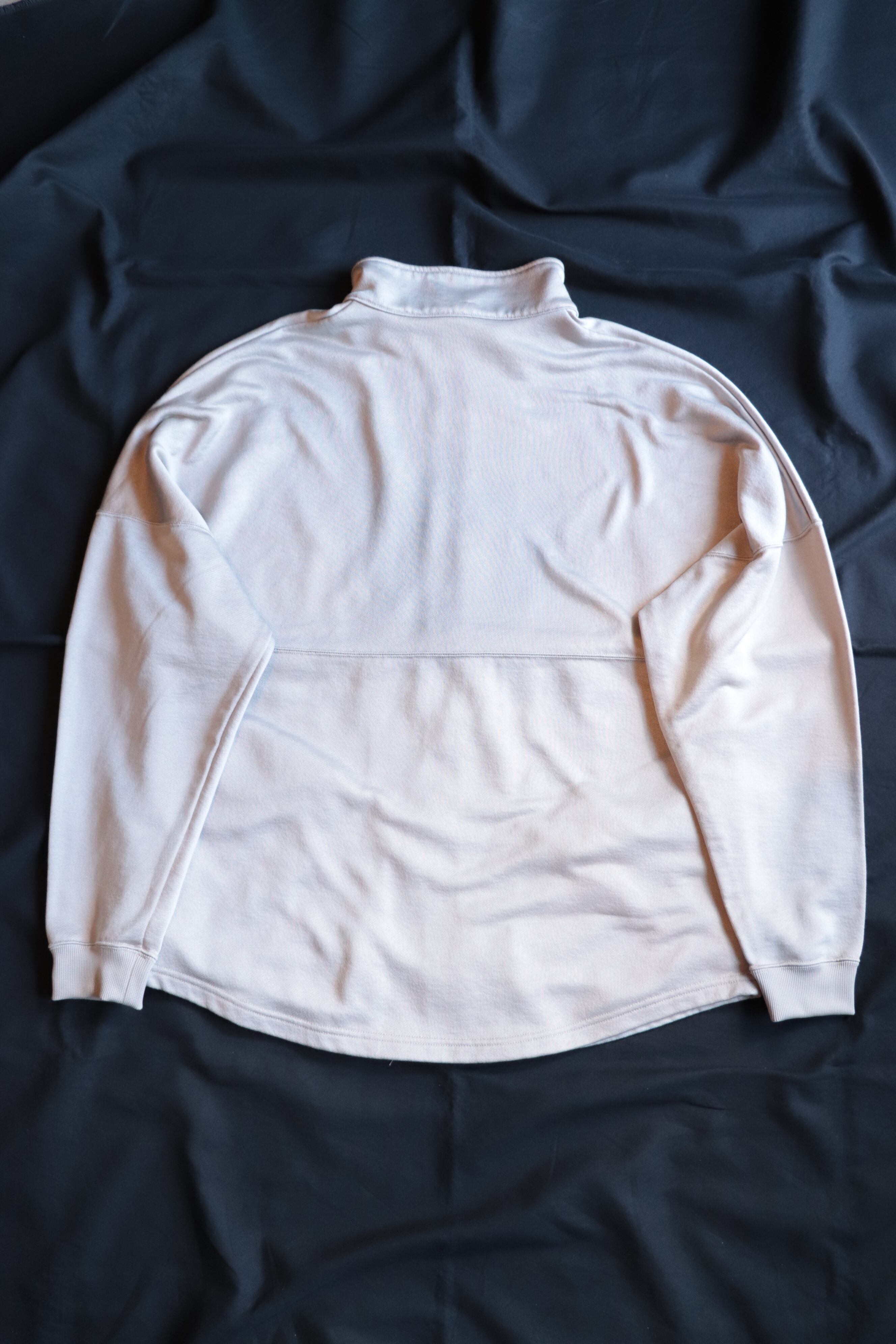 極端に落とした肩や、大きく取った袖、野暮ったくなり過ぎないようシェイプさせたウエスト等、 計算された drop sweat のパターンを踏襲し 90’ s 感ある仕上がりとなっています。