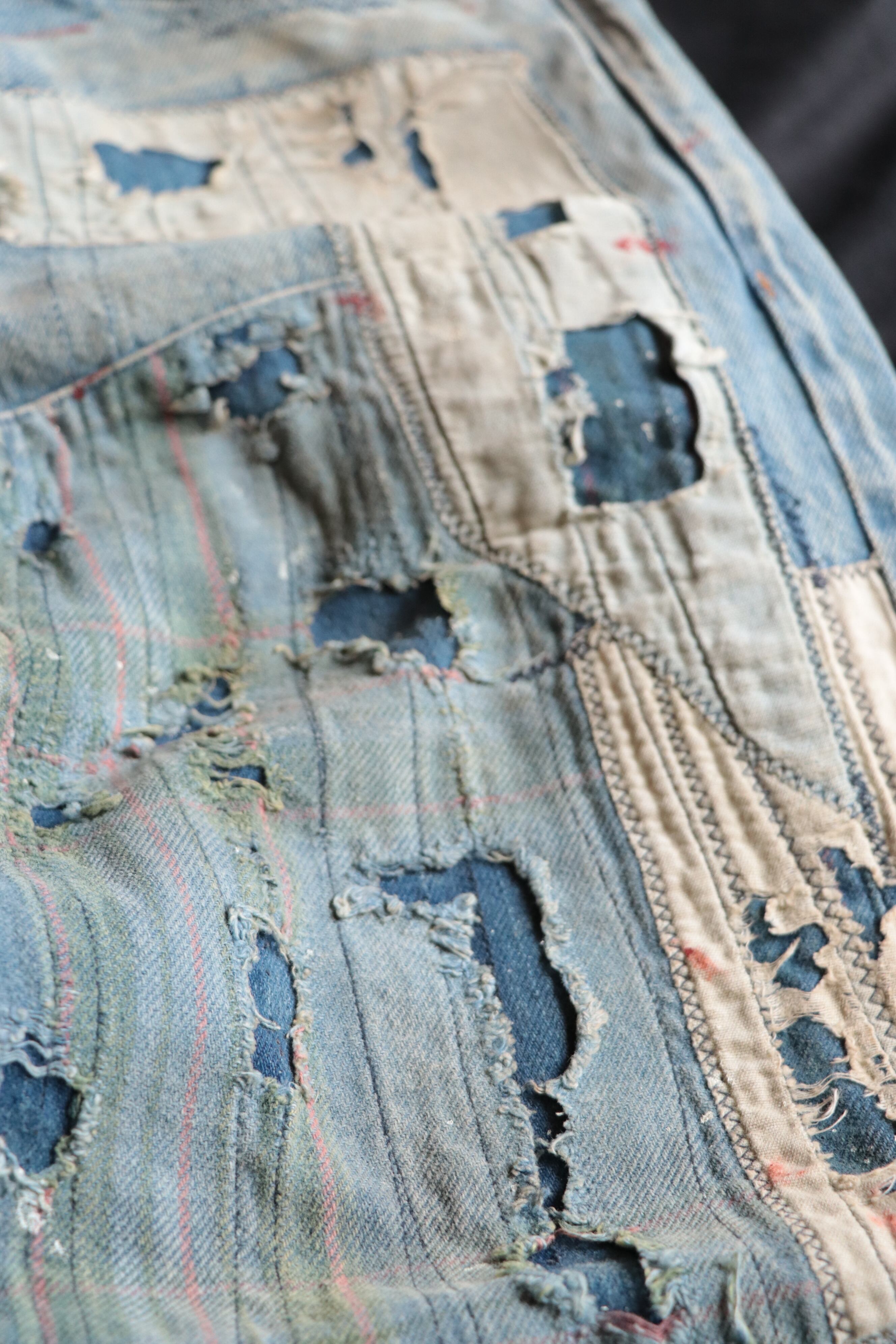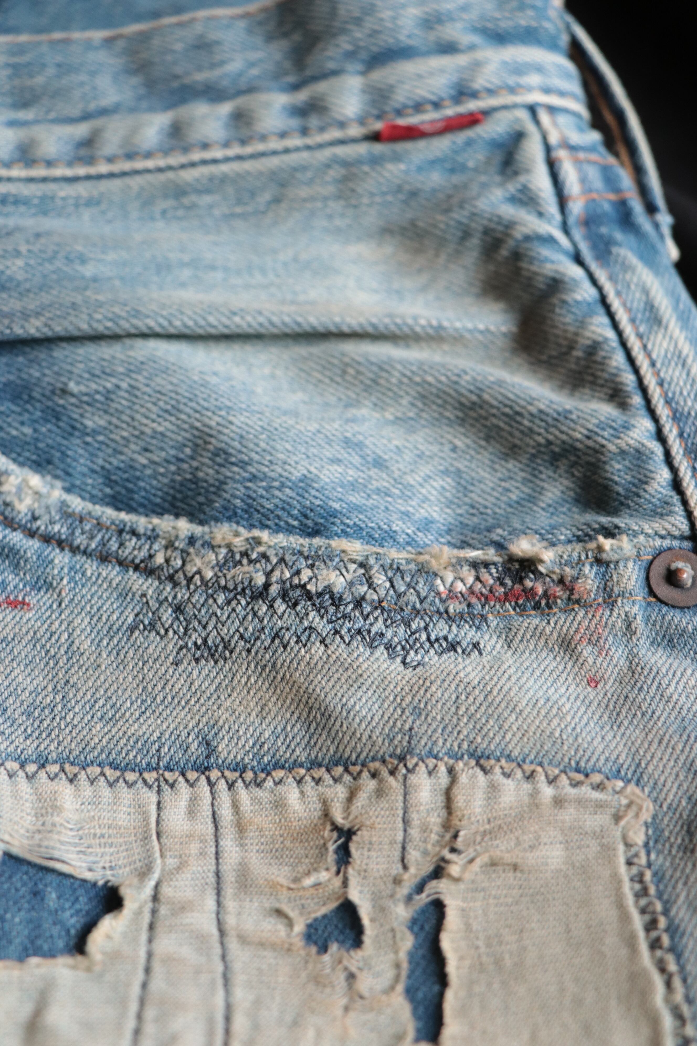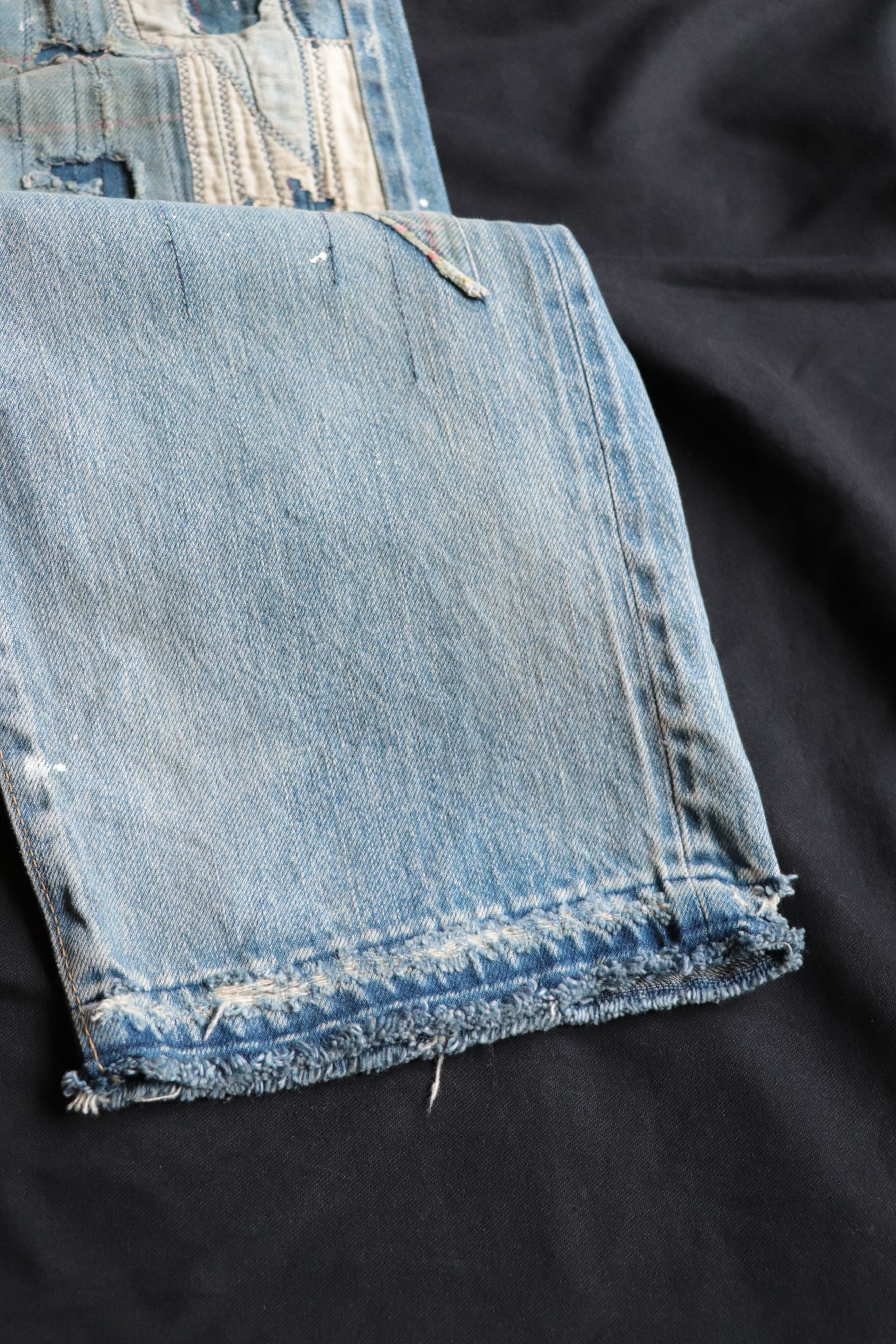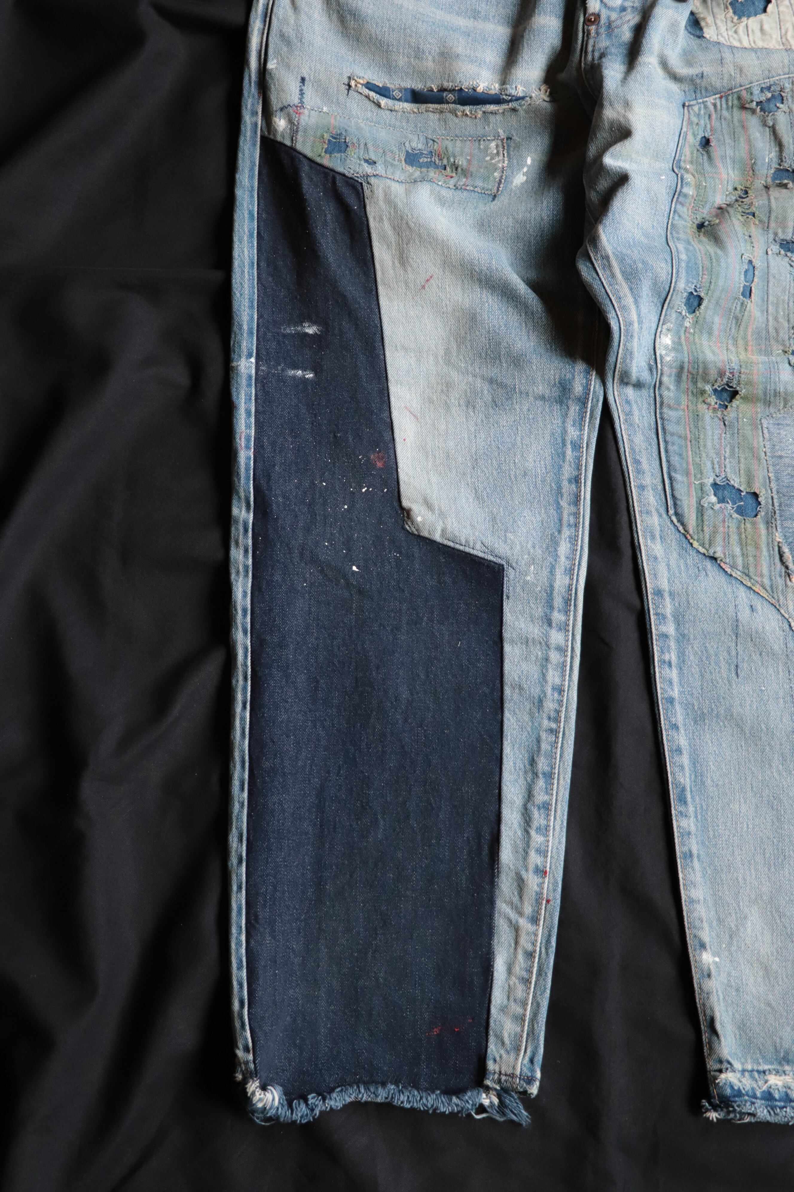 ブランドが得意とするハードなダメージ加工、パッチワークを施された1本は圧倒的な存在感を放ちます。