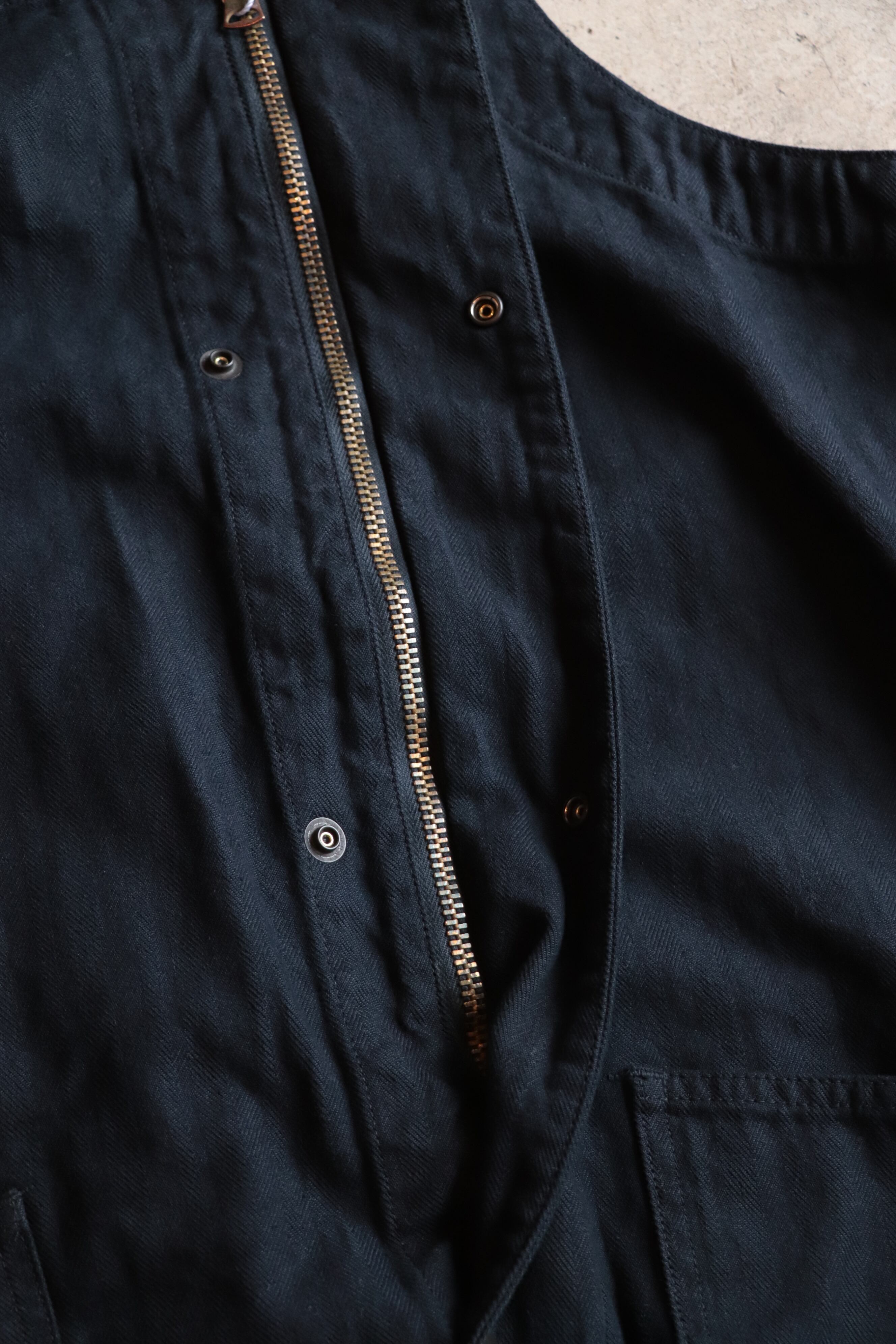製品染めを施した、インディゴヘリンボーン生地で、着こむほどにデニムのようなアタリ感、経年変化をお楽しみいただけます。