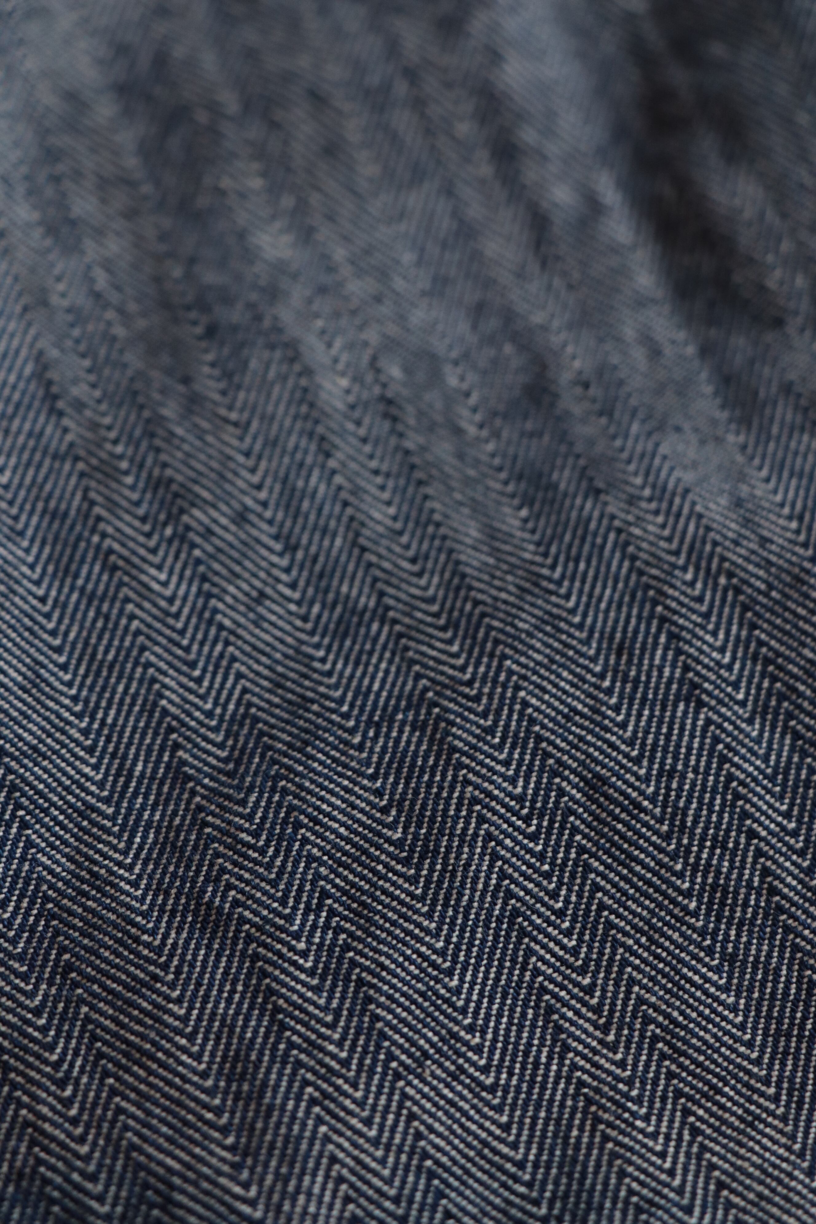 ブランド設立当初に使用していた、デッドストックの経糸インディゴのランダムヘリンボーンを採用。織形状の不揃い感が、生地の表情を豊かにしています。