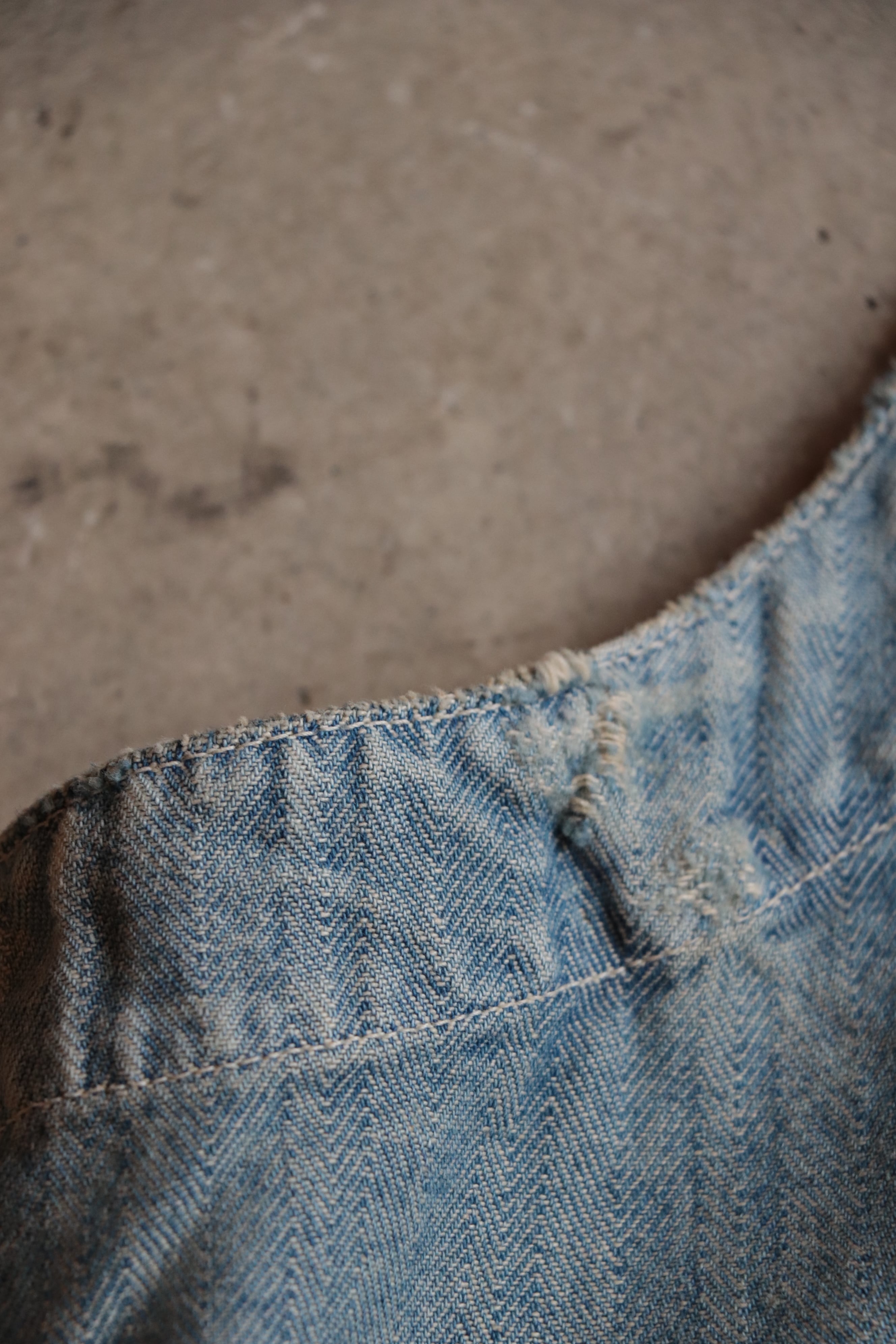 ブランド設立当初に使用していた、デッドストックの経糸インディゴのランダムヘリンボーンを採用。織形状の不揃い感が、生地の表情を豊かにしています。