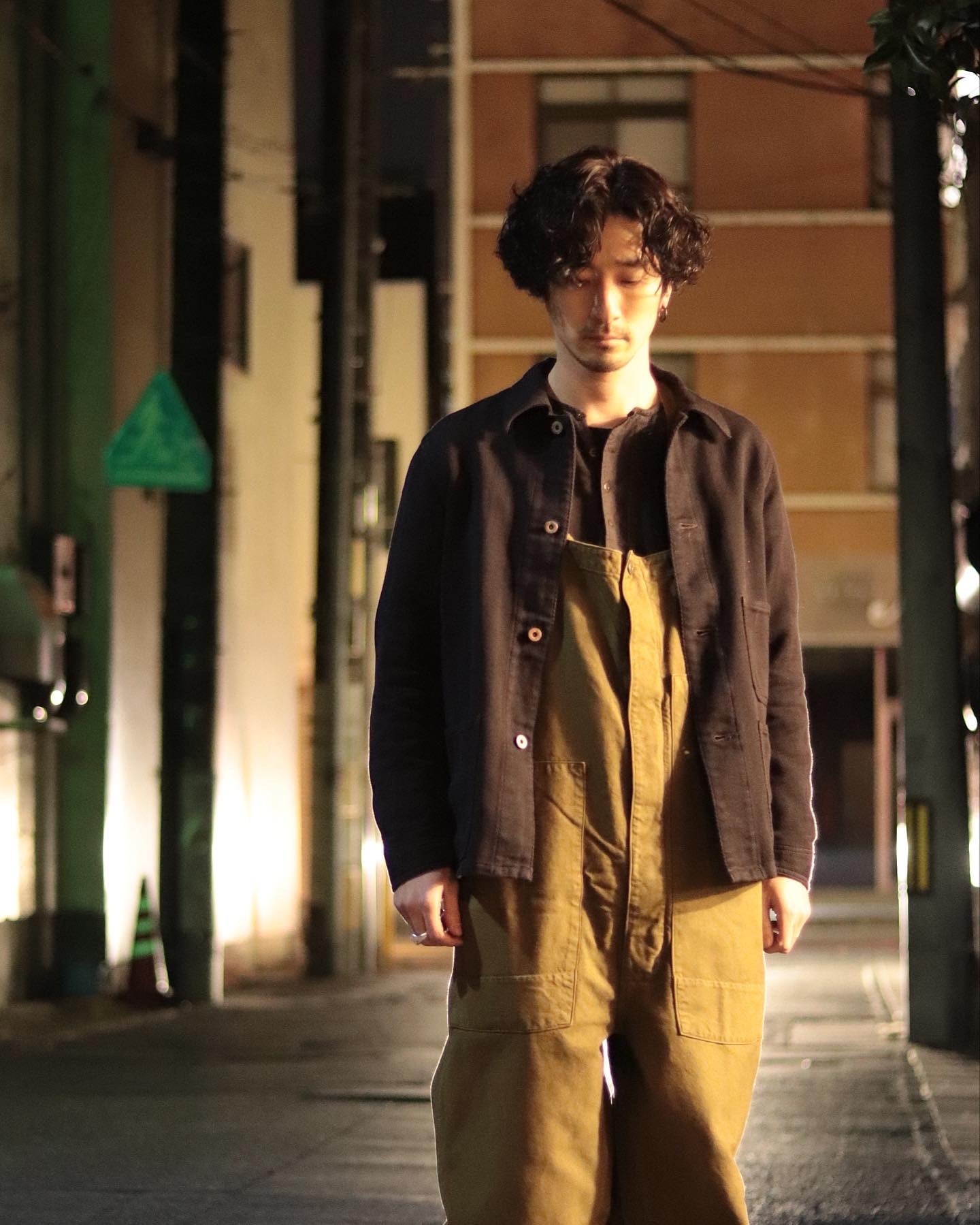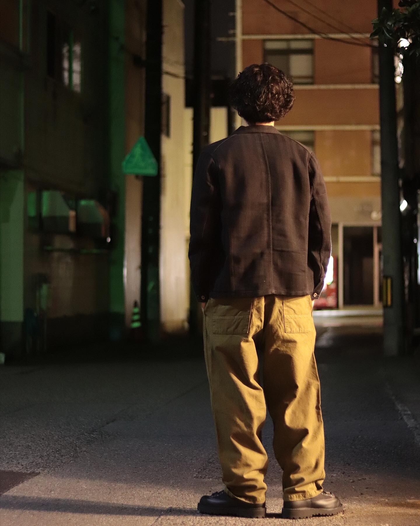 シルエットはやや裾広がりで短めの着丈、至ってシンプルなデザインに経年加工を施した5スター2プロングドーナツボタン、味のあるステッチワークなど随所にこだわりが詰まった1着となっております。