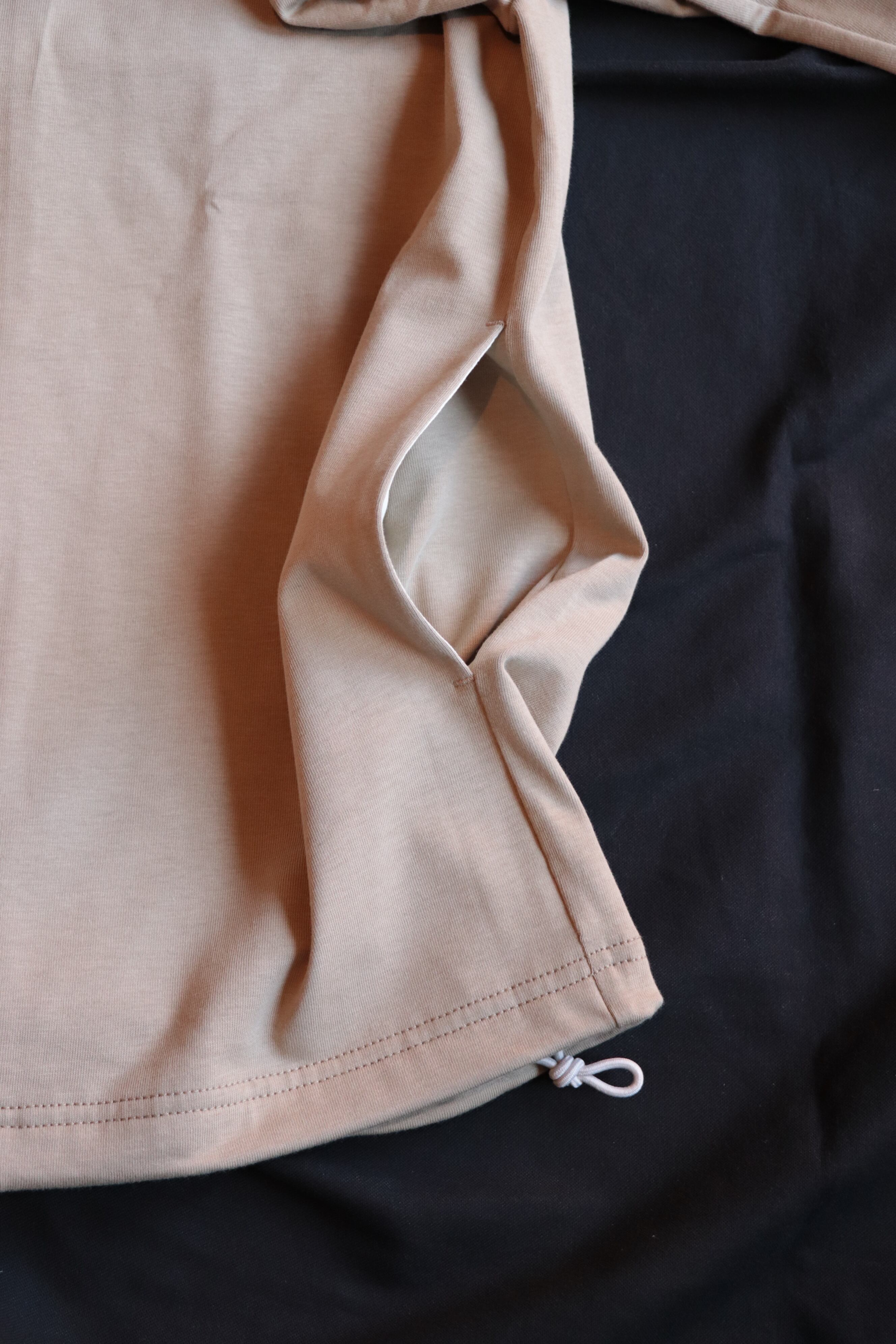 裾の内側のドローコードはシルエットのアレンジとしてだけでなく、動きの中でも裾がめくれ上がらない役割もあります。