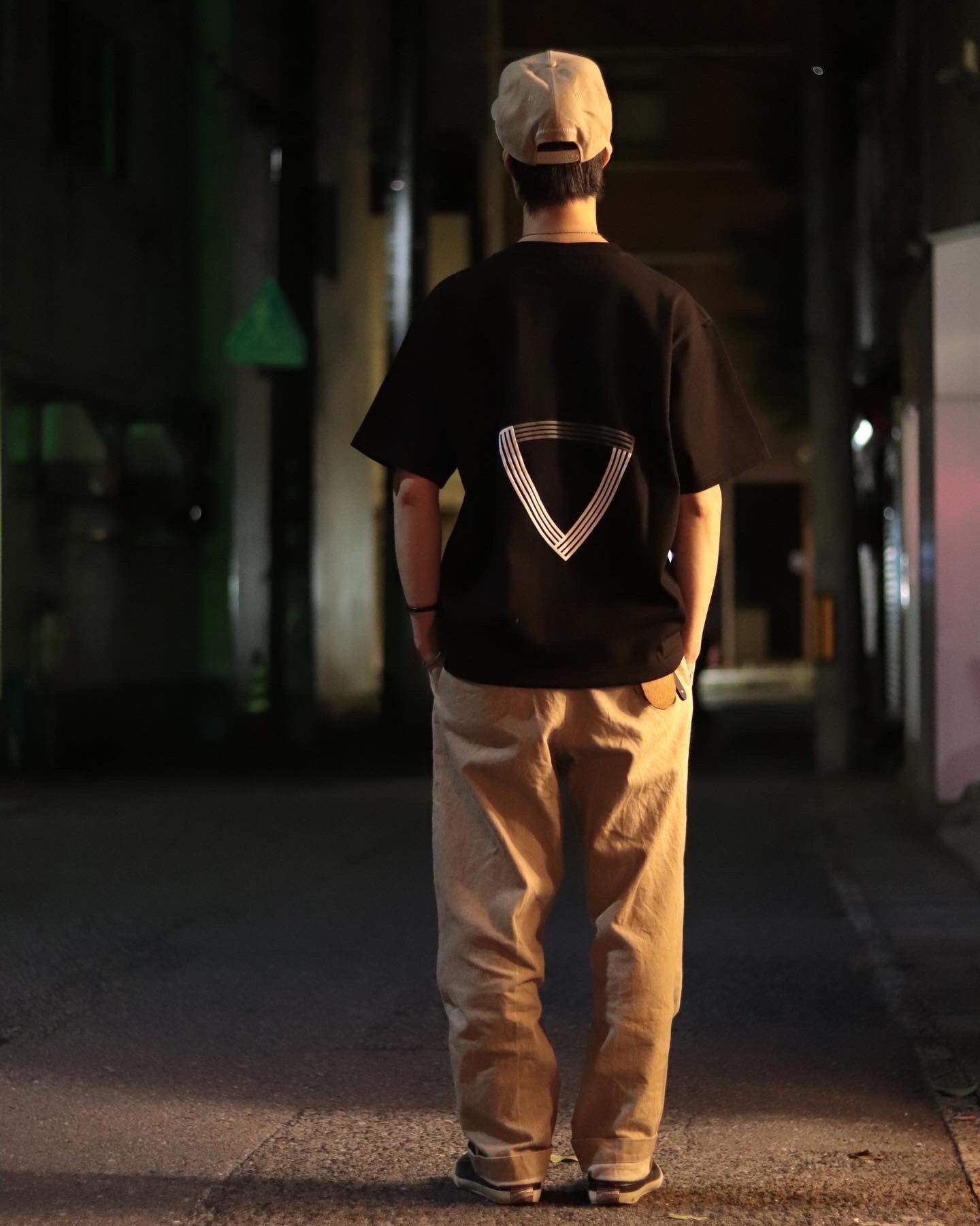背面にはアナクロロゴが大きく配置し、天部分のプリント色をボディと同色にすることで、「V」とも認識できるデザインに。
