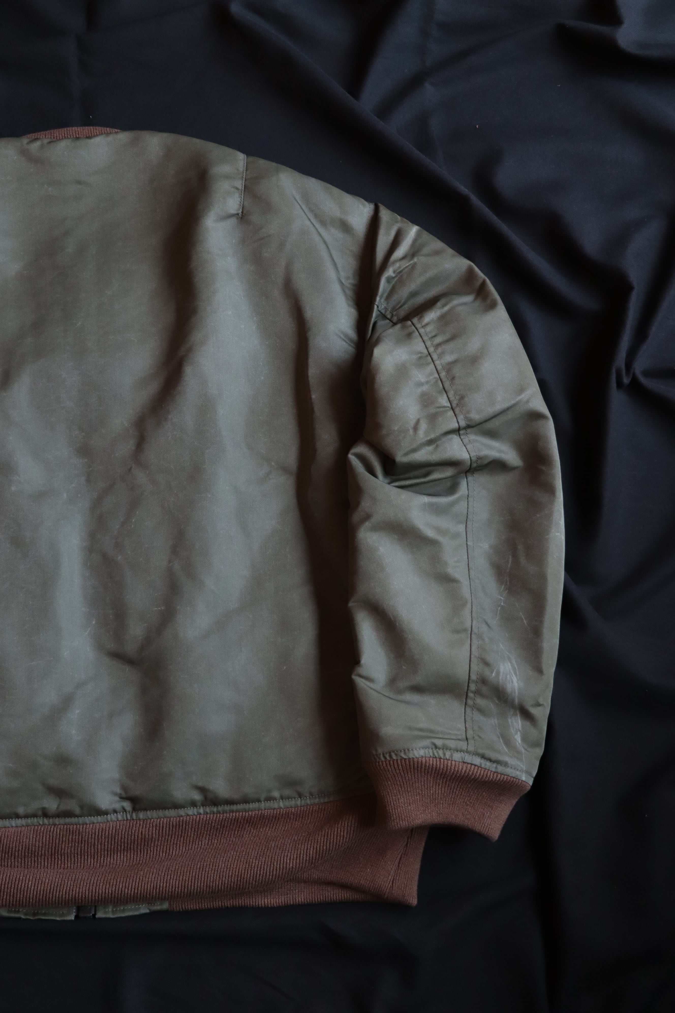 表面のナイロン生地には長年着古したようなユーズド加工が施されています。