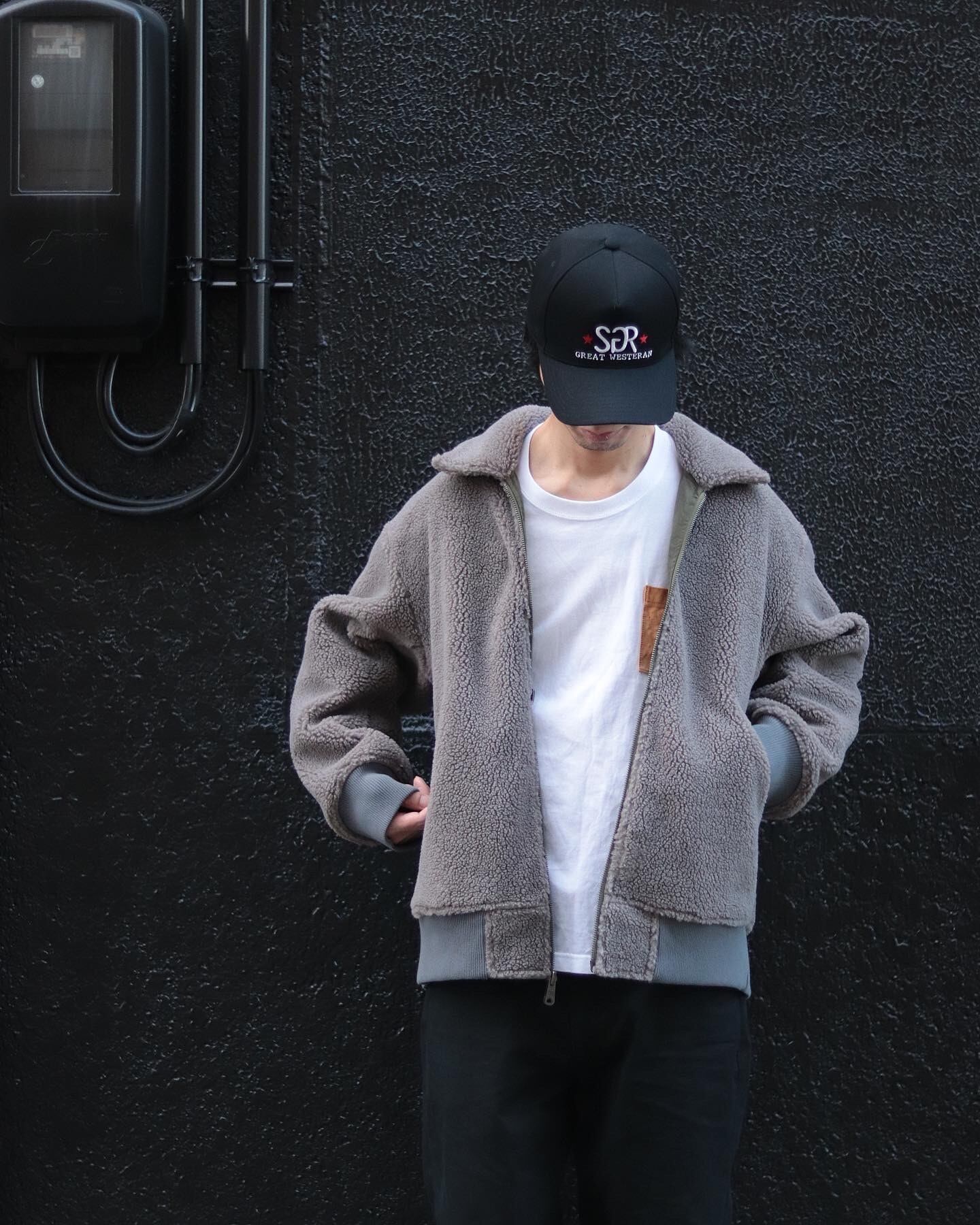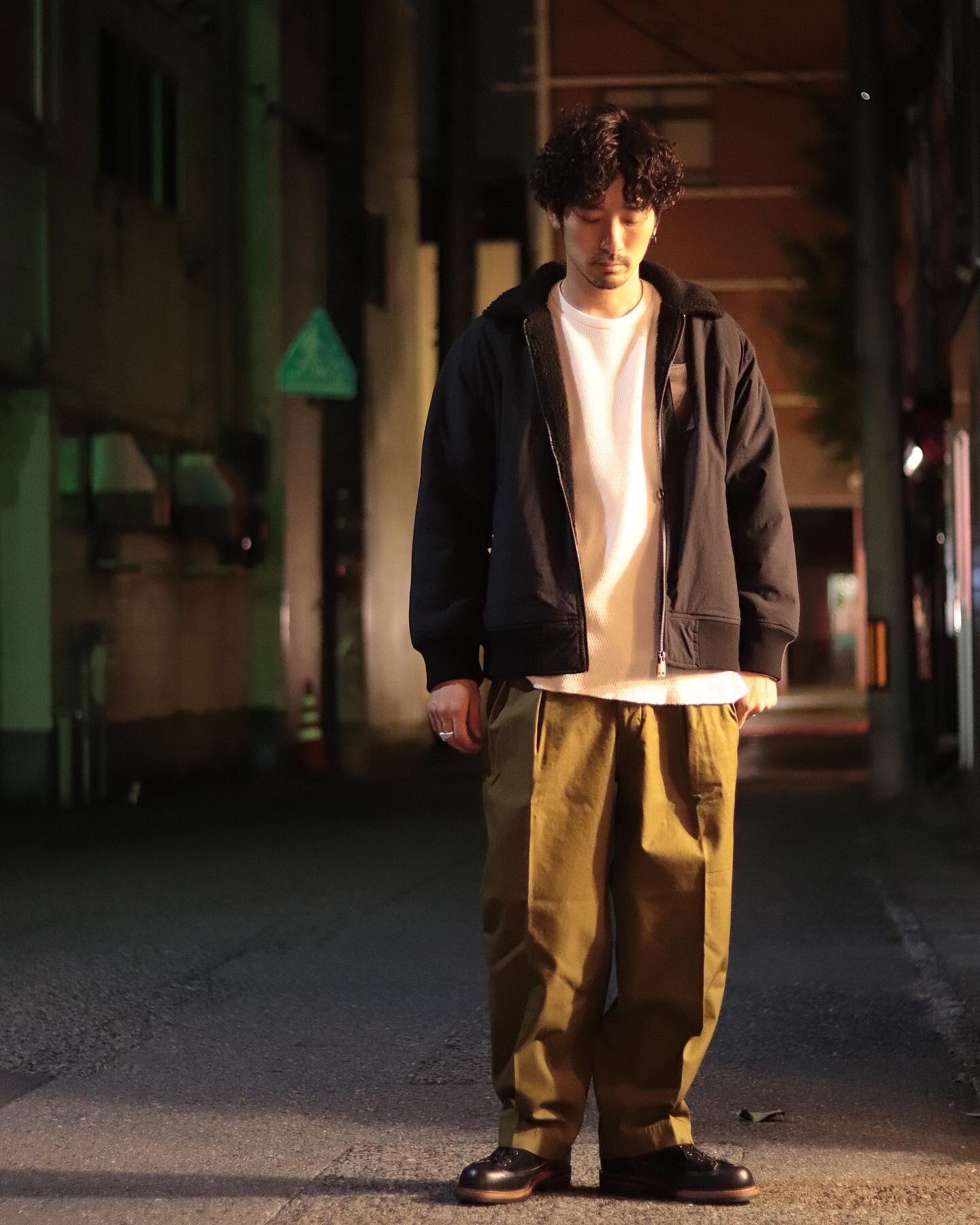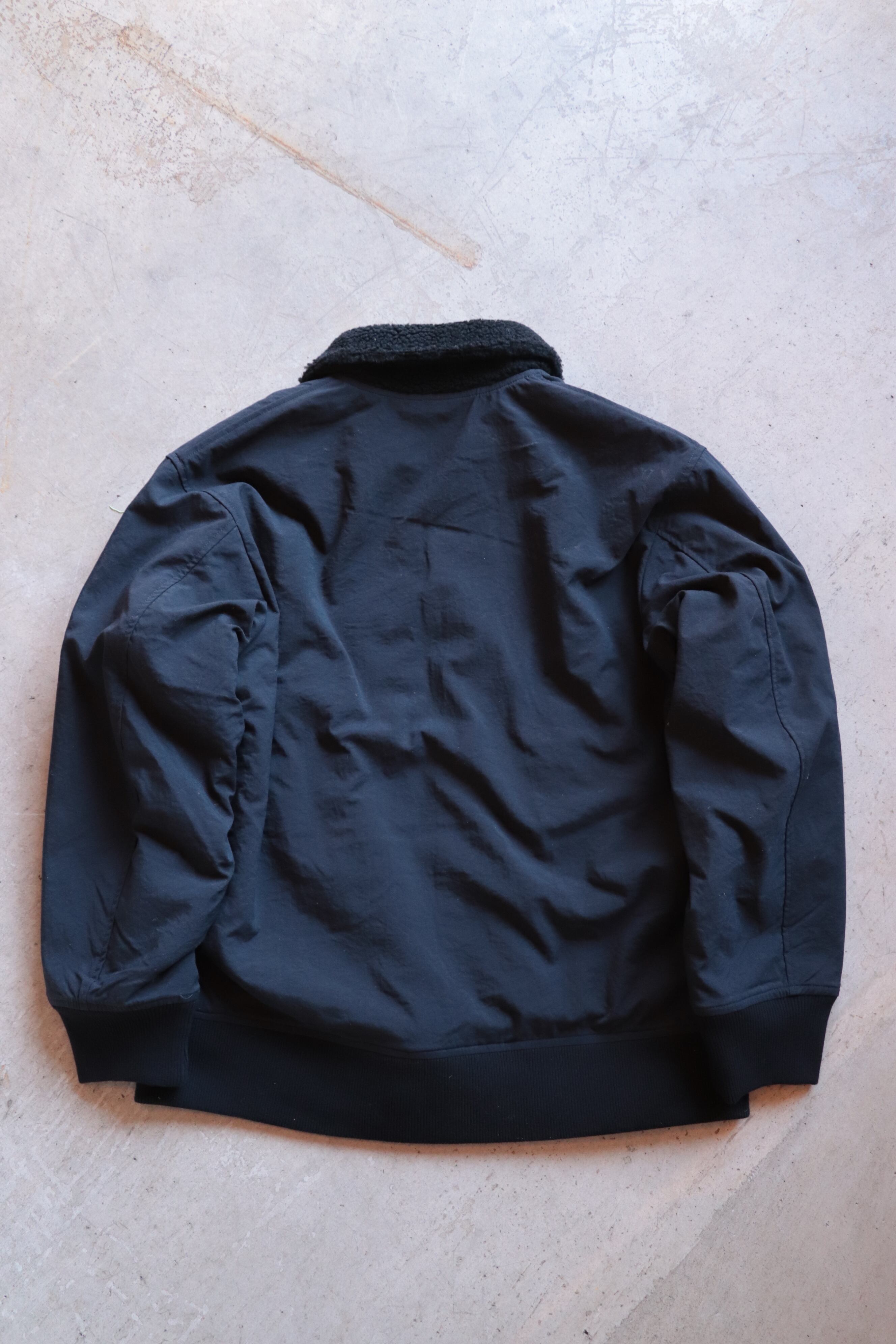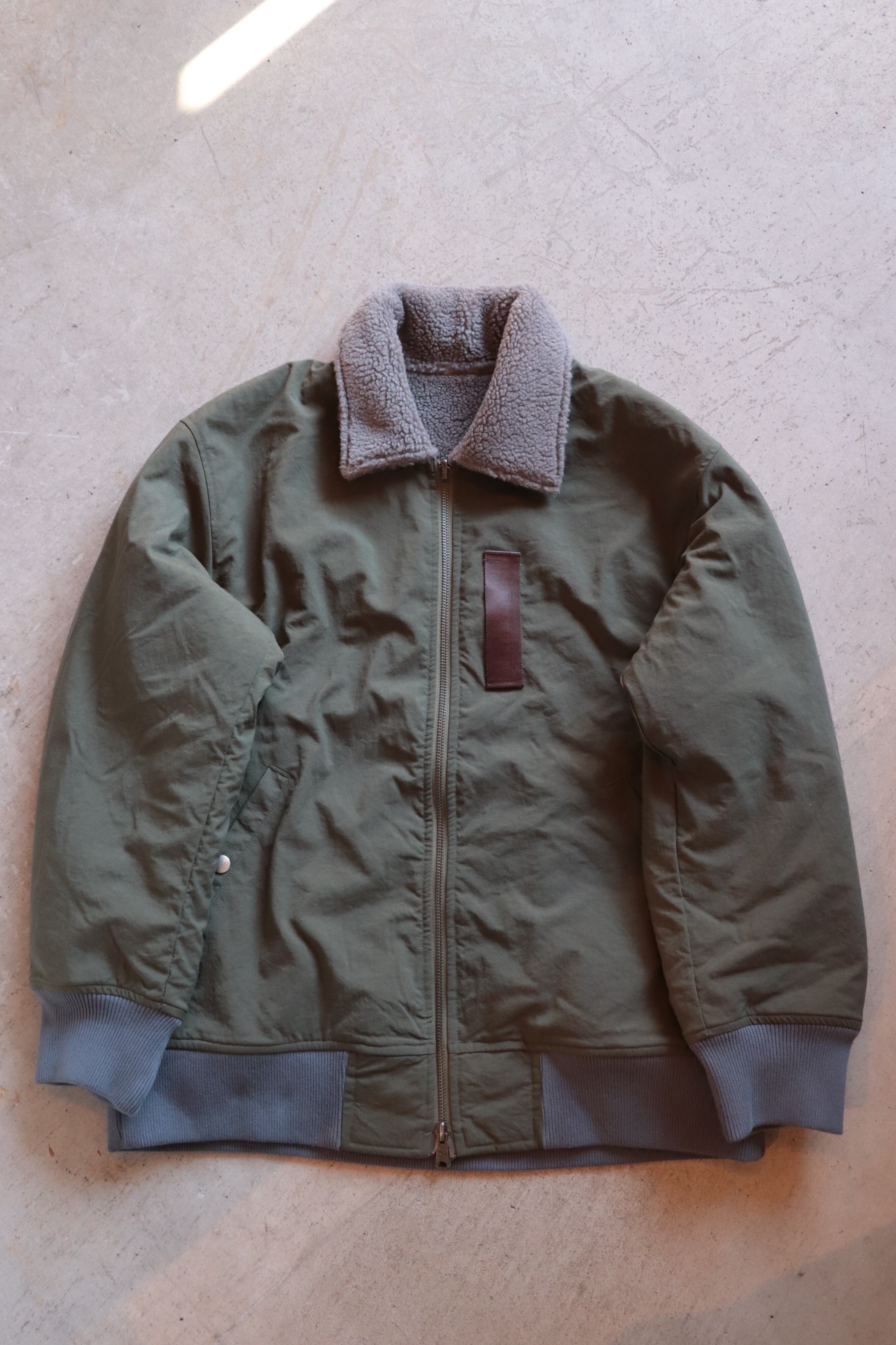 B-15Cフライトジャケットをモチーフにしており、ポケットやボアとナイロンの配色などディテールもミリタリーを意識し、男らしい雰囲気のジャケットです。