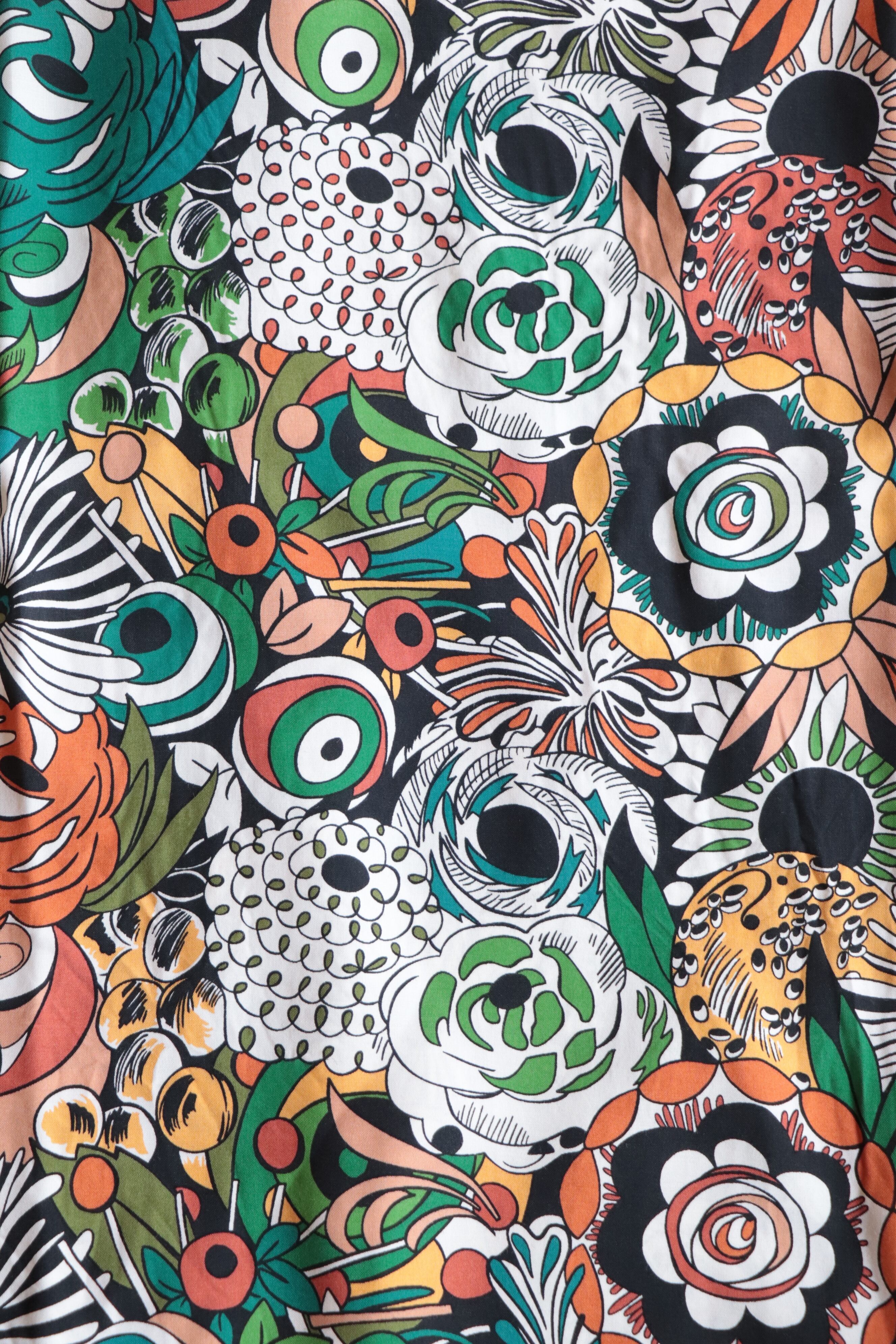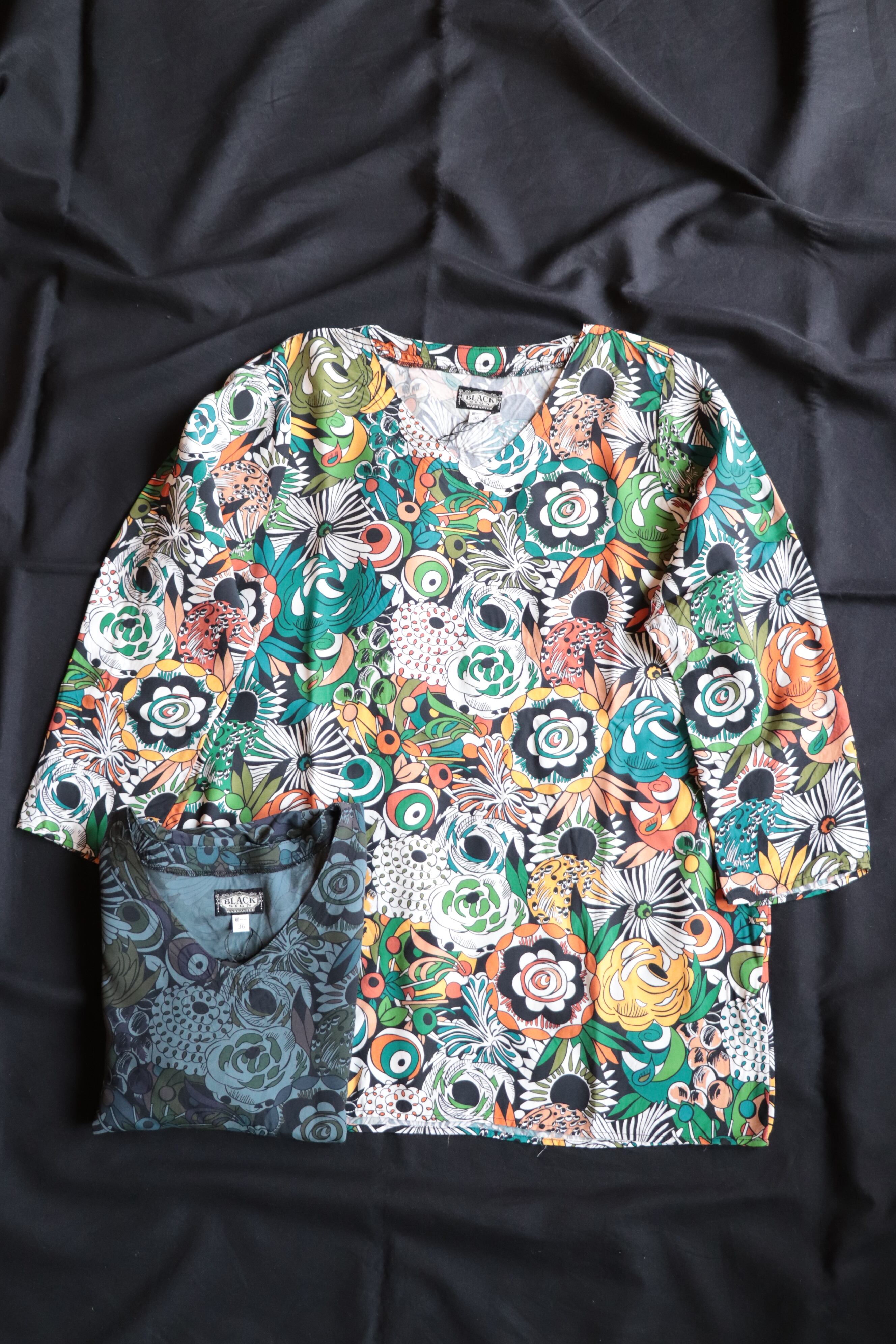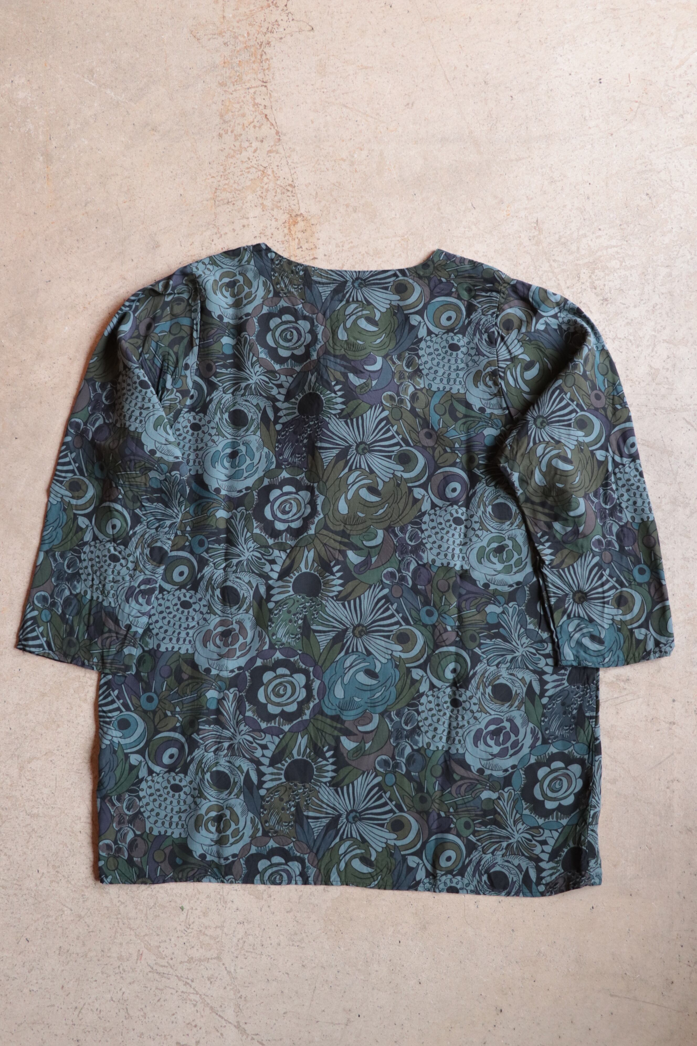 目を惹くアーティスティックな柄が最大の特徴でもある総柄生地はレーヨン・キュプラ・シルクからできた生地は非常に柔らかく滑らかな着心地です。