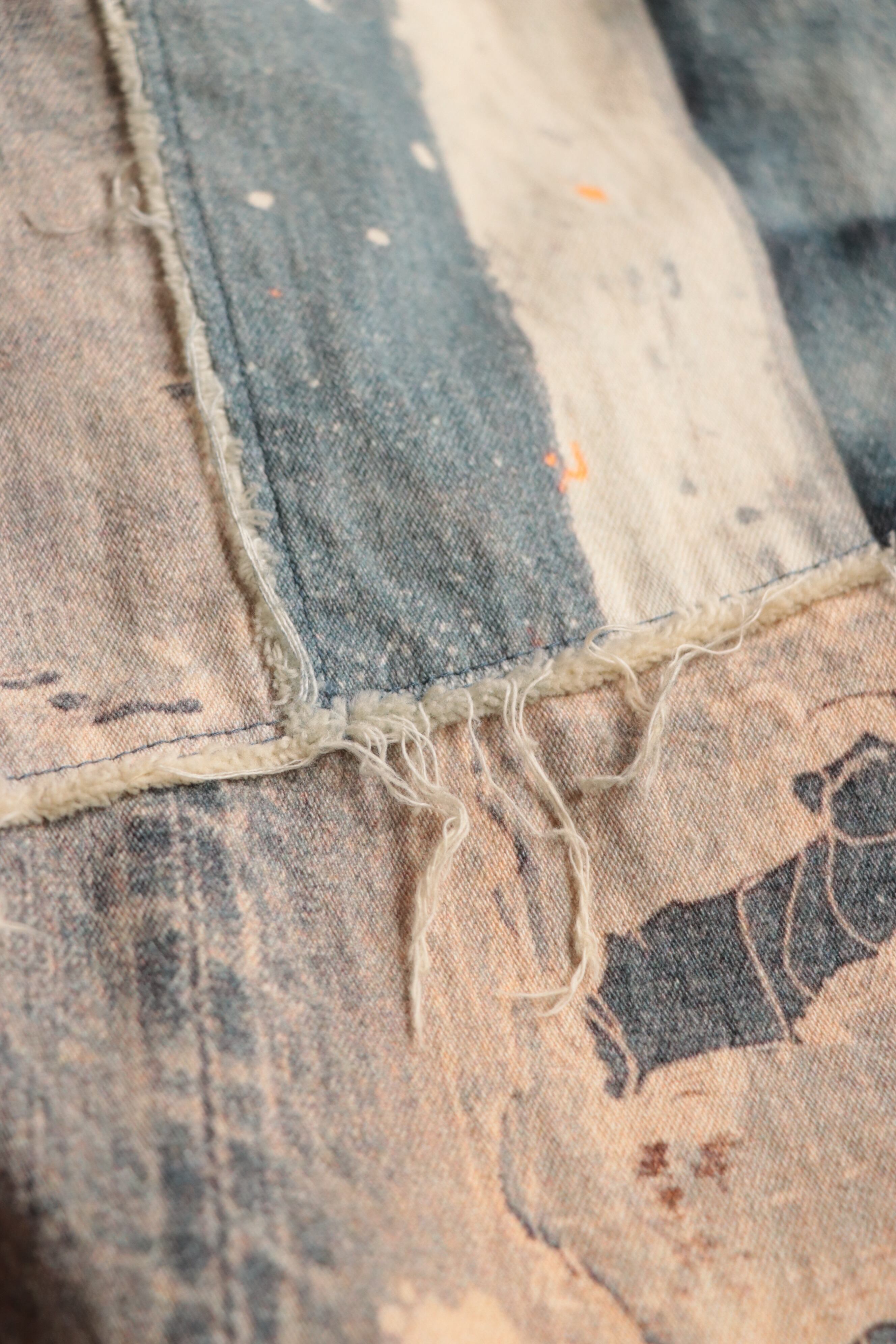 パッチワークの切り替え部分をあえて切りっぱなしにすることで、リメイクデニムらしさを表現。