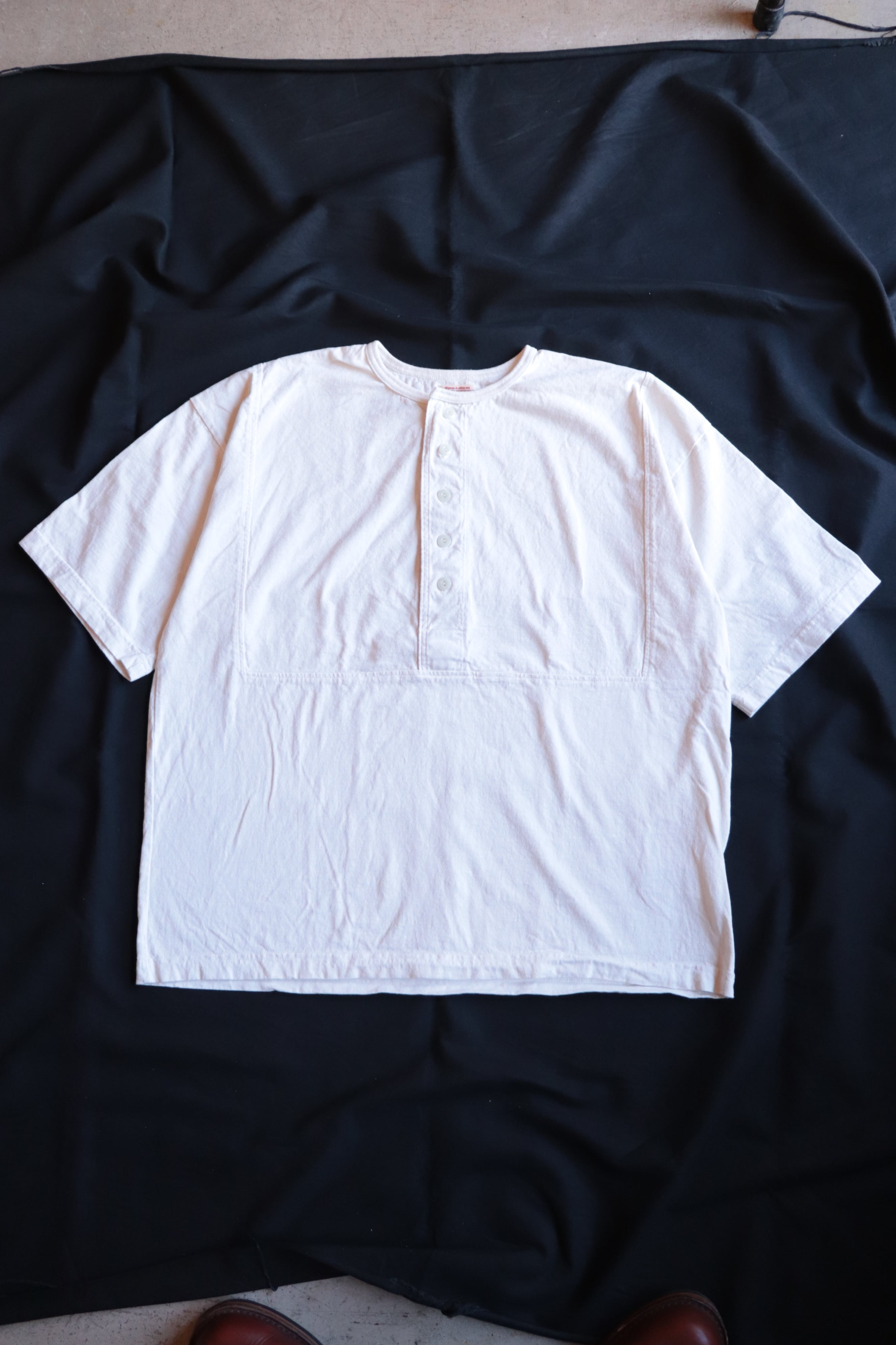 時を超え、現代でも着やすいように装飾を無くし、バギーサイズのヘンリーネックTシャツとして再構築されました。