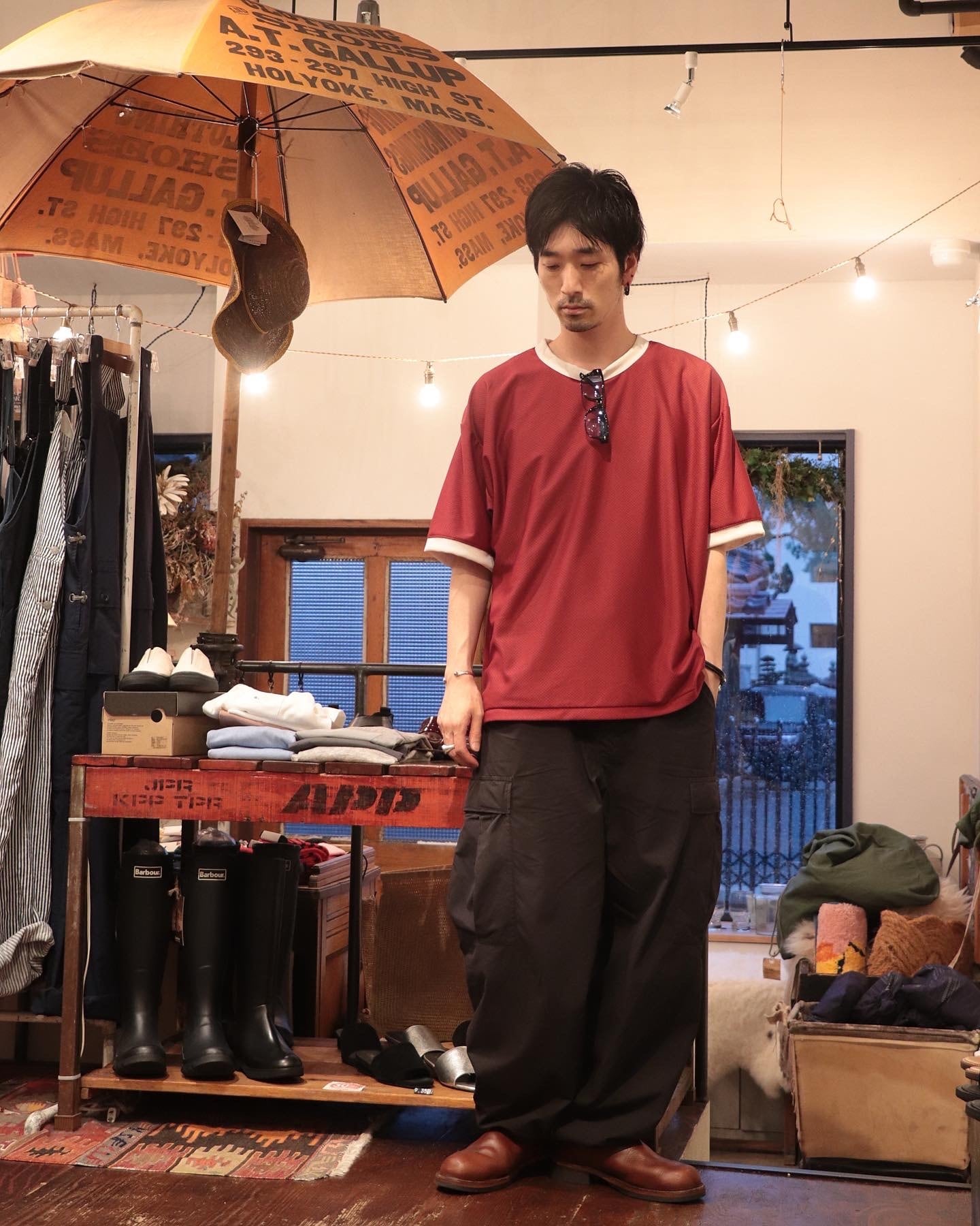 首周りと袖口を切り替えたリンガー TEE がデザインベースの為、軽装になる季節のシンプルなコーディ ネートに程良いアクセントを加えることができます。