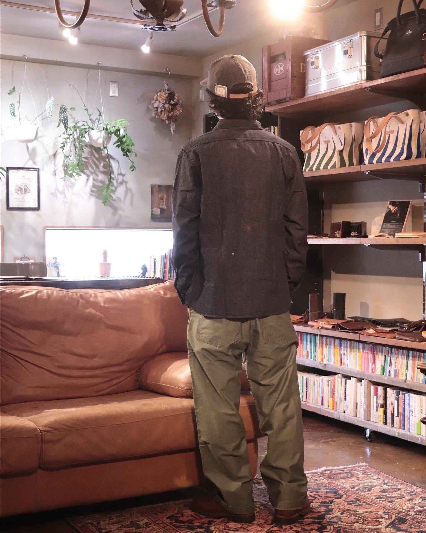 素材は8ozセルビッチデニム。ロープ染色のような色落ちではなく、糸の芯まで染まり切ったその生地は色を残したまま、夜が更けるかの如く朽ちて行くのです。