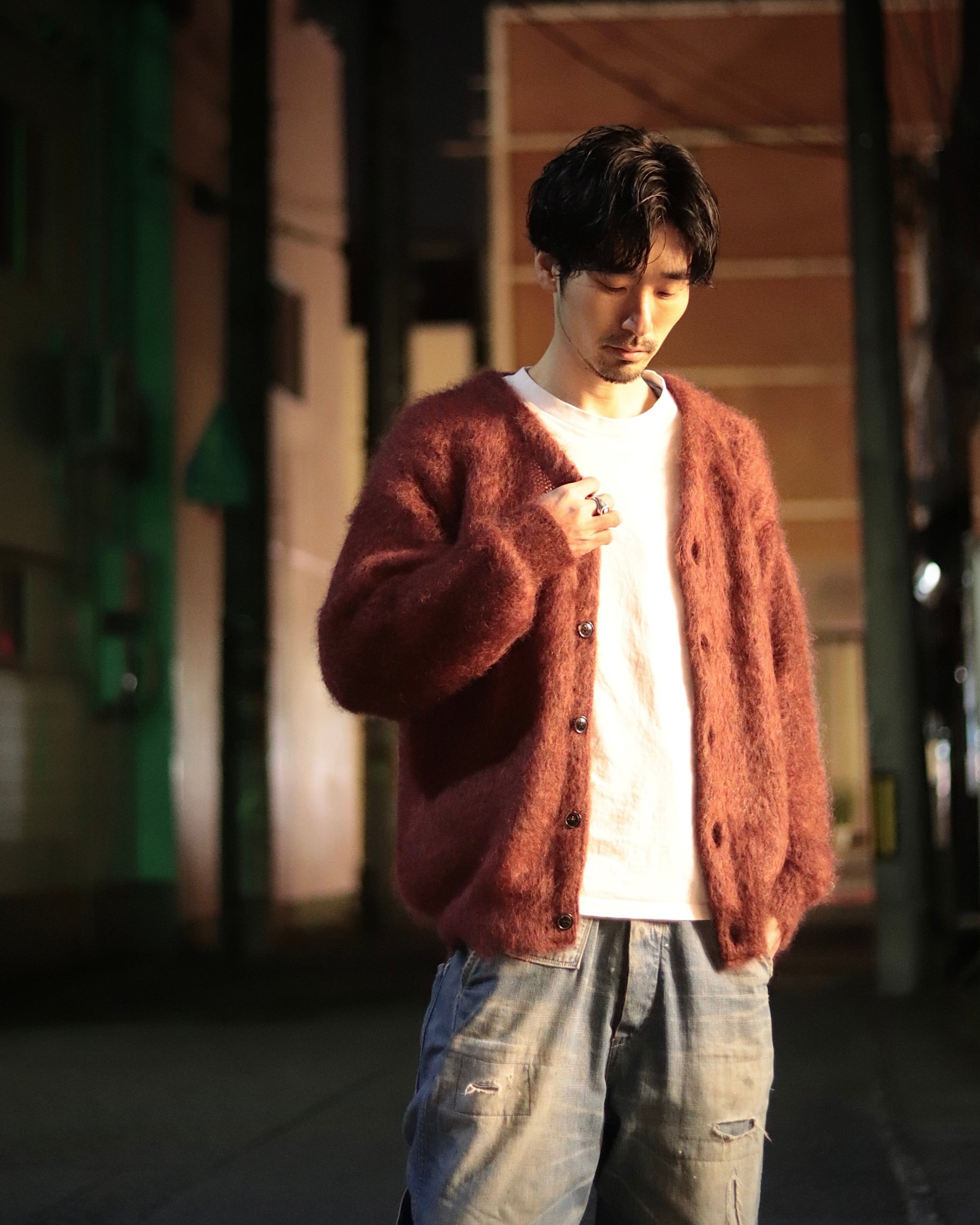 バーガンディーの絶妙な色味も相まって、とても雰囲気のいいモヘアカーディガンに仕上がっております。