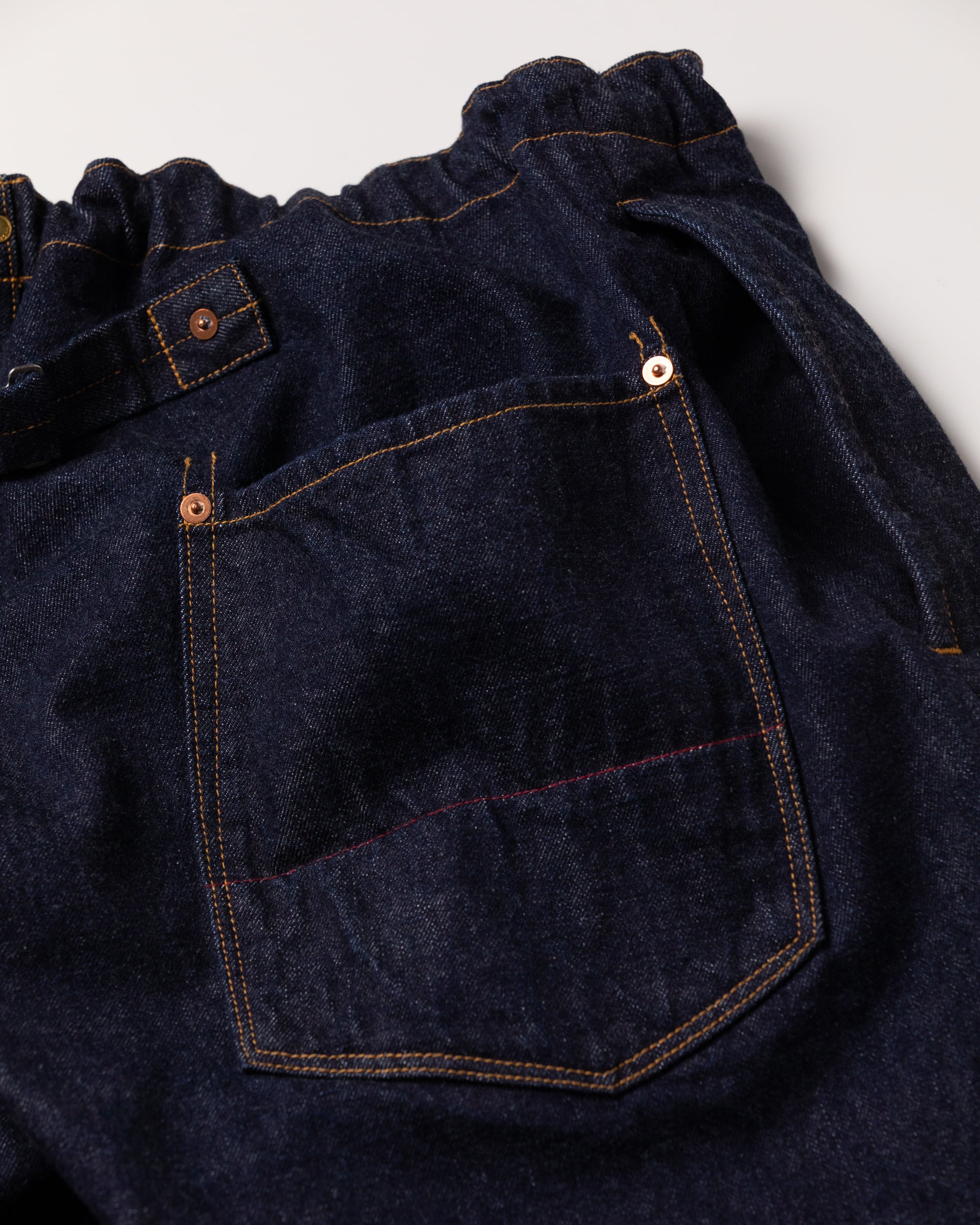 ウエスト部のキャンバステープを絞ることで腰回りにふんわりとしたシルエットが出るデニムイージーパンツ。