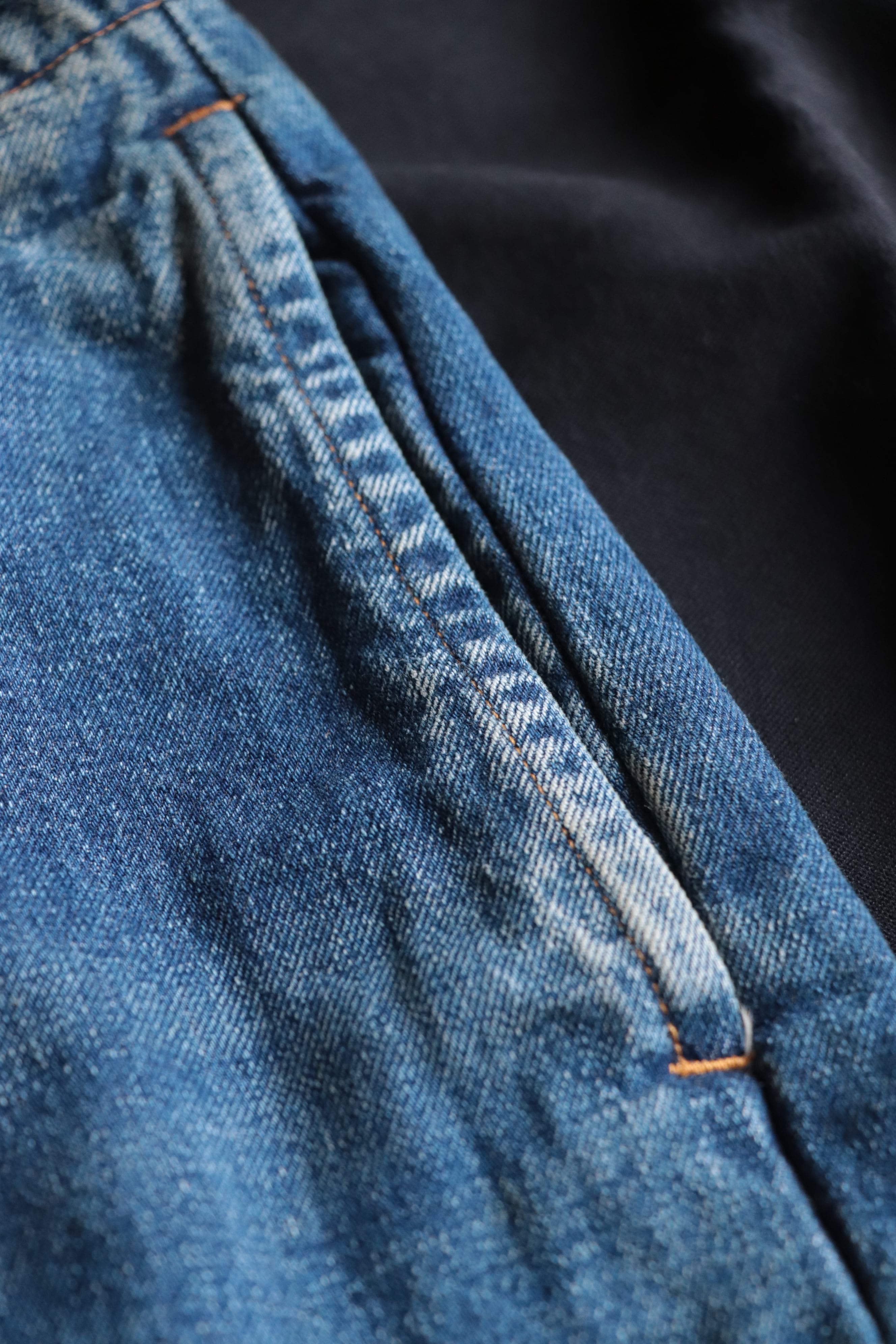 インディゴを均一に染めるのではなく、わざとムラになるように染色しており、色落ち後に筋のように見える部分を再現しております。