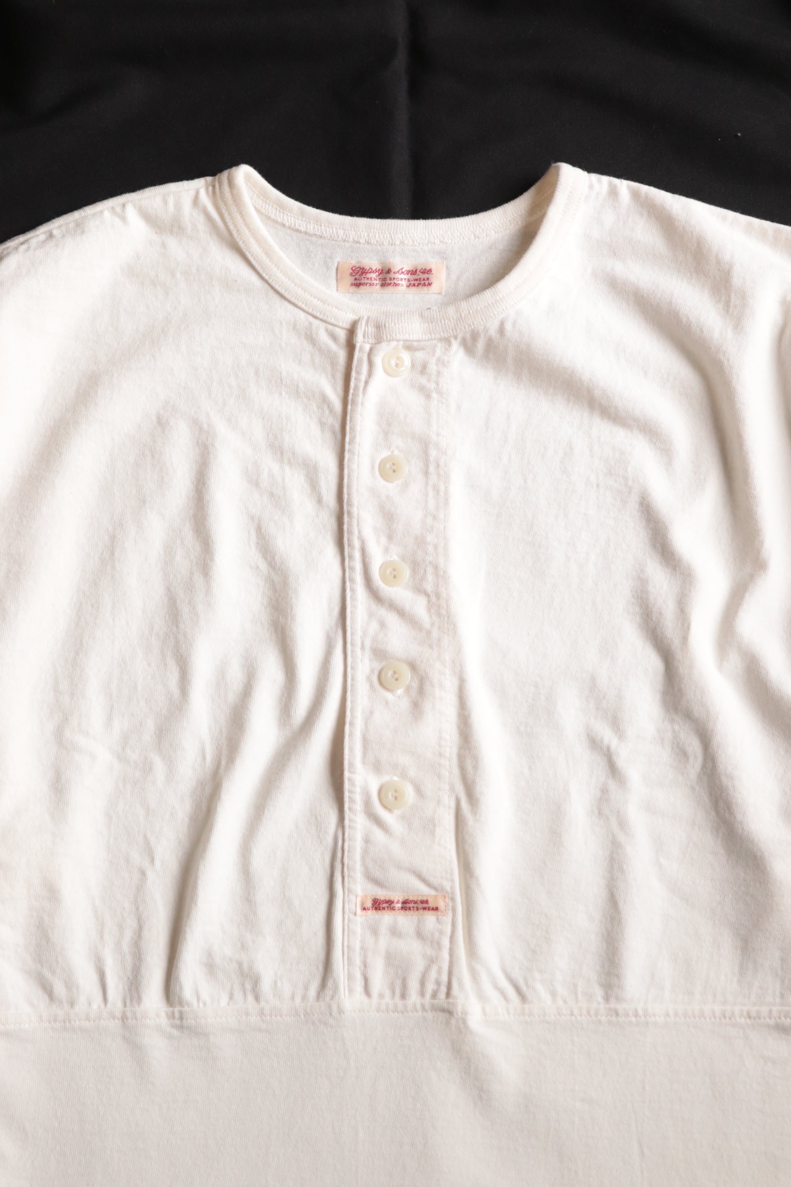時を超え、現代でも着やすいように装飾を無くし、バギーサイズのヘンリーネックTシャツとして再構築されました。