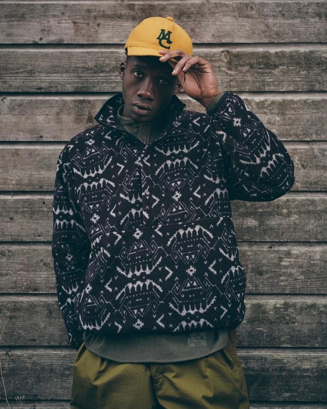 スタンドカラーのフロントスナップアノラックにオルテガ調のジャガードフリースをインストール。