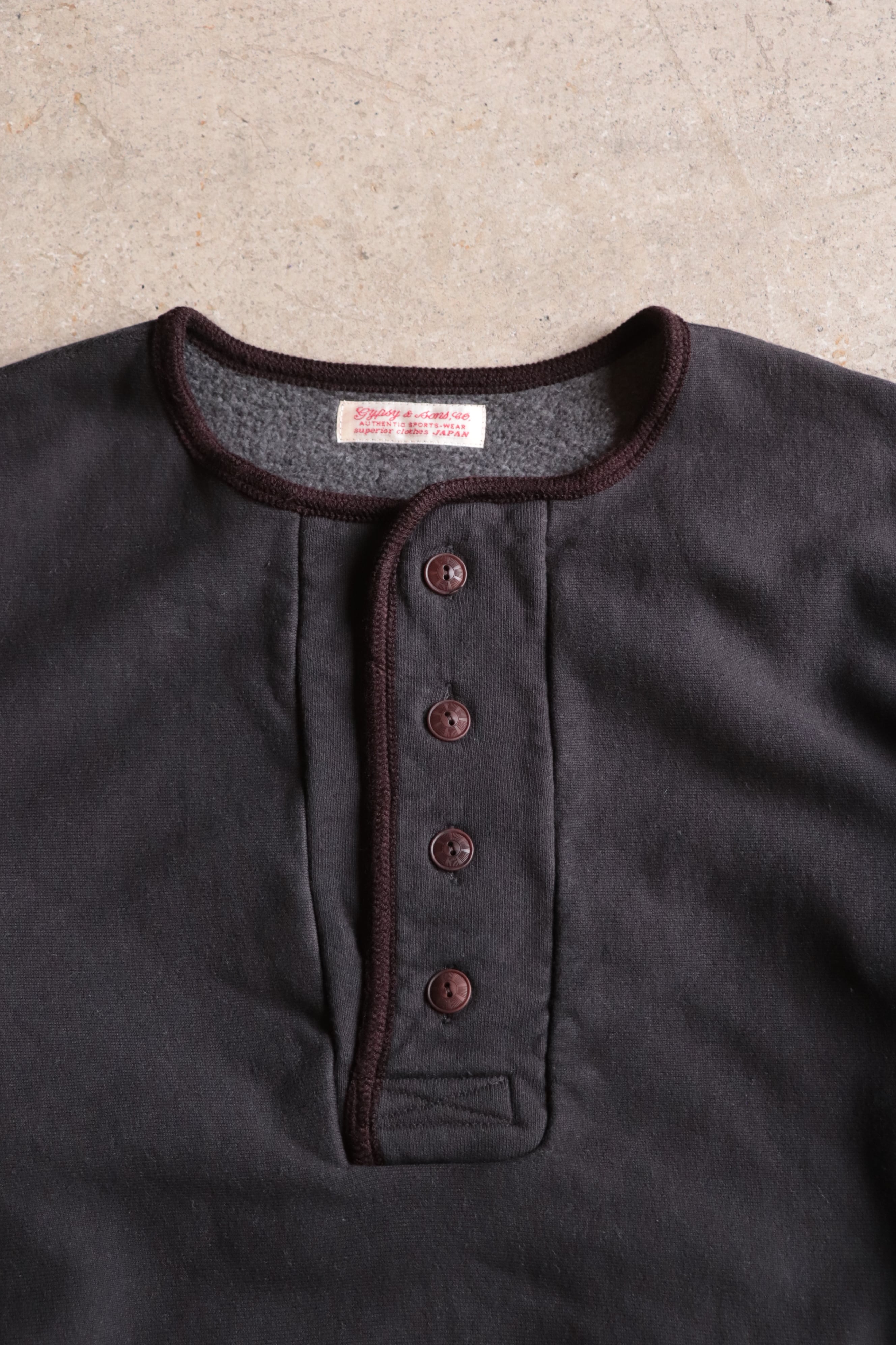 1960年代頃に数を見る、ツートンヘンリーネックスウェットをイメージソースに堅苦しくない曲線の縫いの前立てと太巻きのバインダーネックがアイコニックな1着です。