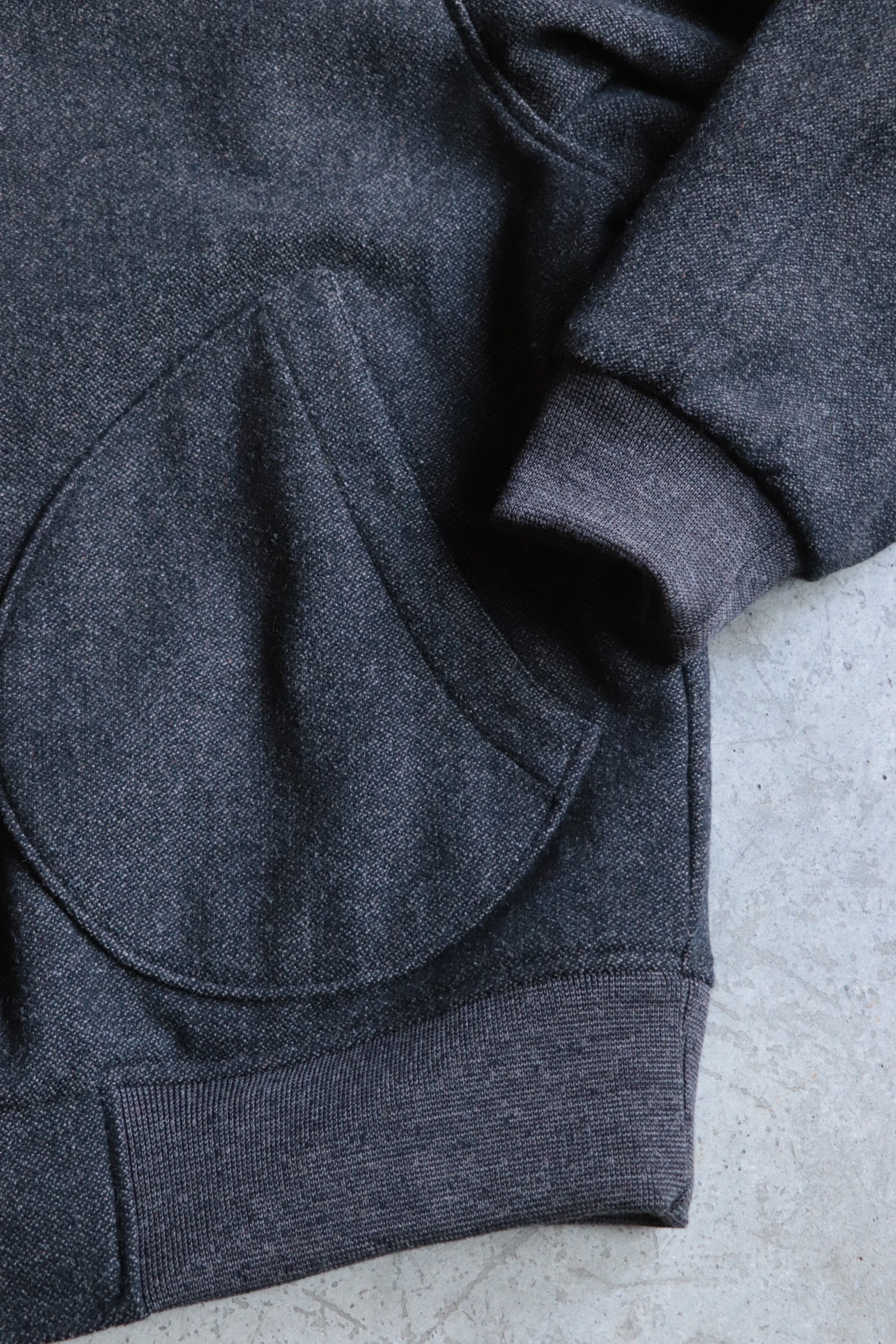 首元、袖口、裾のリブは乾燥感があり粗野な表情が特徴のアクリルウール素材を採用。